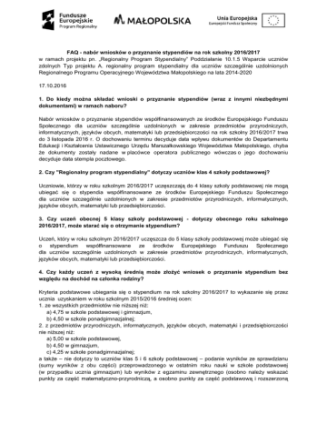 FAQ - nabór wniosków o przyznanie stypendiów stypendi na rok szkolny 2016/2017 w ramach projektu pn. „Regionalny Program Stypendialny” Poddziałanie 10.1.5 10.1.5 Wsparcie uczniów zdolnych Typ projektu A. regionalny program stypendialny dla uczniów szczególnie uzdolnionych Regionalnego Programu Operacyjnego Województwa Małopolskiego na lata 2014-2020 2014 17.10.2016 1. Do kiedy można składać ć wnioski o przyznanie stypendiów (wraz z innymi niezb niezbędnymi dokumentami) w ramach naboru? Nabór wniosków o przyznanie stypendiów stype współfinansowanych ze środków rodków Europejskiego Funduszu Społecznego dla uczniów szczególnie uzdolnionych w zakresie przedmiotów przyrodniczych, informatycznych, języków zyków obcych, matematyki lub przedsiębiorczości przedsi na rok szkolny 2016/2017 trwa do 3 listopada 2016 r. O dochowaniu terminu decyduje data wpływu dokumentów do Departamentu Edukacji i Kształcenia Ustawicznego Urzędu du Marszałkowskiego Województwa Małopolskiego, Małopolskiego chyba że e dokumenty zostały nadane w placówce operatora publicznego wówczas o jego dochowaniu decyduje ecyduje data stempla pocztowego. pocztowego 2. Czy "Regionalny program stypendialny" stypen dotyczy uczniów klas 4 szkoły podstawowej? Uczniowie,, którzy w roku szkolnym 2016/2017 uczęszczają ucz do 4 klasy szkoły podstawowej nie mogą ubiegać się o stypendia współfinansowane ze środków rodków Europejskiego Funduszu Społecznego dla uczniów szczególnie uzdolnionych w zakresie przedmiotów przyrodniczych, informatycznych, języków zyków obcych, matematyki lub przedsiębiorczości. przedsi 3. Czy uczeń obecnej 5 klasy szkoły podstawowej - dotyczy obecnego roku szkolnego 2016/2017, może starać ć się ę o otrzymanie stypendium? Uczeń,, który w roku szkolnym 2016/2017 ucz uczęszcza szcza do 5 klasy szkoły podstawowej może mo ubiegać się o stypendium współfinansowane ze środków rodków Europejskiego Funduszu Społecznego dla uczniów szczególnie uzdolnionych w zakresie przedmiotów przyrodniczych, informatycznych, języków zyków obcych, matematyki lub przedsiębiorczości. przedsi 4. Czy każdy uczeń z wysoką ś średnią może złożyć wniosek o przyznanie stypendium bez względu du na dochód na członka rodziny? Kryteria podstawowe ubiegania się o stypendium na rok szkolny 2016/2017 to wykazanie się si przez ucznia uzyskaniem w roku szkolnym 2015/2016 średniej ocen: 1. ze wszystkich przedmiotów nie niższej ni niż: a) 4,75 w szkole podstawowej i gimnazjum, b) 4,50 w szkole ponadgimnazjalnej; ponadgimnazjalnej 2. z przedmiotów przyrodniczych, informatycznych, języków j zyków obcych, matematyki i przedsi przedsiębiorczości nie niższej niż: a) 5,00 w szkole podstawowej, b) 4,50 w gimnazjum, c) 4,25 w szkole ponadgimnazjalnej; ponadgimnazjalnej a także – nie dotyczy to uczniów klas 5 i 6 szkoły podstawowej – podanie wyników ze sprawdzianu (sumy wyników z obu części) ęści) przeprowadzonego w ostatnim roku nauki w szkole szko podstawowej (w przypadku ucznia gimnazjum) lub wyników z egzaminu zewnętrznego (osobno osobno należy nale wskazać punkty za część matematyczno--przyrodniczą, a osobno punkty za część ęść podstawow podstawową i rozszerzoną z nowożytnego języka obcego) przeprowadzonego w ostatnim roku nauki w gimnazjum (w przypadku ucznia szkoły ponadgimnazjalnej). Pozostałe kryteria, w tym również dochód na członka rodziny, mają charakter dodatkowy i ich spełnienie nie jest obligatoryjne. 5. Czy są wytyczne co powinien zawierać Indywidualny Program Rozwoju ucznia dla uczniów danych etapów edukacyjnych i w zakresie rozwoju uzdolnień z przedmiotów przyrodniczych, informatycznych, języków obcych, matematyki i przedsiębiorczości? Czy IPR ucznia może odnosić się do rozwoju zainteresowań/uzdolnień dla więcej niż jednej dziedziny/nauki? W Części II pole A. Profil ucznia IPR można zaznaczyć co najmniej jeden zakres uzdolnień, jeśli zakreśli się 3 uzdolnienia to czy w zakresie tych 3 uzdolnień należy opracować IPR ucznia? Czy wystarczy w Części II pole B. IPR ucznia określić tylko 1 cel edukacyjny dla danego uzdolnienia? W Indywidualnym Planie Rozwoju (IPR) uczeń wraz z opiekunem dydaktycznym wspólnie określają plany edukacyjne (Część II pole A. Profil ucznia, pole B. Plan Rozwoju ucznia /cele edukacyjne/obszary rozwoju, działania i zakładane rezultaty/) oraz planowane wydatki na cele edukacyjne (Część II pole C.). IPR ucznia może odnosić się do rozwoju zainteresowań/uzdolnień ucznia dla więcej niż jednego z przedmiotów przyrodniczych, informatycznych, języków obcych nowożytnych, matematyki lub przedsiębiorczości. Jeśli w IPR zostanie zaznaczony więcej niż jeden zakres uzdolnień nie oznacza to, że IPR ucznia musi być opracowany dla każdego z zaznaczonych zakresów uzdolnień. Przez „plan edukacyjny” rozumie się określenie celu edukacyjnego, działania i rezultatu w możliwie prosty do weryfikacji sposób. Wobec powyższego uczeń wraz z opiekunem dydaktycznym zobowiązani są do określenia co najmniej dwóch „planów edukacyjnych” rozumianych jako co najmniej dwa cele, dwa działania i dwa rezultaty, przy czym rekomenduje się wskazanie więcej niż dwóch planów edukacyjnych. Przykładowe cele, działania i rezultaty: - cel: udział w konkursie/turnieju/olimpiadzie (nazwa, termin), rezultat: dostanie się do kolejnego etapu lub uzyskanie tytułu finalisty konkursu//turnieju/olimpiady w roku szkolnym 2016/2017 potwierdzone dyplomem/zaświadczeniem organizatora - cel i rezultat: uzyskanie certyfikatu np. z języka obcego (jakiego?) w roku szkolnym 2016/2017 - cel: podniesienie oceny lub utrzymanie dotychczasowej oceny z wybranego przedmiotu, rezultat: ocena np. celująca na świadectwie na zakończenie roku szkolnego 2016/2017 - cel: opracowanie określonego tematu, zgłębienie dodatkowej literatury na wybrany temat