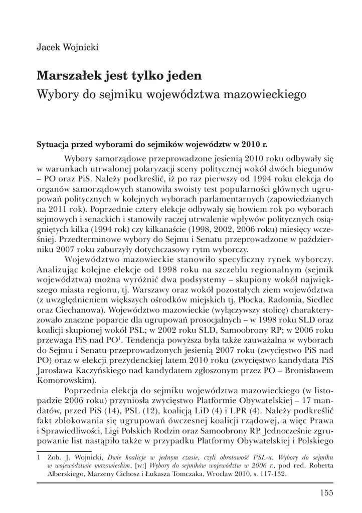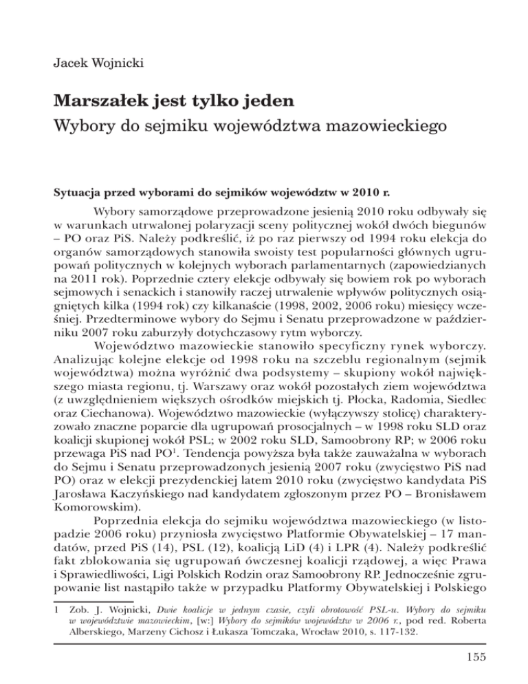 Jacek Wojnicki Marszałek jest tylko jeden Wybory do sejmiku województwa mazowieckiego Sytuacja przed wyborami do sejmików województw w 2010 r. Wybory samorządowe przeprowadzone jesienią 2010 roku odbywały się w warunkach utrwalonej polaryzacji sceny politycznej wokół dwóch biegunów – PO oraz PiS. Należy podkreślić, iż po raz pierwszy od 1994 roku elekcja do organów samorządowych stanowiła swoisty test popularności głównych ugrupowań politycznych w kolejnych wyborach parlamentarnych (zapowiedzianych na 2011 rok). Poprzednie cztery elekcje odbywały się bowiem rok po wyborach sejmowych i senackich i stanowiły raczej utrwalenie wpływów politycznych osiągniętych kilka (1994 rok) czy kilkanaście (1998, 2002, 2006 roku) miesięcy wcześniej. Przedterminowe wybory do Sejmu i Senatu przeprowadzone w październiku 2007 roku zaburzyły dotychczasowy rytm wyborczy. Województwo mazowieckie stanowiło specyficzny rynek wyborczy. Analizując kolejne elekcje od 1998 roku na szczeblu regionalnym (sejmik województwa) można wyróżnić dwa podsystemy – skupiony wokół największego miasta regionu, tj. Warszawy oraz wokół pozostałych ziem województwa (z uwzględnieniem większych ośrodków miejskich tj. Płocka, Radomia, Siedlec oraz Ciechanowa). Województwo mazowieckie (wyłączywszy stolicę) charakteryzowało znaczne poparcie dla ugrupowań prosocjalnych – w 1998 roku SLD oraz koalicji skupionej wokół PSL; w 2002 roku SLD, Samoobrony RP; w 2006 roku przewaga PiS nad PO1. Tendencja powyższa była także zauważalna w wyborach do Sejmu i Senatu przeprowadzonych jesienią 2007 roku (zwycięstwo PiS nad PO) oraz w elekcji prezydenckiej latem 2010 roku (zwycięstwo kandydata PiS Jarosława Kaczyńskiego nad kandydatem zgłoszonym przez PO – Bronisławem Komorowskim). Poprzednia elekcja do sejmiku województwa mazowieckiego (w listopadzie 2006 roku) przyniosła zwycięstwo Platformie Obywatelskiej – 17 mandatów, przed PiS (14), PSL (12), koalicją LiD (4) i LPR (4). Należy podkreślić fakt zblokowania się ugrupowań ówczesnej koalicji rządowej, a więc Prawa i Sprawiedliwości, Ligi Polskich Rodzin oraz Samoobrony RP. Jednocześnie zgrupowanie list nastąpiło także w przypadku Platformy Obywatelskiej i Polskiego 1 Zob. J. Wojnicki, Dwie koalicje w jednym czasie, czyli obrotowość PSL-u. Wybory do sejmiku w województwie mazowieckim, [w:] Wybory do sejmików województw w 2006 r., pod red. Roberta Alberskiego, Marzeny Cichosz i Łukasza Tomczaka, Wrocław 2010, s. 117-132. 155 Jacek Wojnicki Stronnictwa Ludowego, co traktowano jako test przed ewentualną przyszłą koalicją rządową. W porównaniu z wyborami samorządowymi w 2002 roku należy podkreślić znaczne osłabienie wpływów lewicy postkomunistycznej – listy SLD-UP cztery lata wcześniej uzyskały 15 mandatów. Klęską zakończyły się także wybory w 2006 roku dla Samoobrony RP, która nie zdołała wprowadzić żadnego reprezentanta (w ustępującej kadencji miała ich 9). O największym sukcesie mogli mówić liderzy Platformy, która niemal potroiła liczbę swoich radnych (z 6 w 2002 roku do 17 w 2006). Dobry wynik zanotowało także, zblokowane z PO, Polskie Stronnictwo Ludowe, które zwiększyło swój stan posiadania dwukrotnie (z 6 w 2002 roku do 12 w 2006 roku). Przyrost głosów odnotował także PiS (zwiększenie liczby mandatów z 10 w 2002 roku do 14 w 2006 roku)2. Natomiast Liga Polskich Rodzin – z trudem – ale utrzymała swój stan posiadania w sejmiku mazowieckim (4 mandaty). W sejmiku ukształtowała się koalicja PO-PSL przy wsparciu radnych LPR. Zwycięska Platforma nie desygnowała kandydata na marszałka województwa, zadowalając się trzema stanowiskami w zarządzie. Marszałkiem województwa ponownie został Adam Struzik, polityk PSL, który w wyborach uzyskał najlepszy rezultat (ponad 77 tysięcy głosów). W wyborach na marszałka kandydaturę A. Struzika poparło 36 radnych (PO, PSL, LPR, LiD oraz kilku PiS), natomiast 11 było przeciw. Wicemarszałkami wybrano Jacka Kozłowskiego oraz Tomasza Siemoniaka (obaj PO), natomiast do zarządu województwa weszli także: Piotr Szpendatowicz (PO) oraz Waldemar Roszkiewicz (LPR). Przewodniczącym sejmiku został Robert Soszyński z Platformy Obywatelskiej. Jego zastępcami zostali dwaj politycy PSL oraz jeden z LiD. Reprezentant PiS nie znalazł się w prezydium sejmiku3. W trakcie kadencji nie doszło do zmiany koalicji samorządowej, ale zmieniał się skład zarządu województwa. Obaj wicemarszałkowie: Tomasz Siemoniak i Jacek Kozłowski sprawowali swoje funkcje zaledwie rok. W listopadzie 2007 roku pierwszy został mianowany sekretarzem stanu w MSWiA, natomiast drugi wojewodą mazowieckim. Po opuszczeniu stanowisk marszałkowskich zostali zastąpieni przez dwóch radnych wojewódzkich PO: Stefana Kotlewskiego oraz Ludwika Rakowskiego. Skład klubu radnych PO nie uległ poważniejszym zmianom. W wyborach parlamentarnych w 2007 roku brało udział 14 radnych, ale zaledwie dwóch uzyskało mandaty poselski – Jacek Kozaczyński oraz Czesław Czechyra. Oprócz tego jeden z radnych wybrany z listy PO stał się radnym niezależnym. Natomiast w trakcie kadencji do klubu PO przystąpiła dwójka radnych wybranych z list Prawa i Sprawiedliwości.4 2 PiS zyskało na klęsce koalicjantów, „Rzeczpospolita”, 17 listopada 2006. 3 Władze Mazowsza bez PiS, „Rzeczpospolita”, 25 listopada 2006. 4 J. Flis, Platforma Obywatelska w samorządzie wojewódzkim, [w:] Platforma Obywatelska, pod red. Marka Migalskiego, Warszawa 2009, s. 107 i nast. 156 Marszałek jest tylko jeden. Wybory do sejmiku województwa mazowieckiego Kampania wyborcza w 2010 r. W wyborach do sejmiku mazowieckiego w 2010 r. – podobnie jak w poprzednich – wyznaczono siedem okręgów wyborczych, z czego trzy na terenie miasta stołecznego Warszawy: nr 1, nr 2 oraz nr 3. W okręgu nr 1 uprawnionych do głosowania było 407 874 wyborców, w nr 2