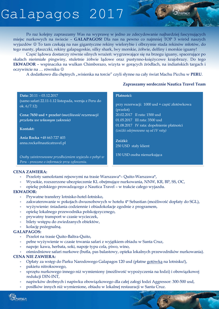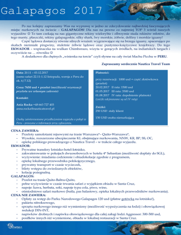 Galapagos 2017 Po raz kolejny zapraszamy Was na wyprawę w jedno ze zdecydowanie najbardziej fascynujących miejsc nurkowych na świecie – GALAPAGOS! Dla nas na pewno co najmniej TOP 3 wśród naszych wyjazdów To tam czekają na nas gigantyczne rekiny wielorybie i olbrzymie stada rekinów młotów, do tego manty, płaszczki, rekiny galapagoskie, silky shark, lwy morskie, żółwie, delfiny i morskie iguany! Część lądowa dostarczy równie silnych wrażeń: wygrzewające się na brzegu iguany, spacerujące po skałach nieśmiałe pingwiny, stuletnie żółwie lądowe oraz pustynno-księżycowe krajobrazy. Do tego EKWADOR – wspinaczka na wulkan Chimborazo, wizyta w gorących źródłach, na indiańskich targach i oczywiście na … równiku A dodatkowo dla chętnych „wisienka na torcie” czyli słynne na cały świat Machu Picchu w PERU. Zapraszamy serdecznie Nautica Travel Team Data: 20.11 – 03.12.2017 (samo safari 22.11-1.12 listopada, wersja z Peru do ok. 6/7.12) Cena: 7650 usd + przelot (możliwość rezerwacji przelotu we własnym zakresie) Kontakt: Ania Rocka +48 663 727 403 [email protected] Osoby zainteresowane przedłużeniem wyjazdu o pobyt w Peru - proszone o informacje przy zgłoszeniu. Płatności: przy rezerwacji: 1000 usd + część złotówkowa (przelot) 20.02.2017 II rata: 1500 usd 01.05.2017 III rata: 3500 usd 01.08.2017 IV rata: dopełnienie płatności (zniżki odejmowane są od IV raty) Zniżki: 250 USD stały klient 150 USD osoba nienurkująca CENA ZAWIERA: - Przeloty samolotami rejsowymi na trasie Warszawa*– Quito-Warszawa*, - Wysokie, rozszerzone ubezpieczenie KL obejmujące nurkowania, NNW, KR, BP, SS, OC, - opiekę polskiego prowadzącego z Nautica Travel – w trakcie całego wyjazdu. EKWADOR: - Prywatne transfery lotnisko-hotel-lotnisko, - zakwaterowanie w pokojach dwuosobowych w hotelu 4* Sebastian (możliwość dopłaty do SGL), - wyżywienie: śniadania codziennie i obiadokolacje zgodnie z programem, - opiekę lokalnego przewodnika polskojęzycznego, - prywatny transport w czasie wycieczek, - bilety wstępu do zwiedzanych obiektów, - kolację pożegnalną. GALAPAGOS: - Przelot na trasie Quito-Baltra-Quito, - pełne wyżywienie w czasie trwania safari z wyjątkiem obiadu w Santa Cruz, - napoje: kawa, herbata, soki, napoje typu cola, piwo, wino, - ośmiodniowe safari nurkowe (butla, pas balastowy, opieka lokalnych przewodników nurkowania). CENA NIE ZAWIERA: - Opłaty za wstęp do Parku Narodowego Galapagos 120 usd (płatne gotówką na lotnisku!), - pakietu nitroksowego, - sprzętu nurkowego innego niż wymieniony (możliwość wypożyczenia na łodzi) i obowiązkowej redukcji DIN-INT, - napiwków drobnych i napiwku obowiązkowego dla całej załogi łodzi Aggressor: 300-500 usd, - posiłków innych niż wymienione, obiadu w lokalnej restauracji w Santa Cruz. Plan wyprawy Dzień 1 - 20.11 Wylot z Warszawy (na życzenie możliwość rezerwacji przelotu z innego miasta), przylot do Quito (2700-2850 m. npm.). Prywatny transfer do hotelu 4* Sebastian, położonego w centrum nowego Quito ( przejazd ok. 1h). Kolacja powitalna w hotelu, nocleg. Dzień 2 – 21.11 Śniadanie w hotelu. Podróż do gorących źródeł w Papallacta – ok. 2 godziny. W czasie podróży obserwowanie różnych stref wysokościowych (klimat, roślinność) – od 2400 m. npm do 4200 m. npm (droga prowadzi przez Rezerwat Ekologiczny Antisana i Park Narodowy Cayambe – Coca; przekracza się kordylierę wschodnią Andów przez przełęcz na wysokości 4200 m). Kąpiel w pięknym ośrodku w Papallacta (3300 m. n.p.m., temp. wody 3040°C), u stóp wulkanu Antisana – obserwowanie typowej dla tego regionu roślinności i kolibrów. Po południu powrót do Quito. Kolacje we własnym zakresie, możliwość zrealizowania wspólnego wyjścia do miasta lub zarezerwowania kolacji w hotelu. Nocleg w hotelu Sebastian. Dzień 3 - 22.11 Śniadanie w Hotelu. Wycieczka na wulkan Chimborazo (6310 m. npm), najwyższy wulkan w Ekwadorze i najwyższy punkt na kuli ziemskiej licząc od środka Ziemi. W pobliżu wulkanu obserwowanie wikuni w Rezerwacie Faunistycznym Chimborazo oraz roślinności typowej dla strefy paramo. Dojazd na parking (4800 m. npm) i później podejście do drugiego schroniska na 5000 m (ścieżka o łagodnym nachyleniu). Po południu podróż powrotna do Quito, po drodze wizyta na hacjendzie la Cienega z XVII w., gdzie między innymi mieszkał Alexander von Humboldt w czasie swego pobytu w Ekwadorze. Kolacja i nocleg w hotelu Sebastian. Dzień 4 - 23.11 Dzień 5 – 10 Śniadanie w Hotelu. Transfer na lotnisko w Quito, przelot na wsypę Baltra. Przywitanie przez załogę łodzi, transfer busem do Itabaca Channel, zakwaterowanie na łodzi Aggressor III. Powitanie, check dive: North East Coast of Baltra Island. Kolacja na łodzi. Safari nurkowe (opis poniżej). Pełne wyżywienie (poza kolacją ostatniego dnia). 24-29.11 Dzień 11 30.11 Dzień 12 01.12 Śniadanie na łodzi. Wyokrętowanie, przelot do Quito, transfer do hotelu. Czas wolny. Wspólne wyjście do miasta na andrzejkowy wieczór i wróżby Kolacja we własnym zakresie. Nocleg w hotelu Sebastián. Śniadanie w Hotelu. Zwiedzanie nowej części miasta (pomnik Francisco de Orellana, droga konkwistadorów, obserwowanie panoramy Guapulo (kościół z XVI w.) i dolin w pobliżu Quito, parki El Ejido i Alameda, Dom Kultury Ekwadorskiej, Bazylika i inne) i kolonialnej części miasta (Plaza Grande, Pałac Prezydencki, Pałac Arcybiskupi, renesansowa Katedra z XVI wieku, renesansowy kościół i klasztor San Francisco z XVI w. (1535), barokowy kościół La Compañía z początku XVII w. (1605), oglądanie panoramy miasta z góry Panecillo). Po południu wycieczka na równik (15 km na północ od Quito, w półpustynnej dolinie San Antonio de Pichincha), zwiedzanie Muzeum Inti Ñan, gdzie można obserwować zjawiska występujące tylko na równiku oraz Quito w Miniaturze (kolonialne Quito w skali, z małym spektaklem dźwi