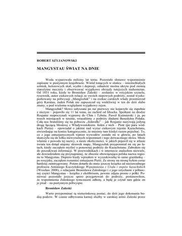 ROBERT SZYJANOWSKI MANGYSTAU ŚWIAT NA DNIE Woda wyparowała miliony lat temu. Pozostało słonawe wspomnienie zapisane w pustynnym krajobrazie. Wśród tonących w słońcu – śnieżnobiałych solnisk, kolorowych skał, wydm i depresji, odnaleźć można ukryte pod ziemią starożytne meczety i obserwować wyjątkowe obrzędy tutejszych mahometan. Od 1851 roku, kiedy to Bronisław Zaleski – zesłaniec w rosyjskim szynelu, rysownik, autor ciekawych relacji ze swoich stepowych podróży, został wyekspediowany na półwysep „Mangiszłak” i na rozkaz carskich władz przemierzał góry Karatau, żaden Polak nie zapuszczał się wnikliwiej w ten do dziś słabo znany, a pod wieloma względami wyjątkowy rejon. Mangyszłak? Słowo usłyszane po raz pierwszy nie kojarzyło się zupełnie z niczym – pojawiło się 11 lat temu, na zachód od Irkucka. Spotkani na drodze Rosjanie rozpoczynali wyprawę do Chin i Tybetu. Paweł Kuśmierski i ja, po trzech miesiącach w terenie, wracaliśmy z podróży śladami Benedykta Polaka. Całą noc brataliśmy się na poboczu „federalki” – jak Rosjanie nazywają jedyną drogę łączącą Moskwę z Władywostokiem. Jeden z nich – Piotr (po paru wódkach Pietia) – opowiadał o jakimś nad wyraz ciekawym rejonie Kazachstanu, stwierdzając na koniec kategorycznie, że musimy tam kiedyś razem pojechać. To, co z jego entuzjastycznych wprost wywodów zostało mi w głowie, po latach skurczyło się do kilku niewyraźnych wspomnień i tego dziwacznego słowa. Może właśnie z powodu tej nazwy, a może okoliczności, w jakich pojawił się w atlasie świata ten dotąd utajony skrawek mapy, Mangyszłak przypomniał mi się po latach, kiedy zacząłem myśleć o ponownej podróży do Kazachstanu. Zabrałem się do poszukiwań informacji. W przewodnikach i w internecie znalazłem niewiele, ale dowiedziałem się przynajmniej, że obecnie obowiązująca polska nazwa regionu to Mangystau. Dopiero kiedy wpisałem w wyszukiwarkę to samo grażdanką – po rosyjsku, zacząłem rozumieć entuzjazm Pietii. Ze strony na stronę byłem coraz bardziej zaintrygowany. Potem dotarła do mnie jeszcze książka od niezawodnego profesora Antoniego Kuczyńskiego Wspomnienia z Uralu i stepów kazachskich (Wrocław 2008), z relacjami Bronisława Zaleskiego i z jego sztychami z północnej części Mangystau – książka z ekslibrisem, pewnie zdjęta prosto z półki. Ponieważ pozostało jeszcze sporo przygotowań do podroży, postanowiłem, że wspomnienia Zaleskiego tymczasem odłożę, a będę je czytał tam gdzie on je pisał – na pustynnym półwyspie. Bronisław Zaleski Warto przypominać tą nietuzinkową postać, do dziś jego dokonania budzą podziw. W czasie odbywania karnej służby w carskiej armii Zaleski przez ROBERT SZYJANOWSKI 64 lata obserwował i opisywał tradycje ludów zamieszkujących stepy Kazachstanu. Podziwiał krajobrazy, poznawał stepowe zwyczaje i uwieczniał je na swoich rysunkach, w relacjach i listach. Jego ilustrowany album La vie des steppes kirghizes wydany w Paryżu w 1865 r. był dla Europejczyków przez długi czas jedynym źródłem wiedzy o Kirgiz-Kasjakach (Kazachach). Urodził się w 1819 lub 1820 roku we wsi Raczkiewicze, obecnie na Białorusi. W roku 1838 studiując na Uniwersytecie w Tartu (Estonia) został Zaleski uwięziony za działalność niepodległościową i zesłany do Czernihowa. Przebywał tam do roku 1845. Po powrocie ponownie trafił do więzienia, tym razem za swoją działalność patriotyczną w Wilnie, wcielony do carskiej armii i zesłany do Orenburga i na tereny Kazachstanu, gdzie pozostał do roku 1856. W 1851 r. uczestniczył w ekspedycji geologicznej Aleksandra Antipowa. Wraz z Tarasem Szewczenką, z którym bardzo się zaprzyjaźnił i Ludwikiem Turno poszukiwał węgla kamiennego na półwyspie Mangyszłak nad Morzem Kaspijskim. Na początku lat sześćdziesiątych przebywał w Dreźnie, Rzymie i Paryżu. Zajął się dostarczaniem broni dla ruchów niepodległościowych w Polsce i Białorusi. Zaleski był związany z kręgiem Hotelu Lambert. Był zaprzyjaźniony z Cyprianem Kamilem Norwidem i pisarzem Aleksandrem Pleszczejewem. Zmarł na gruźlicę w Mentonie (Francja). Wątek ukraiński Dotarcie samochodem ze Szczecina na Mangystau zajęło nam 9 dni. Byliśmy sami, Dorota i ja. Tak się złożyło – koledzy mieli inne plany. Z Pietią próbowałem się skontaktować, ale się nie odezwał. Przejechaliśmy przez Polskę, Ukrainę, Rosję i Kazachstan zatrzymując się po drodze na jeden dzień w Kijowie. Prawie pół roku po protestach i krwawych walkach na Majdanie, teraz ścierali się tutaj chcący uporządkowania placu mieszkańcy centrum Kijowa z wywołującymi nocne burdy zapijaczonymi „gierojami”, którzy bełkocząc o swoim często wątpliwym bohaterstwie i konieczności kontynuowania protestów, wciąż gnieździli się w majdanowych namiotach. Tysiące ludzi skrzyknęło się w sieci i przyszło na plac, żeby uprzątnąć ogromne sterty śmieci i opony, które nie zdążyły spłonąć zimą na barykadach. Na okopconym na czarno placu teraz płonęły wojskowe namioty. Z dużego plakatu zawieszonego na budynku Międzynarodowego Centrum Kultury przy ulicy Instytuckiej, tej na której zginęło kilkudziesięciu bojowników niebiańskiej sotni, na plac spoglądał Taras Szewczenko. Dziwnym trafem właśnie tego roku na Ukrainie obchodzono 200 rocznicę jego urodzin. Szewczenkę i Zaleskiego połączył wspólny zesłańczy los, romantyzm, zamiłowanie do sztuki i Mangystau, który teraz był także naszym celem. Poznali się w 1850 r. kiedy Szewczenko powrócił do Orenburga z wyprawy nad Morze Aralskie. Bronisław Zaleski miał mu pomóc w dokończeniu prac nad ilustracjami z tej ekspedycji. Niedługo potem w 1851 r. obaj wylądowali na półwyspie Mangystau. Zaleski pisał: Dostawszy się do Orenburga w 1848 r., zastałem już tam Szewczenkę żołnierzem od roku w jednym z m