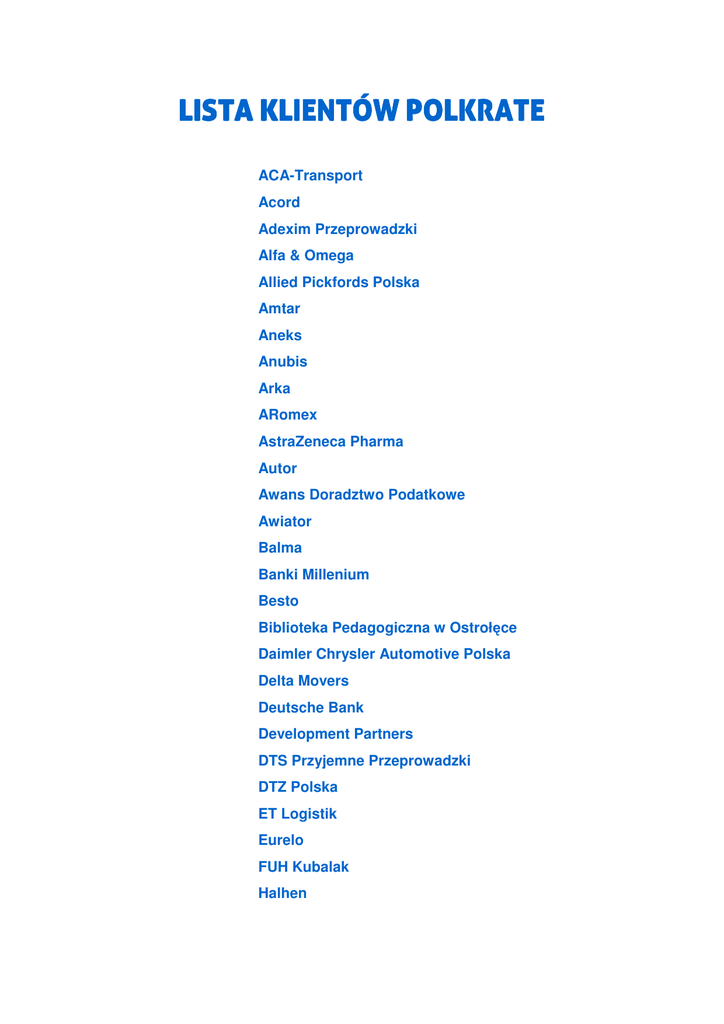 LISTA KLIENTÓW POLKRATE ACA-Transport Acord Adexim Przeprowadzki Alfa & Omega Allied Pickfords Polska Amtar Aneks Anubis Arka ARomex AstraZeneca Pharma Autor Awans Doradztwo Podatkowe Awiator Balma Banki Millenium Besto Biblioteka Pedagogiczna w Ostrołęce Daimler Chrysler Automotive Polska Delta Movers Deutsche Bank Development Partners DTS Przyjemne Przeprowadzki DTZ Polska ET Logistik Eurelo FUH Kubalak Halhen LISTA KLIENTÓW POLKRATE HSBC Bank Infovide-Matrix Inter-Trans Japa J.C. Trans Liberty Seguros LOT Ground Services Max – Przeprowadzki Medicover Metro Management Michelin Polska MK Relocation Movers Movex Novartis Optima PHU Arma PolCard Polskie Towarzystwo Finansowe Rachunkowość i Podatki s. c. Securitas Polska Sekcja Handlowa Ambasady Republiki Korei Sodexo Polska Strabag Polska StreamAir Streif Baulogistik Polska Telekomunikacja Polska Teva Pharmaceuticals Trager LISTA KLIENTÓW POLKRATE Tomi-Tel Transmid-Plus TVN 24 United Publishers and Productions Universal Express Relocations Urząd Miasta I Gminy w Piasecznie Urząd Skarbowy w Piasecznie Usługi Transportowe "Cegiełka" Voerman UTS Warsaw WestCap Polska