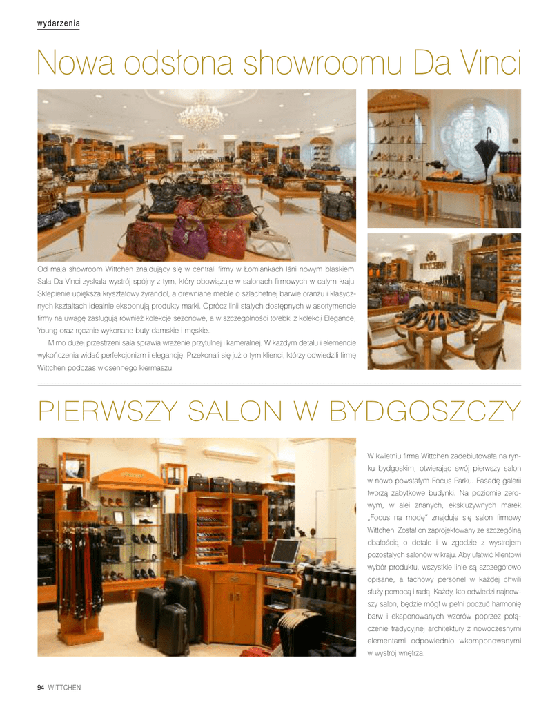 wydarzenia Nowa odsłona showroomu Da Vinci Od maja showroom Wittchen znajdujący się w centrali firmy w Łomiankach lśni nowym blaskiem. Sala Da Vinci zyskała wystrój spójny z tym, który obowiązuje w salonach firmowych w całym kraju. Sklepienie upiększa kryształowy żyrandol, a drewniane meble o szlachetnej barwie oranżu i klasycznych kształtach idealnie eksponują produkty marki. Oprócz linii stałych dostępnych w asortymencie firmy na uwagę zasługują również kolekcje sezonowe, a w szczególności torebki z kolekcji Elegance, Young oraz ręcznie wykonane buty damskie i męskie. Mimo dużej przestrzeni sala sprawia wrażenie przytulnej i kameralnej. W każdym detalu i elemencie wykończenia widać perfekcjonizm i elegancję. Przekonali się już o tym klienci, którzy odwiedzili firmę Wittchen podczas wiosennego kiermaszu. PIERWSZY SALON W BYDGOSZCZY W kwietniu firma Wittchen zadebiutowała na rynku bydgoskim, otwierając swój pierwszy salon w nowo powstałym Focus Parku. Fasadę galerii tworzą zabytkowe budynki. Na poziomie zerowym, w alei znanych, ekskluzywnych marek „Focus na modę” znajduje się salon firmowy Wittchen. Został on zaprojektowany ze szczególną dbałością o detale i w zgodzie z wystrojem pozostałych salonów w kraju. Aby ułatwić klientowi wybór produktu, wszystkie linie są szczegółowo opisane, a fachowy personel w każdej chwili służy pomocą i radą. Każdy, kto odwiedzi najnowszy salon, będzie mógł w pełni poczuć harmonię barw i eksponowanych wzorów poprzez połączenie tradycyjnej architektury z nowoczesnymi elementami odpowiednio wkomponowanymi w wystrój wnętrza. 94 WITTCHEN NAJLEPSI W HONGKONGU Na początku kwietnia zarząd oraz pracownicy firmy Wittchen, którzy podczas styczniowej Gali Wittchen zostali uhonorowani nagrodami za wybitne osiągnięcia w 2007 roku bądź za całokształt pracy, odwiedzili Hongkong. Pobyt w tym przepięknym mieście nazywanym miejscem spotkania Wschodu z Zachodem uświetniło wiele atrakcji. Drugiego dnia po przylocie wszyscy zwiedzili Lantau – największą wyspę Hongkongu, zlokalizowaną u ujścia rzeki Pearl. Ogromne wrażenie wywarł na uczestnikach wycieczki buddyjski klasztor Po Lin, gdzie znajduje się ważący 220 ton posąg Buddy. Następnego dnia cała grupa wyruszyła do Chin, by zwiedzić fabrykę współpracującą z firmą Wittchen. Wizytę uwieńczył uroczysty obiad i zwiedzanie parku krajobrazowego. Stamtąd wszyscy powrócili do Hongkongu, by poznać codzienne życie miasta, lokalne targowiska i egzotyczne potrawy. Wizyta w Hongkongu pozostawiła wszystkim niezatarte wrażenia i wspomnienie kultury jakże odmiennej od tradycji europejskich. Małgorzata Wesołowska, Pracownik Roku 2007 NOTATNIK BRAJLOWSKI Tomasz Kiełbasiewicz, nagroda specjalna za całokształt pracy w firmie; Krzysztof Basek, Manager Roku 2007 Firma Wittchen od wielu lat wspiera Ośrodek Szkolno-Wychowawczy dla Dzieci Niewidomych w Laskach. Rokrocznie funduje stypendium dla najzdolniejszych dzieci, a także zatrudnia wychowanków tej placówki. W tym roku firma Wittchen pomogła Ani Kuszaj, której prawdopodobnie podczas podróży skradziono notatnik brajlowski. „Służył mi do czytania, pisania, był ogromną pomocą w studiowaniu. Znajdowały się w nim wszystkie moje notatki oraz nuty ze studiów. Bez notatnika moje studiowanie stało się bardzo trudne. Był on niezbędny do codziennej pracy” – napisała w liście Ania Kuszaj, studentka III roku Wydziału Edukacji Muzycznej AMFC w Warszawie. Aby Ania mogła nadal studiować, firma Wittchen przekazała 10 tys. zł na zakup nowego notatnika. WITTCHEN 95