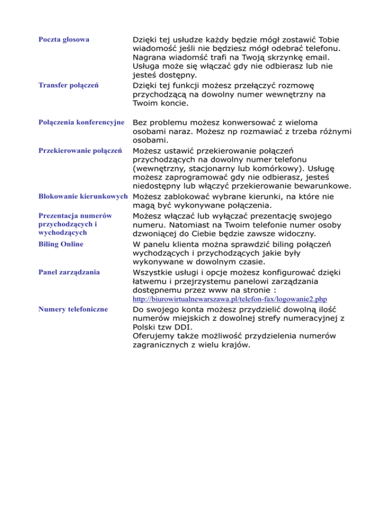 Poczta głosowa Transfer połączeń Dzięki tej usłudze każdy będzie mógł zostawić Tobie wiadomość jeśli nie będziesz mógł odebrać telefonu. Nagrana wiadomść trafi na Twoją skrzynkę email. Usługa może się włączać gdy nie odbierasz lub nie jesteś dostępny. Dzięki tej funkcji możesz przełączyć rozmowę przychodzącą na dowolny numer wewnętrzny na Twoim koncie. Bez problemu możesz konwersować z wieloma osobami naraz. Możesz np rozmawiać z trzeba różnymi osobami. Przekierowanie połączeń Możesz ustawić przekierowanie połączeń przychodzących na dowolny numer telefonu (wewnętrzny, stacjonarny lub komórkowy). Usługę możesz zaprogramować gdy nie odbierasz, jesteś niedostępny lub włączyć przekierowanie bewarunkowe. Blokowanie kierunkowych Możesz zablokować wybrane kierunki, na które nie magą być wykonywane połączenia. Prezentacja numerów Możesz włączać lub wyłączać prezentację swojego przychodzących i numeru. Natomiast na Twoim telefonie numer osoby wychodzących dzwoniącej do Ciebie będzie zawsze widoczny. Biling Online W panelu klienta można sprawdzić biling połączeń wychodzących i przychodzących jakie były wykonywane w dowolnym czasie. Panel zarządzania Wszystkie usługi i opcje możesz konfigurować dzięki łatwemu i przejrzystemu panelowi zarządzania dostępnemu przez www na stronie : http://biurowirtualnewarszawa.pl/telefon-fax/logowanie2.php Numery telefoniczne Do swojego konta możesz przydzielić dowolną ilość numerów miejskich z dowolnej strefy numeracyjnej z Polski tzw DDI. Oferujemy także możliwość przydzielenia numerów zagranicznych z wielu krajów. Połączenia konferencyjne Wirtualny fax - odbieranie Dzięki tej usłudze możesz wysłać faks a Ty otrzymasz go na swoje konto email w pliku pdf. Dzięki temu oszczędzasz na papierze, nie musisz posiadać żadnego urządzenia, łatwo będziesz mógł zarchiwizować faksy. Wirtualny fax - wysyłanie Dzięki tej funkcji możesz wysyłać faksy bez urządzenia. Możesz zrobić to ze swojego panelu przez upload pliku (web2fax) lub wysłać faks przez emaila (mail2fax). IVR Nagrywanie rozmów Numery wewnętrzne Call center Dzięki temu narzędziu będziesz mógł dowolnie kreować procesy podczas połączenia przychodzącego na jeden z Twoich numerów. Będziesz mógł między innymi: - ustawić warunek czasowy - sprawdzić czy połączenie zostało odebrane - włączyć funkcję centrali (oczekiwać na wybór tonowy) - nagrać i odtwarzać zapowiedzi Możesz włączyć nagrywanie rozmów wychodzących lub przychodzących i odtwarzać je w dowolnej chwili z własnego panelu. Do każdego konta SIP możesz przydzielić skrócony numer wewnętrzny i dzwonić w ramach swojego konta klienta po skróconych numerach. Usługa przeznaczona jest do działów call center. Umożliwia kolejkowanie połączeń przychodzących oraz informowanie klientów o czasie do połączenia z konsultantem oraz o pozycji w kolejce. Usługę można konfigurować na wiele sposobów między innymi ustalać strategię łączenia konsutlantów. Opisy wybranych usług WIRTUALNY FAX - ODBIERANIE JAK DODAĆ USŁUGĘ? Aby dodać usługę w panelu klienta w zakładce MOJE KONTO/MOJE USŁUGI rozwiń listę usługi dostępne i wybierz usługę Wirtualny fax - odbieranie. Następnie wybierasz numer telefonu, który będzie Twoim numerem faksowym oraz podajesz email na który mają przychodzić odebrane faksy. Po zatwierdzeniu usługi faksy wysłane na wybrany przez Ciebie numer będą przychodzić w formacie pdf na podanego maila. Za odbieranie faksów nic nie płacisz. WIRTUALNY FAX - WYSYŁANIE JAK DODAĆ USŁUGĘ? UWAGA! Aby dodać usługę Wirtualny fax wysyłanie musisz posiadać usługę Wirtualny Fax odbieranie. Aby dodać usługę w panelu w zakładce MOJE KONTO/MOJE USŁUGI rozwiń listę usługi dostępne i wybierz usługę Wirtualny fax - wysyłanie Następnie skonfiguruj z jakiego adresu email nasz system będzie przyjmował od Ciebie maila z przygotowanym do wysłania faksem. Definiujesz również tzw pole TSID, czyli nazwa jaka pojawi się na wysłanym przez Ciebie faksie. JAK WYSYŁAĆ FAKSY? Faksy można wysyłać na dwa sposoby: 1. mail2fax Wysyłając email na [email protected] w temacie podając numer telefonu na który ma zostać wysłany faks, oraz załączając dokument w formacie pdf lub tiff. Jeśli faks ma byc wysłany na więcej niż jeden numer w temacie należy je rozdzielić przecinkami. Jeden faks może zostać wysłany maksymalnie do 10 numerów 2. web2fax Z panelu zarządzania w zakładce MOJE KONTO/MOJE USŁUGI uploadując plik tiff lub pdf i podając numer telefonu na jaki ma być wysłany faks Po naciśnięciu Wyśłij faks system przystąpi do wysyłania faksu. Po chwili otrzymacie Państwo informacje na swoje konto email o przyjęciu faksu oraz o tym czy wysyłanie się powiodło. PREZENTACJA JEDNYM NUMEREM JAK DODAĆ USŁUGĘ? Aby dodać usługę w panelu klienta w zakładce MOJE KONTO/MOJE USŁUGI pod tabelką znajdź listę wyboru z usługami globalnymi i wybierz usługe z listy. W następnym kroku wybierz jeden ze swoich numerów publicznych jakim chcesz się prezentować. KIEDY MOŻEMY UŻYWAĆ USŁUGI? Jeśli na koncie klienta jest więcej kont SIP i numerów publicznych można użyć usługi, aby wszystkie połączenia wychodzące były prezentowane zawsze tylko jednym z numerów publicznych, które posiadzasz niezależnie od tego z jakiego konta SIP wykonywane jest połączenie. Rozwiązanie to można również zastosować wtedy gdy włączona jest usługa "SIP/IAX trunk" w przypadku gdy nie jesteś w stanie podstawiać pola callerID przy rozmowach wychodzących NUMERY WEWNĘTRZNE JAK DODAĆ USŁUGĘ? Aby dodać usługę w panelu klienta w zakładce MOJE KONTO/MOJE USŁUGI pod tabelką znajdź listę wyboru z usługami globalnymi. Następnie przypisz numer skrócony do konta voip wypełnij pole opis. Numery wewnętrzne mogą być dwu lub tr