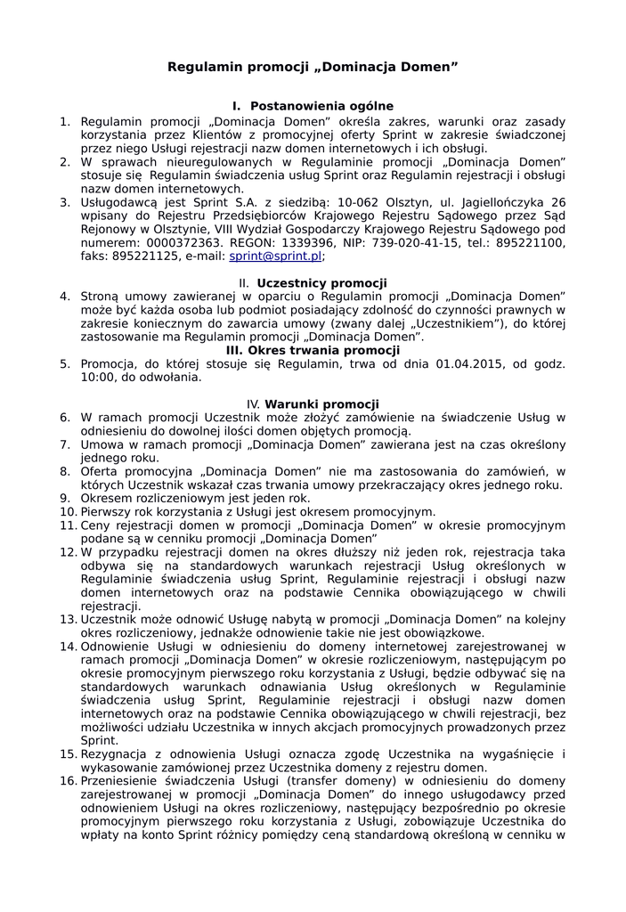 Regulamin promocji „Dominacja Domen” I. Postanowienia ogólne 1. Regulamin promocji „Dominacja Domen” określa zakres, warunki oraz zasady korzystania przez Klientów z promocyjnej oferty Sprint w zakresie świadczonej przez niego Usługi rejestracji nazw domen internetowych i ich obsługi. 2. W sprawach nieuregulowanych w Regulaminie promocji „Dominacja Domen” stosuje się Regulamin świadczenia usług Sprint oraz Regulamin rejestracji i obsługi nazw domen internetowych. 3. Usługodawcą jest Sprint S.A. z siedzibą: 10-062 Olsztyn, ul. Jagiellończyka 26 wpisany do Rejestru Przedsiębiorców Krajowego Rejestru Sądowego przez Sąd Rejonowy w Olsztynie, VIII Wydział Gospodarczy Krajowego Rejestru Sądowego pod numerem: 0000372363. REGON: 1339396, NIP: 739-020-41-15, tel.: 895221100, faks: 895221125, e-mail: [email protected]; II. Uczestnicy promocji 4. Stroną umowy zawieranej w oparciu o Regulamin promocji „Dominacja Domen” może być każda osoba lub podmiot posiadający zdolność do czynności prawnych w zakresie koniecznym do zawarcia umowy (zwany dalej „Uczestnikiem”), do której zastosowanie ma Regulamin promocji „Dominacja Domen”. III. Okres trwania promocji 5. Promocja, do której stosuje się Regulamin, trwa od dnia 01.04.2015, od godz. 10:00, do odwołania. IV. Warunki promocji 6. W ramach promocji Uczestnik może złożyć zamówienie na świadczenie Usług w odniesieniu do dowolnej ilości domen objętych promocją. 7. Umowa w ramach promocji „Dominacja Domen” zawierana jest na czas określony jednego roku. 8. Oferta promocyjna „Dominacja Domen” nie ma zastosowania do zamówień, w których Uczestnik wskazał czas trwania umowy przekraczający okres jednego roku. 9. Okresem rozliczeniowym jest jeden rok. 10. Pierwszy rok korzystania z Usługi jest okresem promocyjnym. 11. Ceny rejestracji domen w promocji „Dominacja Domen” w okresie promocyjnym podane są w cenniku promocji „Dominacja Domen” 12. W przypadku rejestracji domen na okres dłuższy niż jeden rok, rejestracja taka odbywa się na standardowych warunkach rejestracji Usług określonych w Regulaminie świadczenia usług Sprint, Regulaminie rejestracji i obsługi nazw domen internetowych oraz na podstawie Cennika obowiązującego w chwili rejestracji. 13. Uczestnik może odnowić Usługę nabytą w promocji „Dominacja Domen” na kolejny okres rozliczeniowy, jednakże odnowienie takie nie jest obowiązkowe. 14. Odnowienie Usługi w odniesieniu do domeny internetowej zarejestrowanej w ramach promocji „Dominacja Domen” w okresie rozliczeniowym, następującym po okresie promocyjnym pierwszego roku korzystania z Usługi, będzie odbywać się na standardowych warunkach odnawiania Usług określonych w Regulaminie świadczenia usług Sprint, Regulaminie rejestracji i obsługi nazw domen internetowych oraz na podstawie Cennika obowiązującego w chwili rejestracji, bez możliwości udziału Uczestnika w innych akcjach promocyjnych prowadzonych przez Sprint. 15. Rezygnacja z odnowienia Usługi oznacza zgodę Uczestnika na wygaśnięcie i wykasowanie zamówionej przez Uczestnika domeny z rejestru domen. 16. Przeniesienie świadczenia Usługi (transfer domeny) w odniesieniu do domeny zarejestrowanej w promocji „Dominacja Domen” do innego usługodawcy przed odnowieniem Usługi na okres rozliczeniowy, następujący bezpośrednio po okresie promocyjnym pierwszego roku korzystania z Usługi, zobowiązuje Uczestnika do wpłaty na konto Sprint różnicy pomiędzy ceną standardową określoną w cenniku w chwili zakupu, a promocyjną ceną za pierwszy rok, za którą Uczestnik promocji nabył domenę. 17. Realizacja zamówienia, w którym Uczestnik obok Usług oferowanych w ramach promocji złożył zlecenie realizacji innych odpłatnych Usług z bieżącej oferty handlowej Sprint, odbędzie się po uregulowaniu należności za tak złożone zamówienie.