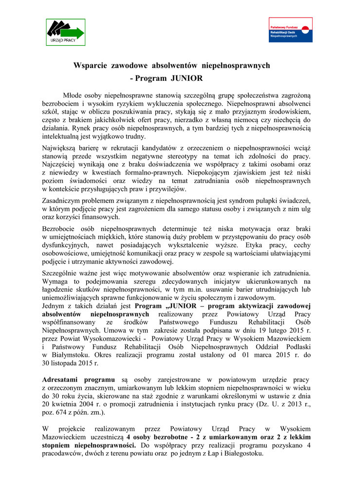 Program JUNIOR - Powiatowy Urząd Pracy w Wysokiem