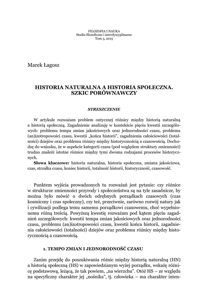FILOZOFIA I NAUKA Studia filozoficzne i interdyscyplinarne Tom 3, 2015 Marek Łagosz HISTORIA NATURALNA A HISTORIA SPOŁECZNA. SZKIC PORÓWNAWCZY STRESZCZENIE W artykule rozważam problem ontycznej różnicy między historią naturalną a historią społeczną. Zagadnienie analizuję w kontekście pięciu kwestii szczegółowych: problemu tempa zmian jakościowych oraz jednorodności czasu, problemu (an)izotropowości czasu, kwestii „końca historii”, zagadnienia całościowości (totalności) dziejów oraz problemu różnicy między historycznością a czasowością. Dochodzę do wniosku, że w aspekcie kategorii czasu (pod względem struktury zmienności) trudno znaleźć istotne różnice między tymi dwoma rodzajami procesów historycznych. Słowa kluczowe: historia naturalna, historia społeczna, zmiana jakościowa, czas, strzałka czasu, koniec historii, totalność historii, historyczność, czasowość. Punktem wyjścia prowadzonych tu rozważań jest pytanie: czy różnice w strukturze zmienności przyrody i społeczeństwa są na tyle zasadnicze, by można było mówić o dwóch odrębnych porządkach czasowych (czas kosmiczny i czas społeczny), czy też, przeciwnie, zarówno rozwój natury jak i cywilizacji podlega temu samemu porządkowi czasowemu, choć wypełnionemu różną treścią. Powyższą kwestię rozważam pod kątem pięciu zagadnień szczegółowych: kwestii tempa zmian jakościowych oraz jednorodności czasu, problemu (an)izotropowości czasu, kwestii końca historii, zagadnienia całościowości (totalności) dziejów oraz problemu różnicy między historycznością a czasowością. 1. TEMPO ZMIAN I JEDNORODNOŚĆ CZASU Zanim przejdę do poszukiwania różnic między historią naturalną (HN) a historią społeczną (HS) w zapowiedzianym wyżej porządku, wskażę różnicę podstawową, leżącą, że tak powiem, „na wierzchu”. Otóż HS – ze względu na specyficzny charakter jej „nośnika”, tj. człowieka – ma charakter inten- 336 Marek Łagosz cjonalny i wolitywny. Konceptualizuje ona i usensawia zarówno samą siebie jak i HN. Stopień samorozumienia, jaki osiągamy w HS, ma jednak zawsze swoje granice. Jak stwierdził bowiem Karol Marks w stosunku do agentów życia społecznego, czynią to, a nie wiedzą o tym. Przechodząc do zasadniczej kwestii, w życiu społecznym obserwujemy w ciągu stosunkowo niedługiego czasu (powiedzmy, życia kilku lub kilkunastu pokoleń) zasadnicze zmiany jakościowe. Zmieniają się ustroje polityczne, sytuacje demograficzne, koniunktury gospodarcze czy sposoby produkcji. Inaczej jest z naszą percepcją przyrody. Nie obserwujemy ewolucji gwiazd, gatunków biologicznych1 czy prawidłowości przyrodniczych. To nieznaczne tempo przemian jakościowych, jakie bylibyśmy skłonni przypisywać naturze, nie jest jednak faktem ontologicznym, a jedynie naszym punktem widzenia jako istot ograniczonych poznawczo. Wielka skala zjawisk i ich ogromna rozpiętość czasowa nie pozwala na bezpośrednie dostrzeganie dynamiki jakościowej przyrody.2 Niemniej jednak wiemy o niej na drodze naukowego rozumowania. Nawet jeśli założymy, że obecne tempo zmian jakościowych w przyrodzie nie jest nazbyt wielkie, to przecież był czas, tuż po Wielkim Wybuchu, w którym w ciągu ułamków sekundy zachodziły zmiany radykalne: została złamana pierwotna symetria podstawowych oddziaływań fizycznych (rozpadła się Super- i Wielka Unifikacja), powstały kwarki, antykwarki i gluony. Myślę tu o przedziale czasu obejmującym „erę Plancka” oraz domniemaną fazę inflacyjną rozwoju naszego kosmosu3, czyli, jak się podaje, do około. 10-33 –10-32s. Nigdy nie możemy też wykluczyć, że obecna – załóżmy mało dynamiczna – faza ewolucji naszego świata, jest fragmentem szerszej i rozwijającej się „inflacyjnie” części wszechświata, czego nie dostrzegamy, analogicznie, jak nie dostrzegamy bezpośrednio ruchu Ziemi wokół własnej osi. Także jednorodność czasu kosmicznego, związana z rzekomo niskim tempem zmian jakościowych, jest pozorna. Podobnie jak w HS, tak i w HN pełno jest punktów zwrotnych, przełomów i nowych er: stan osobliwy, era Plancka, faza inflacyjna, synteza pierwiastków ciężkich itd. Jednorodność jako własność symetrii czasu kosmicznego jest zatem grubą idealizacją. ————————— 1 Chociaż nie obserwujemy ewolucji biologicznej linii rozwojowych rozmaitych gatunków, to jednak mechanizmy i fakty ewolucyjne są obserwowane (dziedziczność, dobór naturalny, świadectwa paleontologiczne). W tym sensie teoria ewolucji biologicznej jest potwierdzona doświadczalnie. 2 Nawet gdy w teorii ewolucji biologicznej mówi się o tzw. „ewolucji wybuchowej”, czyli przyspieszonym okresie w ewolucji rozmaitych linii rozwojowych, to i tak ma się na myśli przedziały czasowe rzędu milionów (kilkunastu, dziesiątków) lat. 3 Piszę „naszego kosmosu”, gdyż zakładam infinitystyczną kosmologię wieloświatową, w którym nasz świat („kosmos”), jest jednym z nieprzebranej mnogości innych światów. Historia naturalna a historia społeczna. Szkic porównawczy 337 2. WŁASNOŚĆ (AN)IZOTROPII CZASU Nieco ciekawszej różnicy między HN a HS można dopatrywać się ze względu na problem ukierunkowania czasu. Otóż, biorąc rzecz najpierw od strony metaprzedmiotowej, w fizyce oraz w metodologii i w filozofii nauki mówi się o izotropowości nomologicznej czasu. Oznacza to, że większość praw fizyki jest t-inwariantna, tj. nieczuła na odwrócenie kierunku upływu czasu. Są tu jednak pewne wyjątki, na przykład klasycznie rozumiana druga zasada termodynamiki, której konsekwencją jest twierdzenie o wzroście entropii w układach zamkniętych, czy zjawisko rozpadu neutralnego elektrycznie mezonu K w mechanice kwantowej. Odwrotnie wygląda rzecz, jeśli chodzi prawa społeczne. Większość typowych (specyficznych dla danej formacji społeczno-ekonomicznej) praw 