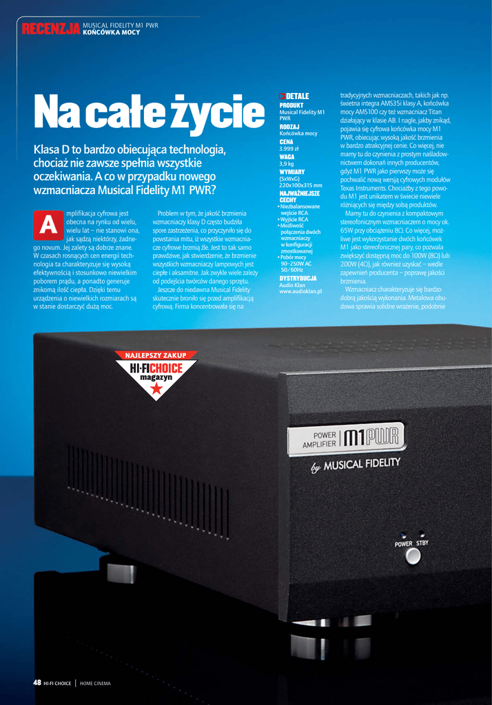 FIDELITY M1 PWR RECENZJA MUSICAL KOŃCÓWKA MOCY Na całe życie Klasa D to bardzo obiecująca technologia, chociaż nie zawsze spełnia wszystkie oczekiwania. A co w przypadku nowego wzmacniacza Musical Fidelity M1 PWR? A mplifikacja cyfrowa jest obecna na rynku od wielu, wielu lat – nie stanowi ona, jak sądzą niektórzy, żadnego novum. Jej zalety są dobrze znane. W czasach rosnących cen energii technologia ta charakteryzuje się wysoką efektywnością i stosunkowo niewielkim poborem prądu, a ponadto generuje znikomą ilość ciepła. Dzięki temu urządzenia o niewielkich rozmiarach są w stanie dostarczyć dużą moc. 48 HI-FI CHOICE | HOME CINEMA Problem w tym, że jakość brzmienia wzmacniaczy klasy D często budziła spore zastrzeżenia, co przyczyniło się do powstania mitu, iż wszystkie wzmacniacze cyfrowe brzmią źle. Jest to tak samo prawdziwe, jak stwierdzenie, że brzmienie wszystkich wzmacniaczy lampowych jest ciepłe i aksamitne. Jak zwykle wiele zależy od podejścia twórców danego sprzętu. Jeszcze do niedawna Musical Fidelity skutecznie broniło się przed amplifikacją cyfrową. Firma koncentrowała się na DETALE PRODUKT Musical Fidelity M1 PWR RODZAJ Końcówka mocy CENA 3.999 zł WAGA 3,9 kg WYMIARY (SxWxG) 220x100x315 mm NAJWAŻNIEJSZE CECHY •Niezbalansowane wejście RCA •Wyjście RCA •Możliwość połączenia dwóch wzmacniaczy w konfiguracji zmostkowanej •Pobór mocy 90–250W AC 50/60Hz DYSTRYBUCJA Audio Klan www.audioklan.pl tradycyjnych wzmacniaczach, takich jak np. świetna integra AMS35i klasy A, końcówka mocy AMS100 czy też wzmacniacz Titan działający w klasie AB. I nagle, jakby znikąd, pojawia się cyfrowa końcówka mocy M1 PWR, obiecując wysoką jakość brzmienia w bardzo atrakcyjnej cenie. Co więcej, nie mamy tu do czynienia z prostym naśladownictwem dokonań innych producentów, gdyż M1 PWR jako pierwszy może się pochwalić nową wersją cyfrowych modułów Texas Instruments. Chociażby z tego powodu M1 jest unikatem w świecie niewiele różniących się między sobą produktów. Mamy tu do czynienia z kompaktowym stereofonicznym wzmacniaczem o mocy ok. 65W przy obciążeniu 8Ω. Co więcej, możliwe jest wykorzystanie dwóch końcówek M1 jako stereofonicznej pary, co pozwala zwiększyć dostępną moc do 100W (8Ω) lub 200W (4Ω), jak również uzyskać – wedle zapewnień producenta – poprawę jakości brzmienia. Wzmacniacz charakteryzuje się bardzo dobrą jakością wykonania. Metalowa obudowa sprawia solidne wrażenie, podobnie MUSICAL FIDELITY M1 PWR KOŃCÓWKA MOCY jak wykonany ze stopu aluminium panel czołowy o grubości 10mm. Jednak przy wadze 3,9kg nie jest to typowy dla Musical Fidelity „pancernik”. Nie ma jednak się co dziwić, gdyż jego konstrukcja nie wymaga masywnych radiatorów, w jakie wyposażane są konwencjonalne końcówki mocy. Transformator sieciowy o wielkości pudełka zapałek jest zaskakująco mały jak na moc oferowaną przez wzmacniacz. Jednak i to nie jest zaskoczeniem, gdyż wzmacniacze klasy D charakteryzują się bardzo wysoką efektywnością. Tak więc ci, którzy lubią „słuchać oczami” i zwracają uwagę na takie rzeczy, jak wielkość, ciężar czy ekstrawaganckie obudowy, mogą być nieco rozczarowani skromnością M1 PWR. Wystarczy go jednak posłuchać, aby się przekonać, że oferuje znakomitą jakość. Odsłuchy zacząłem z jednym M1 PWR w konfiguracji stereo, podłączając go do systemu w miejsce MF kW-750. Jeszcze kilka lat temu kW-750 był flagową końcówką mocy Musicala. Chociaż wzmacniacz ten nie jest już produkowany, nadal uznaje się go za jeden z najlepszych modeli w historii firmy. Sam założyciel Musical Fidelity, Antony Michaelson, wciąż używa go w swoim domowym systemie. I trudno się dziwić: 750W przy obciążeniu 8Ω i ponad 1.000W przy 4Ω oznacza, że kW-750 to naprawdę „Wystarczy go posłuchać, aby się przekonać, że oferuje znakomitą jakość…” potężna bestia. Ma przy tym imponujące rozmiary. Sam zewnętrzny transformator jest zamknięty w obudowie większej niż dwa wzmacniacze M1 PWR razem wzięte. Gdyby był produkowany dzisiaj, jego cena z pewnością oscylowałaby w granicach 50.000zł. Pierwsze odsłuchy Biorąc pod uwagę astronomiczną cenę i imponujące rozmiary kW-750, można było zadać sobie pytanie, jak na jego tle wypadnie „skromny” M1 PWR. Okazało się, że zaskakująco dobrze. Brzmienie M1 PWR nie jest wprawdzie tak wyrafinowane, RECENZJA jak kW-750, ale różnica między nimi jest stosunkowo niewielka i z pewnością nie odzwierciedla ogromnej przepaści cenowej między tymi modelami. Dźwięk M1 PWR jest czysty, świeży i otwarty, charakteryzuje się naturalnym balansem tonalnym i świetnym oddaniem niuansów dynamiki. Brzmienie jest wyrównane i szczegółowe, klarowne i transparentne, a ponadto sprawia wrażenie ogromnego zapasu mocy. Nie jest to może tak bogate, ciepłe i czarujące brzmienie jak to, którym może się pochwalić kW-750, ale nie jest też nadmiernie ostre czy rozjaśnione. Można je jedynie uznać za nieco chłodne. Uderzająca jest za to jego czystość, szczegółowość, transparentność i otwartość. Bas jest pełny i solidny, chociaż nie dorównuje potędze basu kW-750. Odnosi się wrażenie, że kolumny kontrolowane przez M1 PWR nie przesuwają aż tyle powietrza. Brzmienie kW-750 wydaje się odrobinę bogatsze i ma w sobie magię, której brakuje tańszemu kuzynowi. Najciekawsze jest jednak to, że po około godzinie słuchania M1 PWR różnice zaczynają się zacierać i pojawiają się pierwsze wątpliwości. Czy kW-750 rzeczywiście był tak wyraźnie lepszy? Tak wydawało się bezpośrednio po zamianie, jednak M1 PWR też ma swój czar. Można wręcz pokusić się o stwierdzenie, że jest lepszy, niż wskazywałaby na to jego cena. Po kilku godzinach spędzonych w jego miłym towarzystwie jestem niemal przekonany, że w pełni dorównuje swojemu więks