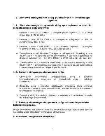 1. Zimowe utrzymanie dróg publicznych – informacje ogólne. 1.1. Plan zimowego utrzymania dróg sporządzono w oparciu o następujące akty prawne: 1. Ustawa z dnia 21.03.1985 r. o drogach publicznych – Dz. U. z 2016 roku, poz. 1440 ze zm.; 2. Ustawa z dnia 28.03.2003 r. o transporcie kolejowym – z 2016 roku, poz. 1727; Dz. U. 3. Ustawa z dnia 13.09.1996 r. o utrzymaniu czystości i porządku w gminach–Dz. U. z 2016 roku, poz 250 ze zm.; 4. Zarządzenie nr 46 Ministra Transportu i Gospodarki Morskiej z dnia 25.10.1994 r. w sprawie zasad odśnieżania i usuwania gołoledzi na drogach publicznych – Dz. Urz. MTiGM z 1995 roku, Nr 10, poz. 20; 5. Zarządzenie nr 12 Ministra Transportu i Gospodarki Morskiej z dnia 09.09.1997 r. zmieniające zarządzenie w sprawie zasad odśnieżania i usuwania gołoledzi na drogach publicznych. 1.2. Zasady zimowego utrzymania dróg : 1. Obowiązek utrzymania przejezdności dróg i komunikacyjnych spoczywa na zarządcach dróg i kolejowych. szlaków szlaków 2. Zarządcy dróg i szlaków kolejowych prowadzą akcję zimową w oparciu o własny stan zatrudnienia, własne środki materiałowo techniczne i finansowe. 3. Zarządcy dróg korzystają również z wynajętych nośników sprzętu do zimowego utrzymania. 1.3. Zasady zimowego utrzymania dróg na terenie powiatu bełchatowskiego. Drogi powiatowe na terenie powiatu bełchatowskiego podzielone zostały na następujące standardy zimowego utrzymania: II standard (drogi/ulice miejskie); 1 III, IV i V standard (drogi zamiejskie), różniące się stanem utrzymania jezdni oraz dopuszczalnymi odstępstwami w zakresie zaśnieżenia jezdni i występowania śliskości. Czas występowania odstępstw od ustalonego standardu liczony jest w godzinach od momentu ustania opadów śniegu lub pojawienia się śliskości i jest zróżnicowany dla różnych standardów. Kryterium klasyfikacji dróg do poszczególnych standardów stanowi ich klasa, funkcja i średnioroczny ruch dobowy. Założone standardy obowiązują w średnich warunkach pogodowych. W warunkach znacznie odbiegających od średnich warunków pogodowych (np. okresy bardzo intensywnych opadów śniegu) zimowe utrzymanie dróg polegać będzie na: 1. skierowaniu całego sprzętu będącego w dyspozycji PZD do utrzymania przejezdności dróg objętych II standardem a następnie III i IV standardem; 2. doraźnym wynajęciu dodatkowego sprzętu ciężkiego do utrzymania przejezdności w/w dróg (np. spycharki, ładowarki itp.); 3. sukcesywnym wysyłaniu sprzętu do przywrócenia przejezdności dróg o niższym standardzie utrzymania, po zabezpieczeniu przejezdności dróg II, III i IV standardu. 1.4. Podział dróg na standardy zimowego utrzymania. Planem zimowego utrzymania dróg na terenie działania Powiatowego Zarządu Dróg w Bełchatowie objęto ogółem 264,2 km dróg zamiejskich, 30,32 km dróg miejskich oraz 60 km dróg powiatowych zamiejskich utrzymywanych przez inne jednostki. W poszczególnych standardach, przedstawia się następująco: 52,72 km zimowe utrzymanie – zgodnie z zasadami II standardu, 46,6 km – zgodnie z zasadami IV standardu, 255,2 km – według standardu V, Zasady odśnieżania dróg i usuwania skutków gołoledzi na drogach poszczególnych standardów określa załącznik nr 2 do Zarządzenia Nr46 Ministra Transportu i Gospodarki Morskiej z dnia 25 października 1994r. Ujęte w odcinkach w/w załączniku decydujących określenie o „Jezdnia możliwości 2 posypywana ruchu” określa, na że posypywaniem objęte będą następujące miejsca w ciągach dróg:„...na skrzyżowaniach z innymi drogami oraz liniami kolejowymi, na odcinkach dróg o pochyleniu podłużnym większym niż 4 %, na przystankach autobusowych, na niebezpiecznych łukach poziomych, innych miejscach ustalonych przez zarząd drogi, np. w bezpośrednim sąsiedztwie zbiorników wodnych, na wysokich nasypach itp....”. 1.5. Podsumowanie. W normalnych warunkach zimowych wszystkie drogi będą utrzymywane w standardach przyjętych przez Ministerstwo Transportu i Gospodarki Morskiej w Zarządzeniu nr 46 z 1994 roku. Zgromadzony materiał i środki zostaną w całości przeznaczone na zimowe utrzymanie dróg. W przypadku umiarkowanych warunków atmosferycznych nie powodujących konieczności częstych interwencji, standard utrzymania będzie wyższy. W sytuacji gdy warunki zimowe będą znacznie gorsze od średniej, usuwanie ich skutków prowadzone będzie racjonalnie, na bieżąco, ale do wysokości przeznaczonych na ten cel środków i zapasów. 2.Schemat służb odpowiedzialnych za zimowe utrzymanie dróg w Powiatowym Zarządzie Dróg w Bełchatowie. Lp. 1. Osoby nadzorujące Czas pracy Telefon służbowy Dyrektor Powiatowego Zarządu Dróg - Tomasz Jachymek 07.00 – 15.00 44 632 79 14 3 2. Kierownik Obwodu Drogowego Nr 1 w Kalisku – Dariusz Stępień 07.00 – 15.00 603 954 918 3. Kierownik Obwodu Drogowego Nr 2 w Szczercowie Bartłomiej Guzenda 07.00 – 15.00 609 801 084 Lp. Służba Interwencyjna Czas pracy Telefon służbowy 1. Obwód Zimowego Utrzymania : Obwód Drogowy nr 2 w Szczercowie 24h Dyżurny – koordynator 24h 44 631 80 55 601 220 045 Uwaga : Czas pracy Służby Interwencyjnej jest regulowany w zależności od sytuacji na drogach i warunków atmosferycznych. 3. Zimowe utrzymanie dróg powiatowych miejskich. Na terenie działania Powiatowego Zarządu Dróg występują odcinki dróg powiatowych stanowiące ulice w miastach - Bełchatowie i Zelowie, łączna ich długość wynosi - 30,32 km. 3.1. Zimowe utrzymanie dróg na terenie miasta Bełchatowa: Na mocy porozumienia z dnia 06.04.2000 roku pomiędzy Zarządem Powiatu w Bełchatowie a Gminą Miasto Bełchatów, prowadzenie zadań publicznych w przedmiocie zarządzania ulicami powiatowymi na obszarze miasta Bełchatów przejmuje Gmina Miasto Bełchatów. W II standardzie, zimowe utrzymanie dróg powiatowych na obszarze miasta Bełchatów będzie prowadzić jednostka wyłoniona w prze