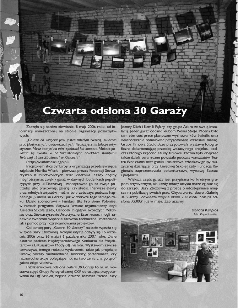 Czwarta ods³ona 30 Gara¿y Zaczê³o siê bardzo niewinnie, 8 maja 2006 roku, od informacji umieszczonej na stronie organizacji pozarz¹dowych: „Gara¿e do wziêcia! Jeœli jesteœ m³odym twórc¹, autorem prac plastycznych, audiowizualnych. Realizujesz instalacje artystyczne. Masz pomys³ na mini-spektakl lub koncert. Mo¿esz pokazaæ siê œwiatu w postindustrialnych obiektach Kompanii Twórczej „Baza Zbo¿owa” w Kielcach!” (http://wiadomosci.ngo.pl) Inicjatorem akcji by³ Liroy, a organizacj¹ przedsiêwziêcia zajê³a siê Monika Witek – pierwsza prezes Federacji Stowarzyszeñ Kulturotwórczych Baza Zbo¿owa. Ka¿dy chêtny móg³ otrzymaæ zwyk³y gara¿ w dawnych budynkach popolicyjnych przy ul.Zbo¿owej i zaadaptowaæ go na swoje potrzeby, jako pracowniê, galeriê, czy studio. Pierwsze efekty prac m³odych artystów mo¿na by³o zobaczyæ podczas happeningu „Galeria 30 Gara¿y” ju¿ w czerwcu tego samego roku. Dziêki sponsorowi – Fundacji J&S Pro Bono Poloniae, w ramach programu Aktywna Wiosna organizatorzy, czyli Kielecka Szko³a Jazdy, Oœrodek Inicjatyw Twórczych Piekarnia oraz Stowarzyszenie Artystyczne Ecce Homo, mogli zapewniæ twórcom wsparcie zarówno techniczne i materialne jak i pomoc przy rozreklamowaniu projektów. Od tamtej pory „Galeria 30 Gara¿y” na sta³e wpisa³a siê w ¿ycie Bazy Zbo¿owej. Kolejne edycje odby³y siê 16 wrzeœnia 2006 oraz 26 maja i 6 paŸdziernika 2007 roku. Dwie ostatnie podczas Miêdzynarodowego Konkursu dla Projektantów i Entuzjastów Mody Off Fashion. Wystawom zawsze towarzysz¹ innego rodzaju wydarzenia, takie jak projekcje filmów, pokazy multimedialne, koncerty, performance, czy ró¿norodne akcje polegaj¹ce np. na tworzeniu „na gor¹co” galerii zdjêæ widzów. PaŸdziernikowa ods³ona Galerii 30 Gara¿y to m. in. wystawa zdjêæ Grupy Fotograficznej CKF, obrazuj¹ca przygotowania do Off Fashion, zdjêcia lotnicze Tomasza Pacana, akty 40 Joanny Klich i Kamili F¹fary, czy grupa Aækru ze swoj¹ instalacj¹. Jeden gara¿ oddano klubom Wolna Strefa. Mo¿na by³o tam obejrzeæ prace plastyczne wychowanków œwietlic oraz w³asnorêcznie pomalowaæ przygotowan¹ wczeœniej maskê. Grupa filmowa Studio Baza przygotowa³a wystawê fotograficzn¹ dokumentuj¹c¹ przebieg wakacyjnego projektu, podczas którego krêcono etiudy filmowe. Mo¿na by³o obejrzeæ tak¿e dzie³a ceramiczne powsta³e podczas warsztatów Teatru Ecce Homo oraz grafiki i malarstwo cz³onków grupy muzycznej dzia³aj¹cej przy Kieleckiej Szkole Jazdy. Fundacja Regionalis zaprezentowa³a pokonkursow¹ wystawê Sacrum i profanum. Wiêksza czêœæ gara¿y jest przypisana konkretnym grupom artystycznym, ale ka¿dy m³ody artysta mo¿e zg³osiæ siê do zarz¹du Bazy Zbo¿owej z proœb¹ o udostêpnienie miejsca na publikacjê swoich prac. Chyba warto, skoro „Galeriê 30 Gara¿y” odwiedza zwykle oko³o 200 osób. Kolejna ods³ona „G30G” ju¿ w maju. Zapraszamy. Dorota Kurpios Foto: Wojciech Habdas