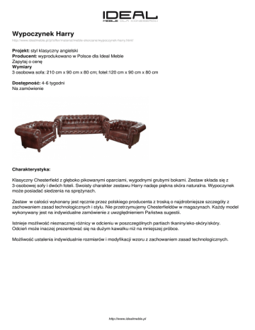 Wypoczynek Harry http://www.idealmeble.pl/pl/offer/material/meble-skorzane/wypoczynek-harry.html/ Projekt: styl klasyczny angielski Producent: wyprodukowano w Polsce dla Ideal Meble Zapytaj o cenę Wymiary 3 osobowa sofa: 210 cm x 90 cm x 80 cm; fotel:120 cm x 90 cm x 80 cm Dostępność: 4-6 tygodni Na zamówienie Charakterystyka: Klasyczny Chesterfield z głęboko pikowanymi oparciami, wygodnymi grubymi bokami. Zestaw składa się z 3-osobowej sofy i dwóch foteli. Swoisty charakter zestawu Harry nadaje piękna skóra naturalna. Wypoczynek może posiadać siedzenia na sprężynach. Zestaw w całości wykonany jest ręcznie przez polskiego producenta z troską o najdrobniejsze szczegóły z zachowaniem zasad technologicznych i stylu. Nie przetrzymujemy Chesterfieldów w magazynach. Każdy model wykonywany jest na indywidualne zamówienie z uwzględnieniem Państwa sugestii. Istnieje możliwość nieznacznej różnicy w odcieniu w poszczególnych partiach tkaniny/eko-skóry/skóry. Odcień może inaczej prezentować się na dużym kawałku niż na mniejszej próbce. Możliwość ustalenia indywidualnie rozmiarów i modyfikacji wzoru z zachowaniem zasad technologicznych. http://www.idealmeble.pl Dostępne wersje produktu: nazwa produktu Wypoczynek Harry warianty Tapicerka skóra naturalna cena 0.00zł PROMOCJA Siedzisko: pianka tapicerska + sprężyny bonellowe (+0.00 zł) Poduszka ozdobna 40x40 cm (+65.00 zł) http://www.idealmeble.pl dostępne 4-6 tygodni Zdjęcia produktu: http://www.idealmeble.pl Powered by TCPDF (www.tcpdf.org)