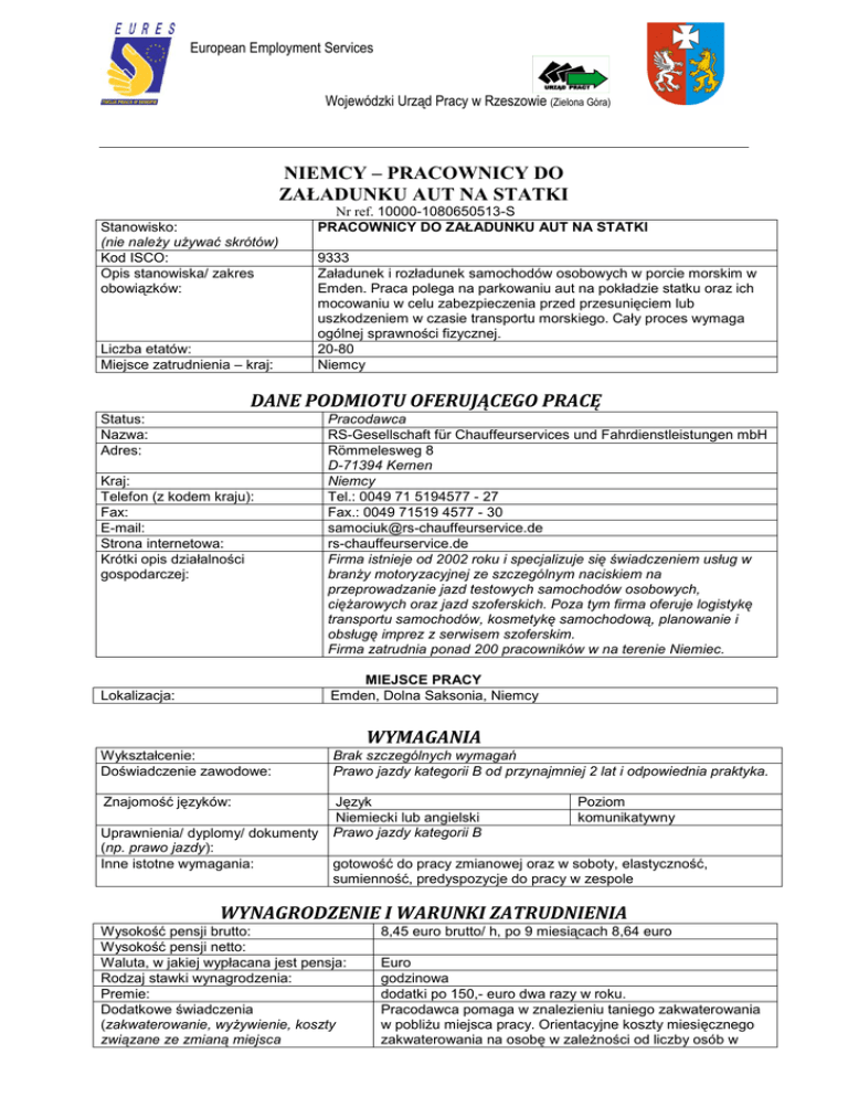 niemcy – pracownicy do załadunku aut na statki dane podmiotu