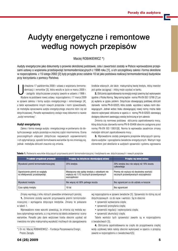 Porady dla audytora Audyty energetyczne i remontowe według nowych przepisów Maciej ROBAKIEWICZ *) Audyty energetyczne jako dokumenty o prawnie określonej podstawie, celu i zawartości zostały w Polsce wprowadzone przepisami ustawy o wspieraniu przedsięwzięć termomodernizacyjnych z 1998 roku [1], a ich szczegółowy zakres i forma określone w rozporządzeniu z 15 lutego 2002 [2] były przyjęte przez ostatnie 10 lat jako podstawa realizacji termomodernizacji budynków przy korzystaniu z pomocy Państwa. U chwalona 17 października 2008 r ustawa o wspieraniu termomodernizacji i remontów [3], która weszła w życie w marcu 2009 r. – zastąpiła dotychczasowe przepisy zawarte w ustawie z 1998 r. Wydane na podstawie nowej ustawy rozporządzenie z 17 marca 2009 w sprawie zakresu i formy audytu energetycznego i remontowego [4], a także wprowadzenie innych nowych przepisów i norm spowodowało, że metodyka opracowania audytu energetycznego znacznie różni się od dotychczasowej. Ponadto wprowadzony zostaje nowy dokument o nazwie „audyt remontowy”. Audyt energetyczny Zakres i forma nowego audytu energetycznego w porównaniu do dotychczasowego audytu pozostaje w znacznej części niezmieniona. Ocena poszczególnych ulepszeń (dotychczas nazywanych usprawnieniami) i ich optymalizacja, sposób formułowania wariantów itp nie zmieniają się, jednak metodyka obliczeń znacznie się zmienia. środków własnych, ale także maksymalną kwotę kredytu, którą inwestor jest gotów zaciągnąć i którą może uzyskać w banku. 2. Obliczenia zapotrzebowania na energię energii powinny być wykonywane zgodnie z Polska Normą. Taką normą będzie norma PN-EN ISO 13790 [7] po jej wydaniu w języku polskim. Dotychczas obowiązującą podstawę obliczeń stanowiła norma PN-B-02025, która została wycofana z wykazu norm obowiązujących. Jednak wobec braku obowiązującej nowej normy można także obecnie wykonywać obliczenia w oparciu o normą PN-B-02025 stanowiącą dostępny dokument zawierający wiedzę techniczną w tym zakresie. Zmienia się normowa podstawa obliczenia zapotrzebowania mocy, którą dotychczas stanowiła norma PN-B-03406 obecnie zastąpiona przez normę PN-EN ISO 13831[8]. Norma ta wprowadza zasadnicze zmiany metodyki obliczeń zapotrzebowania mocy . 3. Wprowadzone zostały powiązania przepisów dotyczących sporządzania audytów i sporządzania świadectw energetycznych. Ważnym tego elementem jest określanie w audytach sprawności systemu ogrzewania Tabela 1. Porównanie warunków dotyczących przyznawania premii termomodernizacyjnej i kredytowania ww. dotychczasowych i nowych przepisów Przedmiot uregulowań prawnych Przepisy wg dotychczas obowiązującej ustawy Przepisy wg nowej ustawy Wysokość premii termomodernizacyjnej 25% kredytu 20% kredytu lecz nie więcej niż 16% kosztu całkowitego Ograniczenie premii ze względu na efektywność przedsięwzięć Miesięczna rata spłaty kredytu z odsetkami nie większa niż 1/12 rocznych przewidywanych oszczędności Premia nie wyższa niż dwukrotna wartość rocznych przewidywanych oszczędności Wysokość kredytu Nie więcej niż 80% pełnego kosztu Bez ograniczeń co do udziału w koszcie Czas spłaty kredytu 10 lat Bez ograniczeń Zmiany wynikają z kilku różnych powodów omówionych poniżej. 1. Zmienione zostały warunki przyznawania premii termomodernizacyjnej i wymagania dotyczące kredytów. Zmiany te pokazano w tabeli 1. Wprowadzone nowe warunki powodują, że zmienia się metoda wyboru optymalnego wariantu, a z nią zmienia się tabela zestawienia i oceny wariantów. Ponadto jako dane wejściowe trzeba obecnie uzyskać od inwestora nie tylko maksymalną wysokość możliwych do zaangażowania *) Dr inż. Maciej ROBAKIEWICZ – Fundacja Poszanowania Energii; Prezes Zarządu 04 (25) 2009 wg rozporządzenia w sprawie świadectw [5]. Sprawności te różnią się od dotychczasowych co do nazw i wartości. Są to obecnie: • sprawność wytwarzania ciepła; • sprawność przesyłania ciepła; • sprawność regulacji i wykorzystania ciepła; • sprawność akumulacji ciepła. Tabele wartości tych sprawności zawarte są w rozporządzeniu o świadectwach [5]. 4. Obliczenia zapotrzebowania na ciepło do przygotowania ciepłej wody użytkowej także należy obecnie wykonywać w oparciu o przepisy zawarte w rozporządzeniu o świadectwach[5]. Porady dla audytora 5. Bazą dla oceny cech energetycznych budynków poddawanych termomodernizacji są wymagania zawarte w Warunkach Technicznych jakim powinny odpowiadać budynki , a wymagania te zostały zmienione [7] w zakresie maksymalnych wartości współczynników przenikania przez przegrody, jak i w syntetycznej ocenie jakości energetycznej – obecnie wskaźniki EP zamiast dotychczasowych E. 6. Dane klimatyczne dotychczas przyjmowane z załącznika do normy PN-B-02025 obecnie zostają zastąpione przez bazę danych klimatycznych zamieszczoną na stronie internetowej Ministerstwa Infrastruktury. Zmiany warunków przyznawania premii są łatwe do wprowadzenia, natomiast zmiana norm i metod obliczeniowych powoduje, że stosowane dotychczas programy komputerowe wykorzystywane do opracowania audytów będą wymagały wprowadzenia odpowiednich zmian i poprawek. Audyt remontowy Audyt remontowy jest zupełnie nowym dokumentem. Przedsięwzięcia remontowe wspierane premią w trybie ustawy muszą zawierać pewien zakres robót termomodernizacyjnych. W związku z tym w audycie remontowym podobnie jak w audycie energetycznym konieczne jest wykazanie oszczędności energetycznych i w tym celu wykonania obliczeń zapotrzebowania energii. Natomiast nie występuje tu obliczenie wartości finansowej planowanych oszczędności, a tylko oszczędność energetyczna. Audyt remontowy dotyczy budynków określonych w ustawie, czyli wyłącznie budynków mieszkalnych wielorodzinnych oddanych do użytkowania przed 14 sierpnia 1960 r. Podobnie jak w przypadku audytu energetyczne