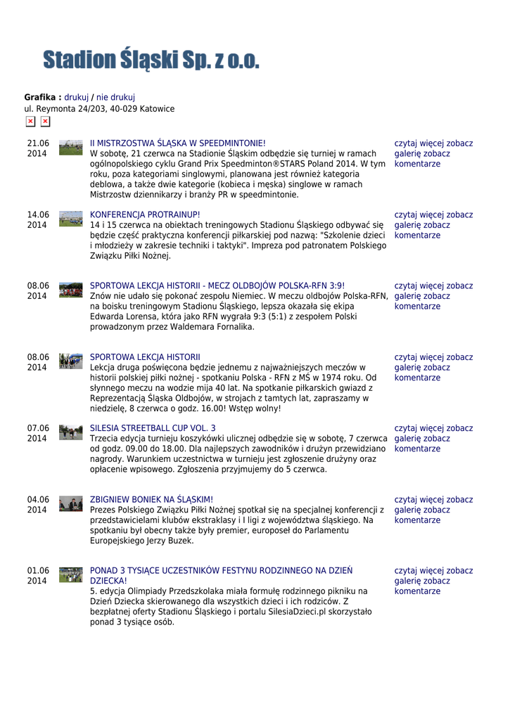 Grafika : drukuj / nie drukuj ul. Reymonta 24/203, 40-029 Katowice 21.06 2014 II MISTRZOSTWA ŚLĄSKA W SPEEDMINTONIE! W sobotę, 21 czerwca na Stadionie Śląskim odbędzie się turniej w ramach ogólnopolskiego cyklu Grand Prix Speedminton®STARS Poland 2014. W tym roku, poza kategoriami singlowymi, planowana jest również kategoria deblowa, a także dwie kategorie (kobieca i męska) singlowe w ramach Mistrzostw dziennikarzy i branży PR w speedmintonie. czytaj więcej zobacz galerię zobacz komentarze 14.06 2014 KONFERENCJA PROTRAINUP! czytaj więcej zobacz 14 i 15 czerwca na obiektach treningowych Stadionu Śląskiego odbywać się galerię zobacz będzie część praktyczna konferencji piłkarskiej pod nazwą: "Szkolenie dzieci komentarze i młodzieży w zakresie techniki i taktyki". Impreza pod patronatem Polskiego Związku Piłki Nożnej. 08.06 2014 SPORTOWA LEKCJA HISTORII - MECZ OLDBOJÓW POLSKA-RFN 3:9! czytaj więcej zobacz Znów nie udało się pokonać zespołu Niemiec. W meczu oldbojów Polska-RFN, galerię zobacz na boisku treningowym Stadionu Śląskiego, lepsza okazała się ekipa komentarze Edwarda Lorensa, która jako RFN wygrała 9:3 (5:1) z zespołem Polski prowadzonym przez Waldemara Fornalika. 08.06 2014 SPORTOWA LEKCJA HISTORII Lekcja druga poświęcona będzie jednemu z najważniejszych meczów w historii polskiej piłki nożnej - spotkaniu Polska - RFN z MŚ w 1974 roku. Od słynnego meczu na wodzie mija 40 lat. Na spotkanie piłkarskich gwiazd z Reprezentacją Śląska Oldbojów, w strojach z tamtych lat, zapraszamy w niedzielę, 8 czerwca o godz. 16.00! Wstęp wolny! 07.06 2014 SILESIA STREETBALL CUP VOL. 3 czytaj więcej zobacz Trzecia edycja turnieju koszykówki ulicznej odbędzie się w sobotę, 7 czerwca galerię zobacz od godz. 09.00 do 18.00. Dla najlepszych zawodników i drużyn przewidziano komentarze nagrody. Warunkiem uczestnictwa w turnieju jest zgłoszenie drużyny oraz opłacenie wpisowego. Zgłoszenia przyjmujemy do 5 czerwca. 04.06 2014 ZBIGNIEW BONIEK NA ŚLĄSKIM! Prezes Polskiego Związku Piłki Nożnej spotkał się na specjalnej konferencji z przedstawicielami klubów ekstraklasy i I ligi z województwa śląskiego. Na spotkaniu był obecny także były premier, europoseł do Parlamentu Europejskiego Jerzy Buzek. czytaj więcej zobacz galerię zobacz komentarze 01.06 2014 PONAD 3 TYSIĄCE UCZESTNIKÓW FESTYNU RODZINNEGO NA DZIEŃ DZIECKA! 5. edycja Olimpiady Przedszkolaka miała formułę rodzinnego pikniku na Dzień Dziecka skierowanego dla wszystkich dzieci i ich rodziców. Z bezpłatnej oferty Stadionu Śląskiego i portalu SilesiaDzieci.pl skorzystało ponad 3 tysiące osób. czytaj więcej zobacz galerię zobacz komentarze czytaj więcej zobacz galerię zobacz komentarze 01.06 2014 OLIMPIADA PRZEDSZKOLAKA PO RAZ PIĄTY! czytaj więcej zobacz W niedzielę, 1 czerwca w godz. 13.00-18.00 Wojewódzki Ośrodek Kultury i galerię zobacz Sportu „Stadion Śląski” i portal SILESIA DZIECI zapraszają przedszkolaki wraz komentarze z rodzicami na obiekty sportowe Stadionu Śląskiego. Tym razem będzie to także rodzinny piknik na Dzień Dziecka. Udział w imprezie jest bezpłatny! 31.05 2014 TURNIEJ PIŁKARSKI DLA DRUŻYN AMATORSKICH BRASIL`2014! W sobotę, 31 maja finałowe spotkania turnieju odbędą się na boisku treningowym z naturalną nawierzchnią Stadionu Śląskiego. Początek o godz. 18.00! czytaj więcej zobacz galerię zobacz komentarze 21.05 2014 DNI SPORTU SZKOŁY PODSTAWOWEJ NR 16 W RUDZIE ŚLĄSKIEJ! W ramach akcji "School 4 Free - darmowe boiska dla szkół", 21 i 22 maja na obiektach treningowych Stadionu Śląskiego, uczniowie i nauczyciele z Rudy Śląskiej uczestniczą w Dniach Sportu. czytaj więcej zobacz galerię zobacz komentarze « Pierwsza < 15 16 17 18 19 20 21 22 23 24 25 > Ostatnia »