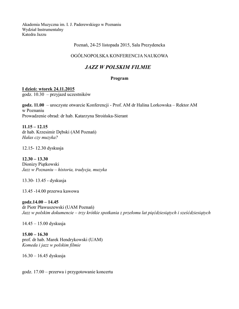 Akademia Muzyczna im. I. J. Paderewskiego w Poznaniu Wydział Instrumentalny Katedra Jazzu Poznań, 24-25 listopada 2015, Sala Prezydencka OGÓLNOPOLSKA KONFERENCJA NAUKOWA JAZZ W POLSKIM FILMIE Program I dzień: wtorek 24.11.2015 godz. 10.30 – przyjazd uczestników godz. 11.00 – uroczyste otwarcie Konferencji - Prof. AM dr Halina Lorkowska – Rektor AM w Poznaniu Prowadzenie obrad: dr hab. Katarzyna Stroińska-Sierant 11.15 – 12.15 dr hab. Krzesimir Dębski (AM Poznań) Hałas czy muzyka? 12.15- 12.30 dyskusja 12.30 – 13.30 Dionizy Piątkowski Jazz w Poznaniu – historia, tradycja, muzyka 13.30- 13.45 - dyskusja 13.45 -14.00 przerwa kawowa godz.14.00 – 14.45 dr Piotr Pławuszewski (UAM Poznań) Jazz w polskim dokumencie – trzy krótkie spotkania z przełomu lat pięćdziesiątych i sześćdziesiątych 14.45 – 15.00 dyskusja 15.00 – 16.30 prof. dr hab. Marek Hendrykowski (UAM) Komeda i jazz w polskim filmie 16.30 – 16.45 dyskusja godz. 17.00 – przerwa i przygotowanie koncertu godz. 19.00 – Aula im. Stefana Stuligrosza Koncert muzyki filmowej Movie Jazz – Polskie tematy filmowe Katarzyna Stroińska-Sierant – fortepian, aranżacje, Maciej Kociński – saksofony, Jarosław Wachowiak – saksofon, Jan Adamczewski – saksofony, flet, Łukasz Matuszewski – saksofony, Krzysztof Przybyłowicz – perkusja, Zbigniew Wrombel – kontrabas Koncert live-act Czy świat potrwa jeszcze trzy kwadranse?… Prezentacja multimedialna poświęcona Henrykowi Zygalskiemu i zmaganiom polskich kryptologów z szyframi Enigmy. Patryk Piłasiewicz – kontrabas Andrzej Konieczny – instrumenty elektroakustyczne II dzień: środa 25.11.2015 Prowadzenie obrad: dr hab. Katarzyna Stroińska - Sierant godz. 10.00 – 10.45 prof. Zbigniew Kozub (AM Poznań) Muzyka w filmie animowanym 10.45 – 11.00 dyskusja godz. 11.00 – 12.00 Patryk Piłasiewicz (AM Poznań) Muzyka Krzysztofa Komedy w wybranych filmach krótkometrażowych 12.00 – 12.15 dyskusja 12.15 – 12.30 przerwa kawowa godz. 12.30 – 13.15 dr hab. Katarzyna Stroińska-Sierant (AM Poznań) Elementy jazzu w twórczości polskich kompozytorów muzyki filmowej godz. 13.15– 13.30 dyskusja 13.30 – 14.15 Konrad Zemler (AM Poznań) Hand-made Photography – komentarz do wystawy 35 mm jazzu 14.15 – 15.30 – panel studencki, podsumowanie i zakończenie konferencji