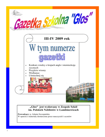 III-IV 2009 rok • • • • Konkurs wiedzy o krajach anglo i niemieckojęzycznych Przyjście wiosny Wielkanoc Uśmiechnij się „Głos” jest wydawany w Zespole Szkół im. Polskich oblistów w Łambinowicach Prowadzący: p. Jolanta Szczepańska W oparciu o materiały dostarczone przez nauczycieli i uczniów 1 Konkurs Wiedzy o Krajach Anglo i iemieckojęzycznych W ramach promocji Gminy Łambinowice w dniach 11 - 16 marca 2009r. w Zespole Szkół w Łambinowicach został zorganizowany Tydzień Kultury Europejskiej. Patronem imprezy był Wójt Gminy Łambinowice. Imprezę rozpropagowano w powiecie nyskim, wysłano wiele zaproszeń do potencjalnych uczestników i gości. Uczestnicy dopisali i sala gimnastyczna została wypełniona do ostatniego miejsca. Nauczyciele języków obcych przygotowali „Konkurs Wiedzy o Krajach Niemiecko i Anglojęzycznych”, w którym wzięli udział uczniowie wraz z opiekunami z dziewięciu szkół (Gimnazjum Diecezjalne w Nysie, Gimnazjum nr 3 w Nysie, Gimnazjum w Otmuchowie, Korfantowie, Ścinawie Małej, Pakosławicach, Paczkowie, Skoroszycach, Zespół Szkół w Łambinowicach). Zadaniem uczestników konkursu było napisanie testu sprawdzającego wiedzę na temat kultury, zwyczajów i geografii krajów niemieckiego i angielskiego obszaru językowego. 2 Po konkursie uczestnicy regenerują siły podczas przygotowanego dla nich poczęstunku. Uczniowie z Zespołu Szkół w Łambinowicach pod kierunkiem nauczycieli przygotowali program artystyczny: -„Snowwhite” przedstawienie w języku angielskim , -koncert piosenek : niemieckich francuskich i angielskich, występ zespołu tanecznego „Rytmix” . Uczestnicy konkursu oraz zaproszeni goście zwiedzili również szkołę - zostali zapoznani z historią gminy i szkoły a także z zamierzeniami i osiągnięciami. 3 4 Po sprawdzeniu prac okazało się, że w „Konkursie Wiedzy o Krajach Niemieckojęzycznych” najwyższą liczbę punktów (52 punkty) uzyskały dwie osoby. O przyznaniu miejsca I i II zdecydowała dogrywka. Komisja konkursowa, w skład której weszli nauczyciele języka angielskiego i niemieckiego ze szkół biorących udział w konkursie, ustaliła następujący werdykt: -w „Konkursie Wiedzy o Krajach Niemieckojęzycznych”: I miejsce – Mateusz Sobala (Gimnazjum w Paczkowie) II miejsce – Paulina Burnus (Gimnazjum nr 3 w Nysie) III miejsce – Jan Grubizna (Gimnazjum Diecezjalne w Nysie) -w „Konkursie Wiedzy o Krajach Anglojęzycznych”: I miejsce – Marta Kornas (Gimnazjum w Otmuchowie) II miejsce – Grzegorz Pusz (Gimnazjum w Paczkowie) III miejsce – Krystian Greniuk (Gimnazjum w Paczkowie). 5 Pierwszy dzień wiosny 21 marca to pierwszy dzień wiosny! Promienieje słoneczne padają prostopadle na równik, obie półkule są równomiernie oświetlone. Dzień i noc mają tę samą długość trwają po 12 godzin. Umówiono się, że wraz z nastaniem astronomicznej wiosny na półkuli północnej zaczyna się wiosna kalendarzowa. Żegnamy, więc zimę i witamy następną porę roku WIOSNĘ. Przyroda budzi się znów do życia, nam jest weselej, radośniej, bo słońce świeci dłużej i jest wyżej na niebie. Weselej jest też zwierzętom i roślinom. Wiosna kojarzy się z ciepłem. Niestety, nie da się łatwo przewidzieć, kiedy nadejdzie wiosna klimatyczna (termiczna), kiedy średnia dobowa temperatura osiągnie wartość od 5 C do 15 C. Na tę "ciepłą wiosnę" musimy jeszcze poczekać. Czekamy na wiosnę nie tylko "ciepłą", ale też "zieloną". Ta wiosna to wiosna enologiczna, przychodzi etapami. I Etap to przedwiośnie, czyli zaranie wiosny, jest niezwykle kapryśne. Krótkie chwile ciepłej, wiosennej pogody często są przerywane nagłymi nawrotami zimy. Jednak przyroda nie zważa na te kaprysy wczesnowiosennej aury i kierowana odwiecznym rytmem budzi się z zimowego snu. Wtedy leszczyna rozpoczyna pylenie, a wraz z nią następujące drzewa i krzewy: olcha czarna, wierzba iwa, topola osika, dereń właściwy. Zakwita wawrzynek wilczełyko, śnieżyczka przebiśnieg, przylaszczka pospolita, ziarnopłon wiosenny, zawilec gajowy, podbiał pospolity. Na podmokłych łąkach i nad strumieniami w górach pojawiają się krokusy. Przylatują też pierwsze ptaki, np. skowronki. II Etap to pierwiośnie, czyli wczesna wiosna. Nazwa tej pory pochodzi od zakwitających wówczas pierwiosnków. Pojawiają się też kwiaty rzeżuchy łąkowej oraz fiołka polnego, czyli popularnego bratka. Pękają pąki i rozwijają się liście kasztanowca zwyczajnego, brzozy brodawkowatej oraz dębu szypułkowego i buka. Zakwitają drzewa i krzewy owocowe, a wśród nich: jabłonie, grusze, wiśnie, czereśnie, porzeczki. W lasach i parkach zakwita czeremcha. III Etap to pełnia wiosny. Zakwitają wówczas następujące rośliny: bez lilak, kasztanowiec zwyczajny, żarnowiec miotlasty, złotokap, jarząb pospolity - tzw. Jarzębina, głóg, narcyz biały, a żyto rozpoczyna kłoszenie. 6 Powitanie wiosny w naszej szkole W ramach programu „Śmieci mniej– ziemi lżej” przeprowadzono w szkole konkurs na ekologiczną Marzannę Klasy wykazały Się ciekawymi pomysłami. Dwa równorzędne pierwsze miejsca zdobyły klasy Ia i Id, drugie miejsce uzyskała klasa IIa. Zdobywcy pierwszego miejsca otrzymali ekologiczne nagrody– jabłka. Wszystkie nagrodzone klasy uhonorowane zostały dyplomami. Marzanny wzbudziły zainteresowanie wśród całej szkolnej społeczności– która wyróżniła prace klasy IId. Niestety kapryśna wiosna dalej bawi się z nami w chowanego sypiąc śniegiem po oczach. Nie tracimy jednak nadziei : przyjdź wreszcie do nas!!! 7 Historia świąt wielkanocnych Wielkanoc (Pascha, Niedziela Wielkanocna) – to jedno z najstarszych i najważniejszych świąt chrześcijańskich obchodzone jako pamiątka zmartwychwstanie Jezusa Chrystusa. Tydzień ją poprzedzający jest zwany Wielkim Tygodniem, w którym wspomina się najistotniejsze dla chrześcijan wydarzenia, a ostatnie dni 