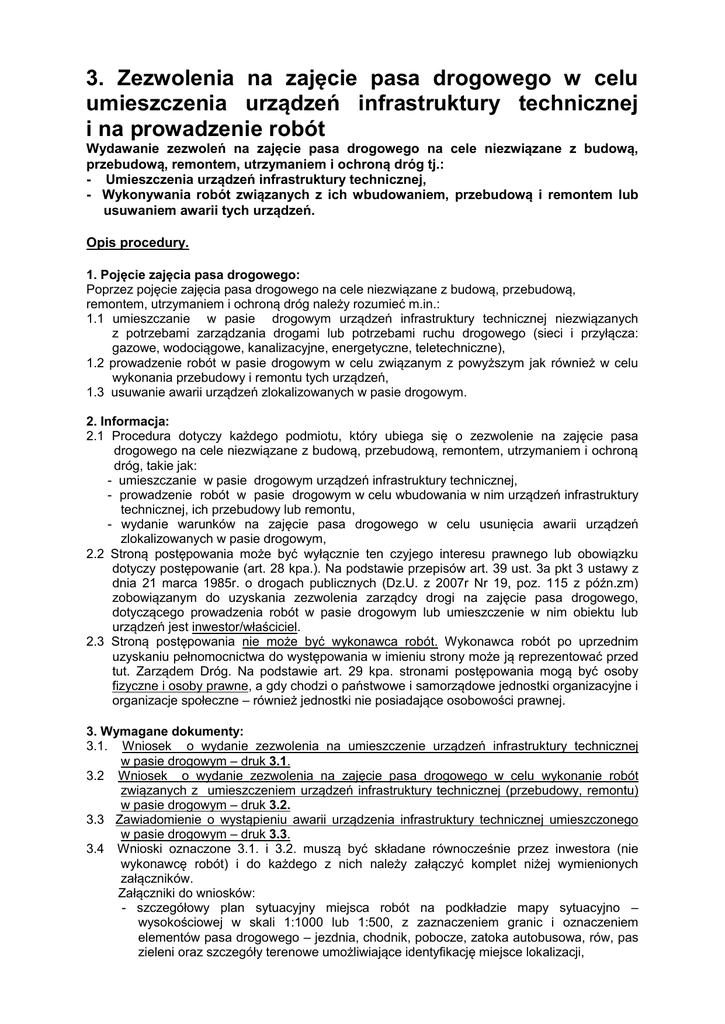 3. Zezwolenia na zajęcie pasa drogowego w celu umieszczenia urządzeń infrastruktury technicznej i na prowadzenie robót Wydawanie zezwoleń na zajęcie pasa drogowego na cele niezwiązane z budową, przebudową, remontem, utrzymaniem i ochroną dróg tj.: - Umieszczenia urządzeń infrastruktury technicznej, - Wykonywania robót związanych z ich wbudowaniem, przebudową i remontem lub usuwaniem awarii tych urządzeń. Opis procedury. 1. Pojęcie zajęcia pasa drogowego: Poprzez pojęcie zajęcia pasa drogowego na cele niezwiązane z budową, przebudową, remontem, utrzymaniem i ochroną dróg należy rozumieć m.in.: 1.1 umieszczanie w pasie drogowym urządzeń infrastruktury technicznej niezwiązanych z potrzebami zarządzania drogami lub potrzebami ruchu drogowego (sieci i przyłącza: gazowe, wodociągowe, kanalizacyjne, energetyczne, teletechniczne), 1.2 prowadzenie robót w pasie drogowym w celu związanym z powyższym jak również w celu wykonania przebudowy i remontu tych urządzeń, 1.3 usuwanie awarii urządzeń zlokalizowanych w pasie drogowym. 2. Informacja: 2.1 Procedura dotyczy każdego podmiotu, który ubiega się o zezwolenie na zajęcie pasa drogowego na cele niezwiązane z budową, przebudową, remontem, utrzymaniem i ochroną dróg, takie jak: - umieszczanie w pasie drogowym urządzeń infrastruktury technicznej, - prowadzenie robót w pasie drogowym w celu wbudowania w nim urządzeń infrastruktury technicznej, ich przebudowy lub remontu, - wydanie warunków na zajęcie pasa drogowego w celu usunięcia awarii urządzeń zlokalizowanych w pasie drogowym, 2.2 Stroną postępowania może być wyłącznie ten czyjego interesu prawnego lub obowiązku dotyczy postępowanie (art. 28 kpa.). Na podstawie przepisów art. 39 ust. 3a pkt 3 ustawy z dnia 21 marca 1985r. o drogach publicznych (Dz.U. z 2007r Nr 19, poz. 115 z późn.zm) zobowiązanym do uzyskania zezwolenia zarządcy drogi na zajęcie pasa drogowego, dotyczącego prowadzenia robót w pasie drogowym lub umieszczenie w nim obiektu lub urządzeń jest inwestor/właściciel. 2.3 Stroną postępowania nie może być wykonawca robót. Wykonawca robót po uprzednim uzyskaniu pełnomocnictwa do występowania w imieniu strony może ją reprezentować przed tut. Zarządem Dróg. Na podstawie art. 29 kpa. stronami postępowania mogą być osoby fizyczne i osoby prawne, a gdy chodzi o państwowe i samorządowe jednostki organizacyjne i organizacje społeczne – również jednostki nie posiadające osobowości prawnej. 3. Wymagane dokumenty: 3.1. Wniosek o wydanie zezwolenia na umieszczenie urządzeń infrastruktury technicznej w pasie drogowym – druk 3.1. 3.2 Wniosek o wydanie zezwolenia na zajęcie pasa drogowego w celu wykonanie robót związanych z umieszczeniem urządzeń infrastruktury technicznej (przebudowy, remontu) w pasie drogowym – druk 3.2. 3.3 Zawiadomienie o wystąpieniu awarii urządzenia infrastruktury technicznej umieszczonego w pasie drogowym – druk 3.3. 3.4 Wnioski oznaczone 3.1. i 3.2. muszą być składane równocześnie przez inwestora (nie wykonawcę robót) i do każdego z nich należy załączyć komplet niżej wymienionych załączników. Załączniki do wniosków: - szczegółowy plan sytuacyjny miejsca robót na podkładzie mapy sytuacyjno – wysokościowej w skali 1:1000 lub 1:500, z zaznaczeniem granic i oznaczeniem elementów pasa drogowego – jezdnia, chodnik, pobocze, zatoka autobusowa, rów, pas zieleni oraz szczegóły terenowe umożliwiające identyfikację miejsce lokalizacji, - ogólny plan orientacyjny w skali 1:10 000 lub 1:25 000 z zaznaczeniem zajmowanego odcinka pasa drogowego, - oświadczenie o posiadaniu ważnego pozwolenia na wbudowanie urządzenia infrastruktury technicznej, umieszczanego w pasie drogowym lub zgłoszenia budowy, przebudowy albo remontu lub prowadzonych robót właściwemu organowi administracji architektoniczno - budowlanej albo kserokopię ważnego pozwolenia na budowę lub zgłoszenia robót, - kopia protokołu ZUDP, - w przypadku, gdy wnioskodawcą jest przedsiębiorca należy załączyć kserokopię aktualnego wypisu z ewidencji działalności gospodarczej lub kserokopię aktualnego wypisu z Krajowego Rejestru Sądowego (wydane nie wcześniej niż 6 miesięcy przed dniem złożenia wniosku - w przypadku dokumentów wydanych z datą wcześniejszą należy przedłożyć kserokopię aktualnie potwierdzoną przez właściwy organ administracyjny lub sąd). - w przypadku spółki cywilnej kserokopia umowy spółki zarejestrowanej we właściwym Urzędzie Skarbowym wraz z wypisem z ewidencji działalności gospodarczej wszystkich wspólników, dodatkowo do wniosku o wydanie zezwolenia na wykonanie robót w celu umieszczenia, przebudowy lub remontu urządzeń infrastruktury technicznej w pasie drogowym: - podaniem we wniosku wymiarów i planowanej powierzchni zajęcia pasa drogowego w zakresie elementów pasa drogowego – jezdnia, chodnik, pobocze, rów, pas zieleni, zatoka autobusowa, - zatwierdzony przez Starostę Powiatu Bocheńskiego projekt organizacji ruchu na czas realizacji zadania, jeżeli zajęcie pasa drogowego dotyczy jezdni, chodników, poboczy i wpływa na ruch drogowy lub ogranicza widoczność na drodze albo powoduje wprowadzenie zmian w istniejącej organizacji ruchu pojazdów albo pieszych lub informację o sposobie zabezpieczenia terenu przewidywanego zajęcia pasa drogowego zgodnie z wymogami bezpieczeństwa ruchu drogowego (jeżeli nie jest wymagany projekt organizacji ruchu), zabezpieczenia robót i uczestników ruchu drogowego, - harmonogram robót w przypadku ich etapowego wykonywania, zawierający dla każdego etapu następujące dane: długość i szerokość zajęcia pasa, okres wykonywania prac. Powiatowy Zarząd Dróg w Bochni może wezwać wnioskodawcę do dostarczenia dodatkowych dokumentów wynikających z indywidualnego charakteru sprawy. 3.5. Zawiadomienie o wystąpieniu awarii urządzenia infrastruktury technicznej umie