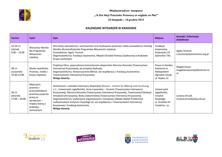 Międzynarodowa kampania „16 Dni Akcji Przeciwko Przemocy ze względu na Płeć” 25 listopada – 10 grudnia 2013 KALENDARZ WYDARZEŃ W KRAKOWIE Termin 23-24.11 (sb/nd) 9:00 – 15:00 28.11 (czwartek) 19:30-22:00 26.11 (wtorek) 17:00 – 20:00 Tytuł Opis Miejsce Warsztaty WenDo dla Programów Aktywności Lokalnej Warsztaty samoobrony i asertywności oraz budowania pewności siebie prowadzone metodą WenDo dla beneficjentek Programów Aktywności Lokalnej. Prowadzenie: Agata Teutsch Organizatorki/rzy: Fundacja Autonomia, Miejski Ośrodek Pomocy Społecznej w Krakowie Grupa zamknięta! Fundacja Autonomia, Krakowska 19 (domofon TIK) Maska twardziela. Przemoc, media i kryzys męskości. Projekcja filmu, poprzedzona komentarzem eksperckim Marcina Dziuroka (Towarzystwo Interwencji Kryzysowej), po projekcji dyskusja. Organizatorki/rzy: Stowarzyszenie AllinUJ, we współpracy z Fundacją Autonomia i Towarzystwem Interwencji Kryzysowej. Wstęp otwarty. Pauza in Garden, kawiarnia w Małopolskim Ogrodzie Sztuki, ul. Rajska 12 Mężczyźni, przemoc i przeciwdziałanie przemocy poprzez pracę ze sprawcami – między teorią a praktyką seminarium Seminarium z udziałem Katarzyny Wojnickiej (Dissens - Institut für Bildung und Forschung e.V., Uniwersytet Jagielloński), Anny Lipowskiej – Teutsch (Towarzystwo Interwencji Kryzysowej), Marcina Dziuroka (Towarzystwo Interwencji Kryzysowej, Towarzystwo Edukacji Antydyskryminacyjnej), Beaty Zadumińskiej (Towarzystwo Interwencji Kryzysowej). Organizatorki/rzy: wydarzenie organizowane z inicjatywy Zakładu Badań Problemów Ludnościowych Instytutu Socjologii UJ, we współpracy z Towarzystwem Interwencji Kryzysowej i Fundacją Autonomia Wstęp otwarty. Uniwersytet Jagielloński, Instytut Socjologii ul. Grodzka 52 Czytelnia, I p. Kontakt i informacje dodatkowe Agata Teutsch a.teutsch[at]autonomia.org.pl Magda Sosna magdalenasosna[at]hotmail.co m Justyna Struzik Justyna.struzik[at]uj.edu.pl Międzynarodowa kampania „16 Dni Akcji Przeciwko Przemocy ze względu na Płeć” 25 listopada – 10 grudnia 2013 30.11/1.12 (sb/nd) 10:00 – 16:30 2.12 (poniedziałek) 17:00 – 20:00 Warsztat WenDo dla studentek, doktorantek i pracownic UJ Consent czyli zgoda. Zgoda czyli dobra komunikacja – warsztaty. Warsztat samoobrony i asertywności oraz budowania pewności siebie prowadzony metodą WenDo dla studentek, doktorantek i pracownic UJ. Organizatorki/rzy: Fundacja Autonomia, Pełnomocniczka Rektora UJ ds. bezpieczeństwa studentów i doktorantów Prowadzenie: Agata Teutsch (Fundacja Autonomia) Liczba miejsc: 12. Standardowo koszt udziału w warsztacie wynosi ok. 200 złotych. Dzięki wsparciu finansowemu UJ możliwe było obniżenie kosztu dla uczestniczek do symbolicznej kwoty 20 zł (pokrycie kosztów materiałów warsztatowych i sali). Pełen opis warsztatu znajdziesz tu Zapisy do 15 listopada 2013. Prosimy o wypełnienie formularza on line. Czy rozmawianie o dotyku może nie być krępujące? A czy może być sexy? Czemu i po co rozmawiać o dotyku? Jak aktywnie się zgadzać i świadomie mówić nie? Czy seks to tylko robienie bez gadania? Czym jest komunikacja w intymnej sytuacji? Czym jest naruszenie czyjejś granicy cielesnej? Przybliżenie idei zgody (consentu), mini warsztat i dyskusja. Koszt udziału to symboliczna kwota 5 zł (na pokrycie kosztów sali) Prowadzenie: Ewelina Zembrzycka (Eve) Organizatorki/rzy: Fundacja Autonomia, Pełnomocniczka Rektora UJ ds. bezpieczeństwa studentów i doktorantów Liczba miejsc: 16. Zapisy do 20 listopada 2013. Prosimy o wypełnienie formularza on line. Fundacja Autonomia, Krakowska 19 (domofon TIK) Fundacja Autonomia, Krakowska 19 (domofon TIK) Agata Teutsch a.teutsch[at]autonomia.org.pl Agata Teutsch a.teutsch[at]autonomia.org.pl Międzynarodowa kampania „16 Dni Akcji Przeciwko Przemocy ze względu na Płeć” 25 listopada – 10 grudnia 2013 Z Sylwią Chutnik, działaczką społeczną i pisarką porozmawiamy o solidarności, walce o sprawiedliwość, zemście, dziewczynach spod znaku riot grrrls oraz o możliwościach/roli osób tworzących sztukę w zakresie przeciwstawiania się przemocy. 3.12 (wtorek) 17:30 – 19:30 „O siebie walczę, o swoje koleżanki. O sprawiedliwość” - spotkanie z Sylwią Chutnik. Sylwia Chutnik jest założycielką i prezeską Fundacji MaMa (zajmuje się prawami matek w Polsce), członkinią Porozumienia Kobiet i przewodniczką miejską po Warszawie, oprowadzającą po autorskich trasach śladami wybitnych kobiet. W 2009 roku otrzymała Społecznego Nobla Ashoki, Sylwia Chutnik jako pisarka jest autorką m.in. "Kieszonkowego atlasu kobiet" (za który w 2009 roku otrzymała Paszport "Polityki"), „Dzidzi”, „Mama ma zawsze rację” oraz „Cwaniar”. Prowadzenie: Agata Teutsch (Fundacja Autonomia), Magda Sosna (Stowarzyszenie AllinUJ) Organizatorki: Fundacja Autonomia, Stowarzyszenie AllinUJ, Pełnomocniczka Rektora UJ ds. bezpieczeństwa Studentów i Doktorantów Wstęp otwarty. Pauza in Garden, kawiarnia w Małopolskim Ogrodzie Sztuki, ul. Rajska 12 Agata Teutsch a.teutsch[at]autonomia.org.pl