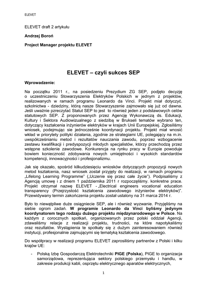 ELEVET ELEVET draft 2 artykułu Andrzej Boroń Project Manager projektu ELEVET ELEVET – czyli sukces SEP Wprowadzenie: Na początku 2011 r., na posiedzeniu Prezydium ZG SEP, podjęto decyzję o uczestniczeniu Stowarzyszenia Elektryków Polskich w jednym z projektów, realizowanych w ramach programu Leonardo da Vinci. Projekt miał dotyczyć. szkolnictwa - dziedziny, którą nasze Stowarzyszenie zajmowało się już od dawna. Jeśli uważnie pzreczytać Statut SEP to jest to również jeden z podstawowych celów statutowych SEP. Z proponowanych przez Agencję Wykonawczą ds. Edukacji, Kultury i Sektora Audiowizualnego z siedzibą w Brukseli tematów wybrano ten, dotyczący kształcenia inżynierów elektryków w krajach Unii Europejskiej. Zgłosiliśmy wniosek, podejmując sie jednocześnie koordynacji projektu. Projekt miał wnosić wkład w priorytety polityki działania, zgodnie ze strategiami UE, polegający na m.in. uwspółcześnianiu metod i rezultatów nauczania zawodu, poprzez wzbogacenie zestawu kwalifikacji i predyspozycji młodych specjalistów, którzy przechodzą przez wstępne szkolenie zawodowe. Konkurencja na rynku pracy w Europie powoduje bowiem konieczność zdobywania nowych umiejętności i wysokich standardów kompetencji, innowacyjności i profesjonalizmu. Jak się okazało, spośród kilkudziesięciu wniosków dotyczących propozycji nowych metod kształcenia, nasz wniosek został przyjęty do realizacji, w ramach programu „Lifelong Learning Programme” („Uczenie się przez całe życie”). Podpisaliśmy z Agencją umowę i z dniem 1 października 2011 r rozpoczęliśmy. konkretne prace. Projekt otrzymał nazwę ELEVET - „Electrical engineers vocational education transparency (Przejrzystość kształcenia zawodowego inżynierów elektryków)”. Przewidywany termin zakończenia projektu został ustalony na 31 marca 2014 r. Było to niewątpliwe duże osiągniecie SEP, ale i również wyzwanie. Przyjęliśmy na siebie ogrom zadań. W programie Leonardo da Vinci byliśmy jedynym koordynatorem tego rodzaju dużego projektu międzynarodowego w Polsce. Na każdym z corocznych spotkań, organizowanych przez polski oddział Agencji, zdawaliśmy relacje z realizacji projektu, trudności, na które napotykaliśmy oraz rezultatów. Wystąpienia te spotkały się z dużym zainteresowaniem również instytucji, profesjonalnie zajmującymi się tematyką kształcenia zawodowego. Do współpracy w realizacji programu ELEVET zaprosiliśmy partnerów z Polski i kilku krajów UE: - Polską Izbę Gospodarczą Elektrotechniki PIGE (Polska), PIGE to organizacja samorządowa, reprezentująca sektory polskiego przemysłu i handlu, w zakresie produkcji kabli, osprzętu elektrycznego aparatów elektrycznych, 1 ELEVET - Societatea Inginerilor Energeticieni din Romania;. SIER (Rumunia) - organizacja krajowa, reprezentująca inżynierów elektryków w Rumunii, - CONSEL-Consorzio ELIS – konsorcjum reprezentujące średnie szkolnictwo zawodowe CONSEL ELIS (Włochy), - SDE College (Dania), która jest jedną z największych uczelni technicznych w Danii; uczelnia składa się ze szkoły zawodowej, średniej i uczelni wyższej, - Hiszpańską Konfederację Ośrodków Edukacyjnych i Szkoleniowych – CECE (Hiszpania); jest to organizacja zawodowa non - profit pracodawców i specjalistów, - European Forum of Technical and Vocational Education and Training – EFVET (Belgia), która jest europejskim stowarzyszeniem działającym na rzecz promocji kształcenia i szkolenia zawodowego w Europie - Firmę DEHN (Polska). Firma wyspecjalizowała się w ochronie odgromowej. Od początku istnienia firmy, którą założył ponad 100 lat temu Hans Dehn w Norymberdze, firma zajmuje się montażem instalacji elektrycznych oraz systemów ochrony odgromowej. szkoli wykonawców i użytkowników oraz produkuje komponenty systemów ochrony odgromowej i uziemienia. Pierwsze spotkanie z partnerami odbyło się 4 listopada 2011 roku w sali posiedzeń ZG SEP w Biurze SEP w Warszawie. Zebranie prowadził Prezes SEP prof. Jerzy Barglik. Dokonano podziału prac, ustalono harmonogram spotkań, harmonogram działań kontrolnych oraz składy Komitetów: Sterującego i Monitorującego. Ustalono, że zgodnie z zawartą z Agencja umową, Stowarzyszenie Elektryków Polskich – jako Koordynator Projektu: a) ponosi odpowiedzialność za wdrożenie działania zgodnie z umową; b) pełni funkcję pośrednika we wszelkiej komunikacji między współbeneficjentami (zwanymi dalej w artykule partnerami) a Agencją; c) odpowiada za dostarczanie Agencji wszelkich dokumentów i informacji wymaganych umową, w szczególności w odniesieniu do wniosków o dokonanie płatności. Koordynator nie może przekazać żadnej części tych zadań współbeneficjentom ani osobom trzecim. W przypadku konieczności uzyskania danych od współbeneficjentów, koordynator odpowiada za ich uzyskanie, weryfikację i przekazanie Agencji; d) zawiadamia współbeneficjentów i Agencję o wszelkich wiadomych mu wydarzeniach mogących znacząco wpłynąć na wdrożenie działania; e) powiadamia Agencję o przeniesieniach pomiędzy pozycjami kosztów kwalifikowanych; f) dokonuje, w razie potrzeby, odpowiednich ustaleń w celu zapewnienia gwarancji finansowej; g) sporządza w imieniu beneficjentów i zgodnie z umową wnioski o dokonanie płatności, ustala szacunkowe koszty kwalifikowane oraz rzeczywiście poniesione koszty. h) jako wyłączny odbiorca płatności w imieniu wszystkich beneficjentów zapewnia przekazywanie odpowiednich płatności współbeneficjentom bez nieuzasadnionej zwłoki, a także składając sprawozdania i w każdym czasie na prośbę Agencji, informuje Agencję o rozdysponowaniu środków 2 ELEVET finansowych Unii Europejskiej pomiędzy beneficjentami oraz o dacie dokonania przelewu; i) w przypadku audytów, kontroli lub ocen odpowiada za udostępnienie wszelkich niezbędnych dokumentów, wliczając w to księgi rachunkowe ws
