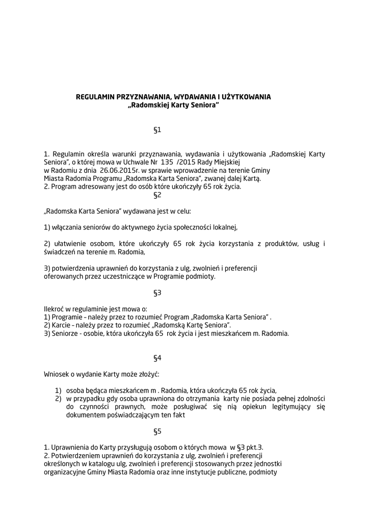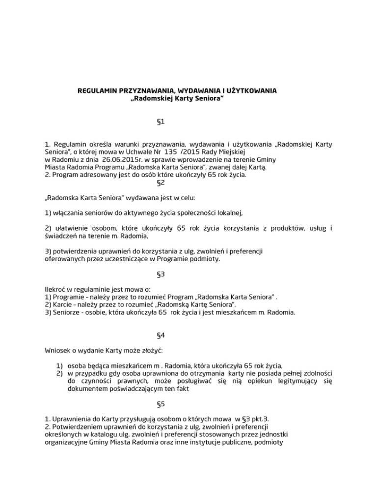 REGULAMIN PRZYZNAWANIA, WYDAWANIA I UŻYTKOWANIA „Radomskiej Karty Seniora” §1 1. Regulamin określa warunki przyznawania, wydawania i użytkowania „Radomskiej Karty Seniora”, o której mowa w Uchwale Nr 135 /2015 Rady Miejskiej w Radomiu z dnia 26.06.2015r. w sprawie wprowadzenie na terenie Gminy Miasta Radomia Programu „Radomska Karta Seniora”, zwanej dalej Kartą. 2. Program adresowany jest do osób które ukończyły 65 rok życia. §2 „Radomska Karta Seniora” wydawana jest w celu: 1) włączania seniorów do aktywnego życia społeczności lokalnej, 2) ułatwienie osobom, które ukończyły 65 rok życia korzystania z produktów, usług i świadczeń na terenie m. Radomia, 3) potwierdzenia uprawnień do korzystania z ulg, zwolnień i preferencji oferowanych przez uczestniczące w Programie podmioty. §3 Ilekroć w regulaminie jest mowa o: 1) Programie – należy przez to rozumieć Program „Radomska Karta Seniora” . 2) Karcie – należy przez to rozumieć „Radomską Kartę Seniora”. 3) Seniorze - osobie, która ukończyła 65 rok życia i jest mieszkańcem m. Radomia. §4 Wniosek o wydanie Karty może złożyć: 1) osoba będąca mieszkańcem m . Radomia, która ukończyła 65 rok życia, 2) w przypadku gdy osoba uprawniona do otrzymania karty nie posiada pełnej zdolności do czynności prawnych, może posługiwać się nią opiekun legitymujący się dokumentem poświadczającym ten fakt §5 1. Uprawnienia do Karty przysługują osobom o których mowa w §3 pkt.3. 2. Potwierdzeniem uprawnień do korzystania z ulg, zwolnień i preferencji określonych w katalogu ulg, zwolnień i preferencji stosowanych przez jednostki organizacyjne Gminy Miasta Radomia oraz inne instytucje publiczne, podmioty komercyjne oraz organizacje pozarządowe jest Karta. 3. Uzyskanie Karty odbywa się na wniosek złożony w Urzędzie Miejskim w Radomiu w Wydziale Zdrowia i Polityki Społecznej. Wzór wniosku określa załącznik nr 1 do Regulaminu. 4. W przypadku wystąpienia w dniu składania wniosku braków formalnych należy je uzupełnić w terminie odbioru Karty. W przypadku nie uzupełnienia braków Karta nie zostanie wydana. 5. Karta będzie wydawana na czas nieokreślony. 6. Zmiana danych osobowych użytkownika Karty lub jej zagubienie wymaga wydania nowej Karty. 7.Prezydent Miasta Radomia wydaje Kartę w terminie do 30 dni od dnia złożenia wniosku po weryfikacji uprawnień do jej uzyskania. 8. Karta będzie wydawana bezpłatnie w formie karty zawierającej numer karty, imię i nazwisko osoby uprawnionej, termin ważności Karty oraz hologram. 9. Odbiór Karty następuje przez Wnioskodawcę lub opiekuna w Urzędzie Miejskim w Radomiu w Wydziale Zdrowia i Polityki Społecznej. O terminie odbioru Wnioskodawca zostanie poinformowany e-mailem lub telefonicznie. W przypadku braku adresu e-mail lub telefonu informacja zostanie przesłana na adres zamieszkania. 10. Karta jest ważna wyłącznie z dokumentem potwierdzającym tożsamość. 11. Osoby uprawnione do korzystania z Karty nie mogą jej użyczać osobom trzecim pod karą cofnięcia uprawnień. W przypadku posługiwania się Kartą przez osoby nieuprawnione podmiot współpracujący w ramach Programu ma obowiązek zatrzymać Kartę i przekazać ją do Urzędu Miejskiego w Radomiu do Wydziału Zdrowia i Polityki Społecznej. 12. O fakcie utraty lub zniszczenia Karty Wnioskodawca zobowiązany jest niezwłocznie poinformować pisemnie Urząd Miejski w Radomiu Wydział Zdrowia i Polityki Społecznej. Ponowne wydanie Karty nastąpi na wniosek, o którym mowa w § 5 pkt. 3 Regulaminu. 13. Karta, której zniszczenie lub utrata została zgłoszona do Urzędu Miejskiego w Radomiu do Wydziału Zdrowia i Polityki Społecznej, podlega wpisowi w rejestrze kart zniszczonych i utraconych. 14. Użytkownik Karty może zrezygnować z jej korzystania w dowolnym momencie wraz z jednoczesnym jej zwrotem oraz złożeniem stosownego oświadczenia na piśmie w Urzędzie Miejskim w Radomiu w Wydziale Zdrowia i Polityki Społecznej. 15.Karta nie jest kartą płatniczą, kredytową, bankomatową, ani też nie zastępuje żadnej formy płatności. 15.Karta jest własnością Gminy Miasta Radomia. §6 1. Katalog ulg i preferencji będzie publikowany na stronie internetowej Urzędu Miejskiego Radomiu www.radom.pl w zakładce pomoc społeczna oraz na tablicy ogłoszeń Wydziału Zdrowia i Polityki Społecznej Urzędu Miejskiego w Radomiu. 2. Katalog ulg i preferencji będzie przygotowywany i aktualizowany w porozumieniu z jednostkami organizacyjnymi Gminy Miasta Radomia oraz innymi instytucjami publicznymi, podmiotami komercyjnymi oraz organizacjami pozarządowymi, które w ramach świadczonych przez siebie usług będą realizować ulgi, preferencje dla mieszkańców m. Radomia w wieku powyżej 65 roku życia. 3. Podmioty inne niż jednostki organizacyjne Gminy Miasta Radomia wyrażające chęć włączenia się do przedsięwzięcia winny złożyć deklaracje do Prezydenta Miasta Radomia według wzoru określonego załącznikiem nr 2 do Regulaminu. 4. Podmioty, o których mowa w ust. 3, w celu realizacji Programu winny podpisać stosowne porozumienie z Prezydentem Miasta Radomia. §7 Prezydent Miasta Radomia będzie przedkładał Radzie Miejskiej w Radomiu sprawozdania z realizacji Programu „Radomska Karta Seniora” do dnia 30 czerwca każdego roku za rok poprzedni. Sprawozdanie będzie obejmować w szczególności dane dotyczące: a) liczby wydanych Kart, b) liczby złożonych wniosków, c) liczby wniosków rozpatrzonych pozytywnie, d) liczby wniosków rozpatrzonych negatywnie, e) liczby i tematyki skarg w zakresie wydawania Karty. f) liczby kart zniszczonych i utraconych. §8 Gmina Miasta Radomia nie ponosi odpowiedzialności za zniżki, ulgi i preferencje proponowane posiadaczom Karty przez inne instytucje publiczne, podmioty komercyjne oraz organizacje pozarządowe, które przystąpią do Programu. §9 Zmiany niniejszego regulaminu dokonywane s