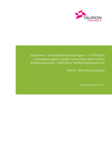 Normy i dokumenty związane Normy: [N1] PN-EN 61082-1:2015 Przygotowanie dokumentów używanych w elektrotechnice – Część 1: Podstawowe zasady. [N2] PN-EN 60617-2:2003 Symbole graficzne stosowane w schematach. – Część 2: Elementy symboli, symbole rozróżniające i inne symbole ogólnego zastosowania. [N3] PN-EN 60617-3:2003 Symbole graficzne stosowane w schematach. – Część 3: Przewody i osprzęt łączeniowy. [N4] PN-EN 60617-4:2003 Symbole graficzne stosowane w schematach. – Część 4: Podstawowe podzespoły bierne. [N5] PN-EN 60617-5:2004 Symbole graficzne stosowane w schematach. – Część 5: Przyrządy półprzewodnikowe i lampy elektronowe. [N6] PN-EN 60617-6:2004 Symbole graficzne stosowane w schematach. – Część 6: Wytwarzanie i przekształcanie energii elektrycznej. [N7] PN-EN 60617-7:2004 Symbole graficzne stosowane w schematach. – Część 7: Aparatura łączeniowa, sterownicza i zabezpieczeniowa. [N8] PN-EN 60617-8:2004 Symbole graficzne stosowane w schematach. – Część 8: Przyrządy pomiarowe, lampy i urządzenia sygnalizacyjne. [N9] PN-EN 60617-9:2002 Symbole graficzne stosowane w schematach. – Część 9: Łączniki i urządzenia peryferyjne. [N10] PN-EN 60617-10:2002 Symbole graficzne stosowane w schematach. – Część 10: Telekomunikacja – Transmisja. [N11] PN-EN 60617-11:2004 Symbole graficzne stosowane w schematach. – Część 11: Architektoniczne i topograficzne plany i schematy instalacji elektrycznych. [N12] PN-EN 60617-12:2002 Symbole graficzne stosowane w schematach. – Część 12: Elementy logiczne binarne. [N13] PN-EN 60617-13:1998 Symbole graficzne stosowane w schematach. – Część 13: Elementy analogowe. Załącznik nr 1 do Standard technicznego nr 11/DTS/2016 – wymagania ogólne, zasady wykonywania dokumentacji projektowych stacji 110kV/SN w TAURON Dystrybucja S.A.(wersja pierwsza) Strona 2 z 5 Akty prawne: [U1] Ustawa z dnia 7 lipca Dz. U. z 2016 r., poz. 290. 1994 r. - Prawo budowlane. Tekst jednolity: [U2] Ustawa z dnia 3 października 2008 r. o udostępnienie informacji o środowisku i jego ochronie, udziale społeczeństwa w ochronie środowiska oraz o ocenach oddziaływania na środowisko. Tekst jednolity: Dz.U. 2016 poz. 353. [U3] Ustawa z dnia 27 marca 2003 r. o planowaniu i zagospodarowaniu przestrzennym. Dz. U. z 2015 r., poz. 199, z późniejszymi zmianami. [U4] Ustawa z dnia 27 kwietnia 2001 r. - Prawo ochrony środowiska. Dz. U. z 2013r., poz. 1232, z późniejszymi zmianami. [U5] Ustawa z dnia 16 kwietnia 2004 r. o ochronie przyrody. Dz. U. z 2015 r., poz. 1651, z późniejszymi zmianami. [U6] Ustawa z dnia 9 czerwca 2011 r. - Prawo geologiczne i górnicze. Dz. U. z 2015 r., poz. 196, z późniejszymi zmianami. [U7] Ustawa z dnia 18 lipca 2001 r. - Prawo wodne. Dz. U. z 2015 r., poz. 469, z późniejszymi zmianami. [U8] Ustawa z dnia 10 kwietnia 1997 r. - Prawo energetyczne. Dz. U. z 2012 r. poz. 1059, z późniejszymi zmianami. [U9] Ustawa z dnia 17 maja 1989 r. - Prawo geodezyjne i kartograficzne. Dz. U. z 2015 r. poz. 520, z późniejszymi zmianami. [U10] Ustawa z dnia 24 sierpnia 1991 r. o ochronie przeciwpożarowej. Dz. U. z 2016 r., poz. 191, z późniejszymi zmianami. [U11] Ustawa z dnia 21 marca 1985 r. o drogach publicznych. Dz. U. z 2015 r., poz. 460, z późniejszymi zmianami. [U12] Ustawa z dnia 29 stycznia 2004 r. - Prawo zamówień publicznych. Tekst jednolity: Dz. U. z 2015 r., poz. 2164. [U13] Ustawa z dnia 21 sierpnia 1997 r. o gospodarce nieruchomościami. Dz. U. z 2015 r., poz. 1774, z późniejszymi zmianami. [U14] Rozporządzenie Ministra Infrastruktury z dnia 12 kwietnia 2002 r. w sprawie warunków technicznych, jakim powinny odpowiadać budynki i ich usytuowanie. Tekst jednolity: Dz. U. z 2015r., poz. 1422. [U15] Rozporządzenia Ministra Gospodarki z dnia 4 maja 2007 r. w sprawie szczegółowych warunków funkcjonowania systemu elektroenergetycznego. Dz. U. z 2007r. Nr 93, poz. 623, z późniejszymi zmianami. [U16] Rozporządzenie Ministra Transportu, Budownictwa i Gospodarki Morskiej z dnia 25 kwietnia 2012 r. w sprawie szczegółowego zakresu i formy projektu budowlanego. Dz. U. z 2012r., poz. 462, z późniejszymi zmianami. [U17] Rozporządzenie Ministra Infrastruktury z dnia 23 czerwca 2003 r. w sprawie informacji dotyczącej bezpieczeństwa i ochrony zdrowia oraz planu bezpieczeństwa i ochrony zdrowia. Dz. U. z 2003 r. Nr 120, poz. 1126. [U18] Rozporządzenie Ministra Infrastruktury z dnia 2 września 2004 r w sprawie szczegółowego zakresu i formy dokumentacji projektowej, specyfikacji technicznych wykonania i odbioru robót budowlanych oraz programu funkcjonalno-użytkowego. Tekst jednolity: Dz.U z 2013r., poz. 1129. Załącznik nr 1 do Standard technicznego nr 11/DTS/2016 – wymagania ogólne, zasady wykonywania dokumentacji projektowych stacji 110kV/SN w TAURON Dystrybucja S.A.(wersja pierwsza) Strona 3 z 5 [U19] Rozporządzenie Ministra Infrastruktury z dnia 18 maja 2004r. w sprawie określenia metod i podstaw sporządzania kosztorysu inwestorskiego, obliczanie planowanych kosztów prac projektowych oraz planowanych kosztów robót budowlanych określonych w programie funkcjonalno-użytkowym. Tekst jednolity: Dz. U. z 2004 r. Nr 130, poz. 1389. [U20] Rozporządzenie Ministra Środowiska z dnia 2 lipca 2010 r. w sprawie zgłoszenia instalacji wytwarzających pola elektromagnetyczne. Tekst jednolity Dz. U. z 2010 r. Nr 130, poz. 879. [U21] Rozporządzenie Ministra Spraw Wewnętrznych i Administracji z dnia 14 grudnia 2015 r. w sprawie uzgadniania projektu budowlanego pod względem ochrony przeciwpożarowej. Tekst jednolity: Dz. U. z 2015 r., poz. 2117. Załącznik nr 1 do Standard technicznego nr 11/DTS/2016 – wymagania ogólne, zasady wykonywania dokumentacji projektowych stacji 110kV/SN w TAURON Dystrybucja S.A.(wersja pierwsza) Strona 4 z 5 Dokumenty TAURON Dystrybucja S.A.: [T1] Standard techniczny nr 3/DTS/2015 – oznaczenia projektowe obiektów i urządzeń z