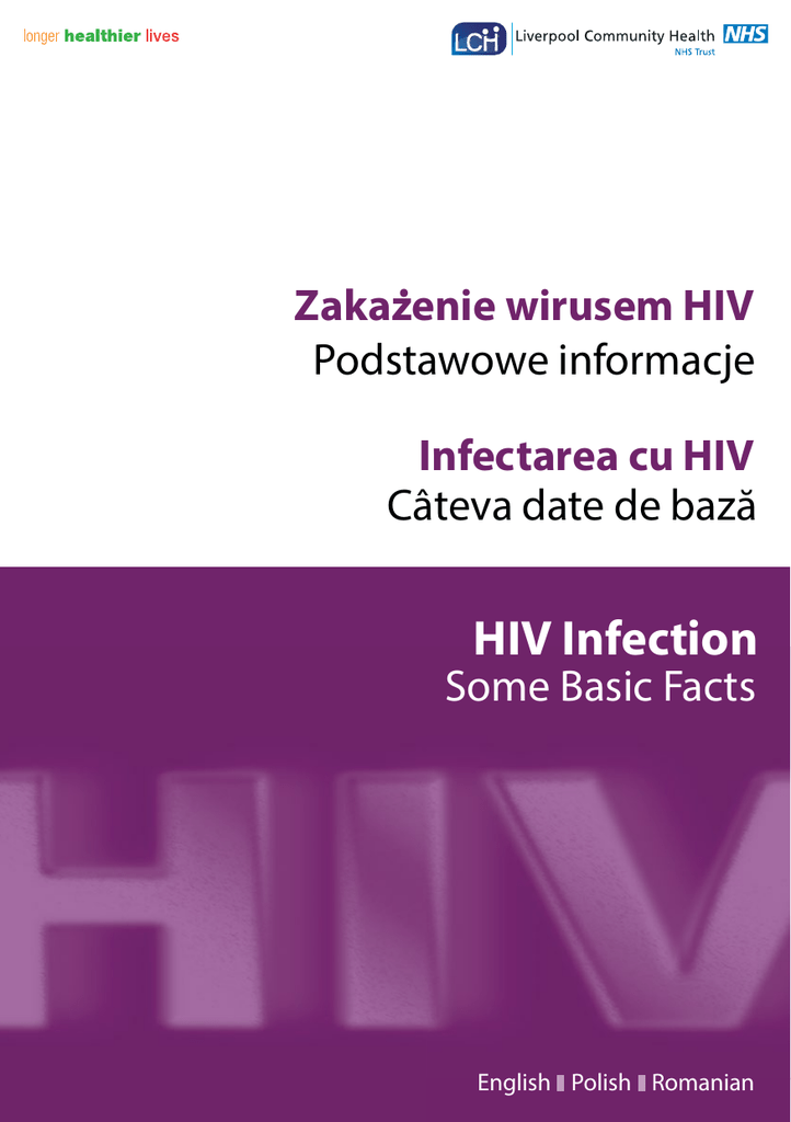 . Zakazenie wirusem HIV Podstawowe informacje Infectarea cu HIV Câteva date de bază HIV Infection Some Basic Facts English Polish Romanian HIV is a virus which can lead to AIDS HIV to wirus, który może doprowadzić do zachorowania na AIDS HIV este un virus care poate conduce la SIDA HIV can pass from one person to another by: Wirusem HIV można zarazić się w następujący sposób: HIV poate fi transmis de la o persoana la alta în următoarele modalităţi: • H aving sexual intercourse without a condom with someone who has HIV • Przez stosunek seksualny bez prezerwatywy z osobą zarażoną • Prin contact sexual cu o persoană infectată, fără utilizarea prezervativului •B y using a needle or syringe which has already been used by someone who has HIV • Przez użycie igły lub strzykawki, której używała osoba zakażona • Prin folosirea unui ac sau a unei seringi utilizate anterior de o persoană infectată • From someone who has HIV to her baby •Z akażona matka może przekazać go swojemu dziecku •D e la o mamă infectată la făt • By receiving infected blood via transfusion • Przez transfuzję zakażonej krwi • Prin transfuzia de sânge infectat HIV cannot pass from one person to another by: Wirusem HIV nie można zarazić się przez: HIV nu se transmite de la o persoană la alta prin: • Sharing crockery and cutlery • Korzystanie z tych samych naczyń i sztućców • Folosirea în comun a veselei şi tacâmurilor • Eating food prepared by someone with HIV • Spożywanie jedzenia przygotowanego przez osobę zarażoną • Consumarea de alimente preparate de o persoană infectată cu HIV • Insect or animal bites • Ugryzienia owadów czy zwierząt • Înţepăturile insectelor sau muşcăturile animalelor • Touching, hugging, kissing or shaking hands • Dotyk, przytulanie, całowanie czy uścisk dłoni • Atingere, îmbrăţişare, sărut sau strânsul mâinii You can have a blood test to find out if you have HIV. If you are infected, you can have treatment in the UK which can prevent you from becoming sick. Badanie krwi pozwoli stwierdzić, czy doszło do zakażenia HIV. Osoby zakażone mogą poddać się leczeniu w Wielkiej Brytanii, które może zapobiec rozwojowi choroby. Vă puteţi face o analiză a sângelui pentru a afla dacă sunteţi purtătorul virusului HIV. Dacă sunteţi infectat, în Marea Britanie puteţi primi tratament care previne îmbolnăvirea. This test is free and confidential. Badanie jest bezpłatne i poufne. Această analiză este gratuită şi confidenţială. To avoid getting HIV or passing HIV to someone else always use condoms for oral, anal or vaginal sex. Aby zapobiec zarażeniu się wirusem HIV lub przekazaniu go komuś innemu, należy zawsze używać prezerwatyw, uprawiając seks oralny, analny i pochwowy. Pentru a preveni infectarea cu HIV sau transmiterea virusului unei alte persoane, folosiţi întotdeauna prezervativul atunci când aveţi contact sexual oral, anal sau vaginal. For free condoms or confidential advice and help contact the nurses at the drop in session(s) Darmowe prezerwatywy oraz poufne porady i pomoc można uzyskać od pielęgniarek podczas sesji poradni bez konieczności wcześniejszych zapisów Pentru a primi prezervative gratuite, dar şi pentru sfaturi confidenţiale şi ajutor, adresaţi-vă asistenţilor medicali în cadrul sesiunii/sesiunilor cu participare liberă day, date dzień, data ziua, data time godzina ora or by contacting Bob Downes or Pauline Jelliman (Specialist HIV Nurses) lub kontaktujące się z Bobem Downesem albo Pauline Jelliman (specjalistycznym pielęgniarzem i specjalistyczną pielęgniarką ds. HIV) sau adresaţi-vă lui Bob Downes sau lui Pauline Jelliman (Asistenţi medicali specialitatea HIV) Hartington Road Family Health Clinic Hartington Road, Liverpool, L8 0SY 0151 285 2802 English only Tylko w języku angielskim Exclusiv în limba engleză Answerphone Automatyczna sekretarka Robot telephonic Interpreters will be arranged if required. W razie potrzeby można uzyskać pomoc tłumacza ustnego. Dacă este necesar, vor fi puşi la dispoziţie interpreţi. Produced by the LCH HIV Service © 2014 Designed by Creative Services, Cheshire and Merseyside Commissioning Support Unit.