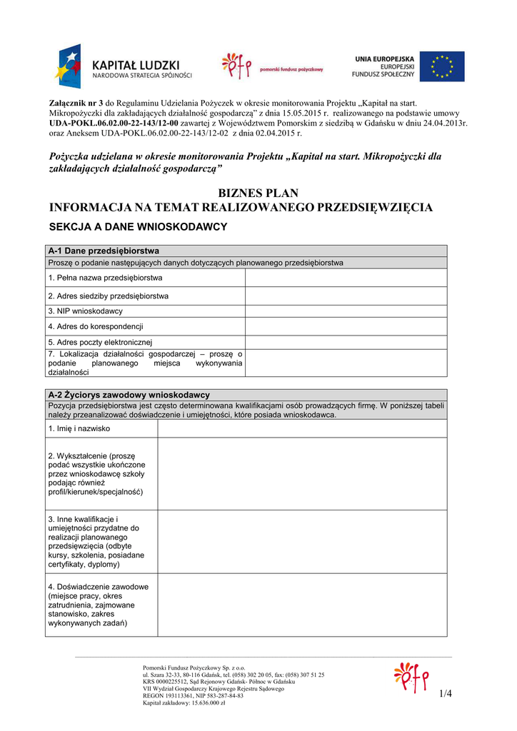 Załącznik nr 3 do Regulaminu Udzielania Pożyczek Po w okresie monitorowania Projektu „Kapitał na start. Mikropożyczki dla zakładających cych działalno działalność gospodarczą” z dnia 15.05.2015 r. realizowanego na podstawie umowy UDA-POKL.06.02.00-22-143/12-00 zawartej z Województwem Pomorskim z siedzibą siedzibą w Gdańsku Gdań w dniu 24.04.2013r. oraz Aneksem UDA-POKL.06.02.00-22 22-143/12-02 z dnia 02.04.2015 r. Pożyczka udzielana w okresie monitorowania Projektu „Kapitał Kapitał na start. Mikropożyczki Mikropo dla zakładających działalność gospodarczą” gospodarcz BIZNES PLAN INFORMACJA NA TEMAT REALIZOWANEGO PRZEDSIĘWZIĘCIA PRZEDSIĘ SEKCJA A DANE WNIOSKODAWCY A-1 Dane przedsiębiorstwa Proszę o podanie następujących cych danych dotyczących dotycz planowanego przedsiębiorstwa 1. Pełna nazwa przedsiębiorstwa 2. Adres siedziby przedsiębiorstwa 3. NIP wnioskodawcy 4. Adres do korespondencji 5. Adres poczty elektronicznej 7. Lokalizacja działalności ci gospodarczej – proszę o podanie planowanego miejsca wykonywania działalności A-2 Życiorys yciorys zawodowy wnioskodawcy Pozycja przedsiębiorstwa jest często ęsto determinowana kwalifikacjami osób prowadzących prowadz firmę ę. W poniższej tabeli należy przeanalizować doświadczenie wiadczenie i umiejętności, umiej które posiada wnioskodawca. 1. Imię i nazwisko 2. Wykształcenie (proszę podać wszystkie ukończone przez wnioskodawcę szkoły podając również profil/kierunek/specjalność) 3. Inne kwalifikacje i umiejętności przydatne do realizacji planowanego przedsięwzięcia (odbyte kursy, szkolenia, posiadane certyfikaty, dyplomy) 4. Doświadczenie zawodowe (miejsce pracy, okres zatrudnienia, zajmowane stanowisko, zakres wykonywanych zadań) ____________________________________________________________________________________________________________________________ ____________________________________________________________________________________________________________________________ Pomorski Fundusz Pożyczkowy Po Sp. z o.o. ul. Szara 32-33, 33, 80-116 80 Gdańsk, tel. (058) 302 20 05, fax: (058) 307 51 25 KRS 0000225512, Sąd Są Rejonowy Gdańsk- Północ w Gdańsku VII Wydział Gospodarczy Krajowego Rejestru Sądowego S REGON 193113361, NIP 583-287-84-83 583 Kapitał zakładowy: 15.636.000 zł 1/4 SEKCJA B OPIS PLANOWANEGO PRZEDSIĘWZIĘCIA PRZEDSI B-1 Opis planowanego przedsięwzię ęwzięcia Proszę określić przedmiot, formę ę organizacyjno – prawną, formę rozliczeń z urzędem dem skarbowym oraz opisa opisać planowane przedsięwzięcie 1. Rodzaj działalności ci (handel, produkcja, usługi, transport, budownictwo ) – według wiodącego wiodą PKD 2. Forma organizacyjno – prawna (osoba fizyczna prowadząca działalność gospodarczą/spółka ą/spółka cywilna) 3. Krótka charakterystyka planowanego przedsięwzięcia cia ( przedmiot i zakres działalności działalno będącej cej przedmiotem inicjatywy, motywy założenia zało przedsiębiorstwa biorstwa i krótkie uzasadnienie wyboru bran branży) B-2 Personel przedsiębiorcy - jeśli śli dotyczy Proszę scharakteryzować przewidywany poziom i struktur strukturę zatrudnienia w przedsiębiorstwie. ębiorstwie. Nale Należy opisać planowane do utworzenia stanowiska pracy - z wyłączeniem właściciela (opis stanowiska, zakres czynności czynno na każdym stanowisku) . Jaki jest związek ązek pomi pomiędzy istotą inwestycji oraz tymi stanowiskami pracy? Stanowisko ( liczba etatów) Charakterystyka SEKCJA C PLAN MARKETINGOWY C-1 Opis produktu / usługi Proszę opisać swój produkt/ usługę. ę. Pokazać Pokaza w jaki sposób różni się on od produktów konkurencji i na czym polega jego przewaga? 1. Proszę opisać produkty/usługi oraz określić dla nich rynek. 2. Proszę podać w jaki sposób produkt/usługa różni się od produktów/ usług konkurencji – wskazać również zalety różnicujące go od innych produktów/usług oferowanych na rynku. Czy jest to nowy produkt/usługa na rynku? C-2 Charakterystyka rynku 1. Kim będą nabywcy produktów i usług? Nazwa i adres % Sprzedaży Termin zapłaty w dniach ____________________________________________________________________________________________________________________________ ____________________________________________________________________________________________________________________________ Pomorski Fundusz Pożyczkowy Po Sp. z o.o. ul. Szara 32-33, 33, 80-116 80 Gdańsk, tel. (058) 302 20 05, fax: (058) 307 51 25 KRS 0000225512, Sąd Są Rejonowy Gdańsk- Północ w Gdańsku VII Wydział Gospodarczy Krajowego Rejestru Sądowego S REGON 193113361, NIP 583-287-84-83 583 Kapitał zakładowy: 15.636.000 zł 2/4 2. Kim będą dostawcy surowców, towarów (rozproszeni, wielu, główni, dominuj dominujący ) Nazwa i adres Udział % w dostawach Termin zapłaty 3. Czy produkty i usługi są przeznaczone na rynek lokalny, regionalny, krajowy czy eksport? (planowana struktura procentowa) 4. Jakie są oczekiwania i potrzeby nabywców odnośnie odno produktów i usługi? W jakim stopniu oferta przedsiębiorstwa odpowiadała będzie ędzie na te potrzeby? 5. Czy popyt na produkt/ usługę będzie ędzie ulegał sezonowym zmianom? Jeśli tak, jak będą ędą minimalizowane skutki tej sezonowości? ści? C-3 Konkurencja na rynku 1. Główni konkurenci na rynku. Podaj, ilu występuje wyst na obszarze Twojego działania, jacy są: ą: mali, czy są to duże firmy, jak wygląda da nasycenie rynku, na czym polega Twoja przewaga nad nimi, a w czym nie jeste jesteś w stanie im zagrozić 2.Podaj trzech głównych konkurentów Nazwa Silne strony Słabe strony 3. Proszę opisać potencjalne działania swoich konkurentów oraz swoją swoj reakcję na te działania. C-4 Dystrybucja i promocja Proszę opisać w jaki sposób będzie ędzie prowadzona sprzedaż sprzeda i promocja. Proszę pamiętać, ę ć, że ż są różne metody promowania