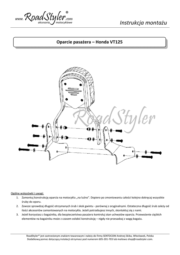 www. ® RoadStyler.com akcesoria motocyklowe Instrukcja montażu Oparcie pasażera – Honda VT125 RoadStyler Ogólne wskazówki i uwagi: 1. Zamontuj konstrukcję oparcia na motocyklu „na luźno”. Dopiero po zmontowaniu całości kolejno dokręcaj wszystkie śruby do oporu. 2. Zawsze sprawdzaj długość otrzymanych śrub i skok gwintu - porównaj z oryginalnymi. Ostateczna długość śrub zależy od ilości akcesoriów zamontowanych na motocyklu. Jeżeli potrzebujesz innych, skontaktuj się z nami. 3. Jeżeli korzystasz z bagażnika, dla bezpieczeństwa pasażera kontroluj stan uchwytów oparcia. Przewożenie ciężkich elementów na bagażniku może z czasem osłabić konstrukcję – nigdy nie przesadzaj z wagą bagażu. RoadStyler® jest zastrzeżonym znakiem towarowym i należy do firmy SENTOCOM Andrzej Skiba, Włocławek, Polska Dodatkową pomoc dotyczącą instalacji otrzymasz pod numerem 605-201-703 lub mailowo [email protected].
