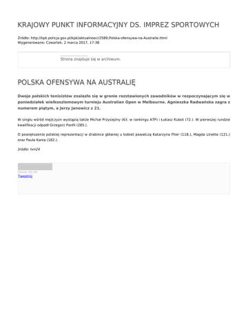 KRAJOWY PUNKT INFORMACYJNY DS. IMPREZ SPORTOWYCH Źródło: http://kpk.policja.gov.pl/kpk/aktualnosci/2589,Polska-ofensywa-na-Australie.html Wygenerowano: Czwartek, 2 marca 2017, 17:38 Strona znajduje się w archiwum. POLSKA OFENSYWA NA AUSTRALIĘ Dwoje polskich tenisistów znalazło się w gronie rozstawionych zawodników w rozpoczynającym się w poniedziałek wielkoszlemowym turnieju Australian Open w Melbourne. Agnieszka Radwańska zagra z numerem piątym, a Jerzy Janowicz z 21. W singlu wśród mężczyzn wystąpią także Michał Przysiężny (63. w rankingu ATP) i Łukasz Kubot (72.). W pierwszej rundzie kwalifikacji odpadł Grzegorz Panfil (285.). O powiększenie polskiej reprezentacji w drabince głównej u kobiet powalczą Katarzyna Piter (118.), Magda Linette (121.) oraz Paula Kania (182.). źródło: tvn24 Ocena: 0/5 (0) Tweetnij