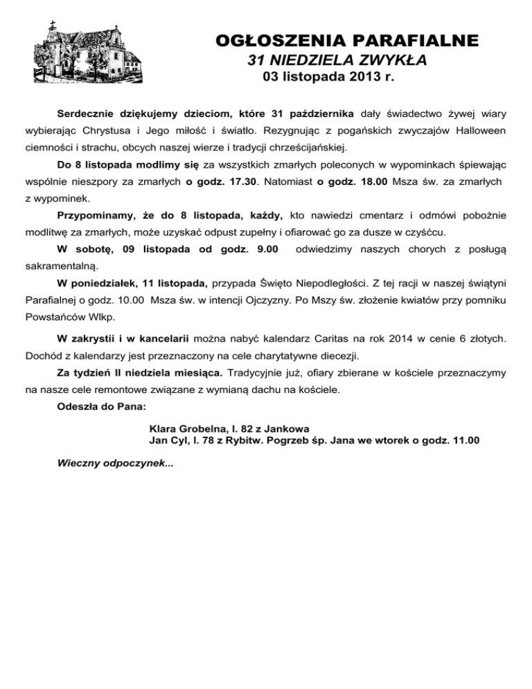 OGŁOSZENIA PARAFIALNE 31 NIEDZIELA ZWYKŁA 03 listopada 2013 r. Serdecznie dziękujemy dzieciom, które 31 października dały świadectwo żywej wiary wybierając Chrystusa i Jego miłość i światło. Rezygnując z pogańskich zwyczajów Halloween ciemności i strachu, obcych naszej wierze i tradycji chrześcijańskiej. Do 8 listopada modlimy się za wszystkich zmarłych poleconych w wypominkach śpiewając wspólnie nieszpory za zmarłych o godz. 17.30. Natomiast o godz. 18.00 Msza św. za zmarłych z wypominek. Przypominamy, że do 8 listopada, każdy, kto nawiedzi cmentarz i odmówi pobożnie modlitwę za zmarłych, może uzyskać odpust zupełny i ofiarować go za dusze w czyśćcu. W sobotę, 09 listopada od godz. 9.00 odwiedzimy naszych chorych z posługą sakramentalną. W poniedziałek, 11 listopada, przypada Święto Niepodległości. Z tej racji w naszej świątyni Parafialnej o godz. 10.00 Msza św. w intencji Ojczyzny. Po Mszy św. złożenie kwiatów przy pomniku Powstańców Wlkp. W zakrystii i w kancelarii można nabyć kalendarz Caritas na rok 2014 w cenie 6 złotych. Dochód z kalendarzy jest przeznaczony na cele charytatywne diecezji. Za tydzień II niedziela miesiąca. Tradycyjnie już, ofiary zbierane w kościele przeznaczymy na nasze cele remontowe związane z wymianą dachu na kościele. Odeszła do Pana: Klara Grobelna, l. 82 z Jankowa Jan Cyl, l. 78 z Rybitw. Pogrzeb śp. Jana we wtorek o godz. 11.00 Wieczny odpoczynek...