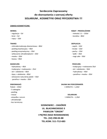 Serdecznie Zapraszamy do skorzystania z szerszej oferty SOLARIUM , KOSMETYKI ORAZ FRYZJERSTWA !!! ZABIEGI KOSMETYCZNE: HENNA: - regulacja – 5zł - brwi – 5zł - rzęsy – 10zł RZĘSY - PRZEDŁUŻANIE - metoda 1:1 – 150zł - korekta – 80zł TWARZ: - mikrodermabrazja diamentowa – 80zł - peeling kawitacyjny – 40zł - peeling enzymatyczny – 20zł - wtłaczanie ultradźwiękami – 20zł - maska – 20zł - kwasy – 80zł DEPILACJA: - wąsik – 10zł - broda – 10zł - pachy – 10zł - łydki – 30zł - nogi całe – 50zł MANICURE: - hybrydowy – 40zł - tradycyjny + malowanie – 25zł - żel + zdobienie – 60zł - tipsy + zdobienie – 80zł - żelowanie naturalnej płytki – 50zł - parafina + maska – 20zł PEDICURE: - tradycyjny + malowanie 35zł - żel + zdobienie – 50zł - hybrydowy – 40zł - parafina + maska – 20zł ENDOMASAŻ: Pakiet – 250zł - 5 zabiegów - peeling - masaż - ampułka z serum - ultradźwięki - koc termiczny SAUNA NA PODCZERWIEŃ: 1 MINUTA – 1,20zł SOLARIUM: 1 MINUTA – 1,20zł SOSNOWIEC – ZAGÓRZE UL. BLACHNICKIEGO 3 PAWILON ‘’ORION’’ I PIĘTRO (NAD ROSSMANEM) TEL. (32) 298-04-88 TEL.KOM. 511-712-683