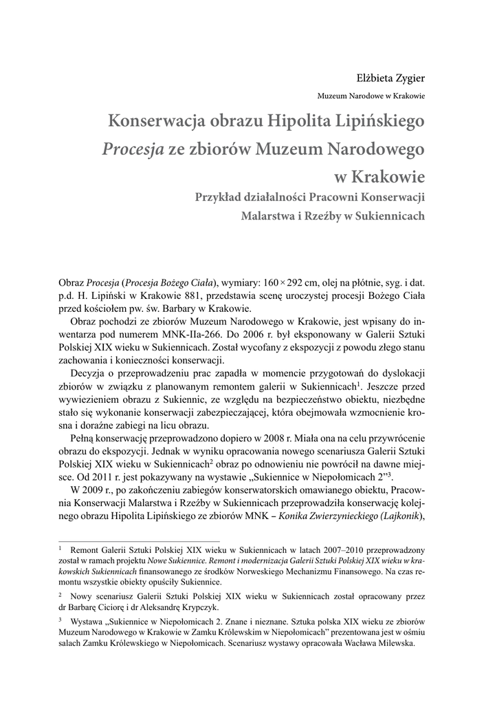 Elżbieta Zygier Muzeum Narodowe w Krakowie Konserwacja obrazu Hipolita Lipińskiego Procesja ze zbiorów Muzeum Narodowego w Krakowie Przykład działalności Pracowni Konserwacji Malarstwa i Rzeźby w Sukiennicach Obraz Procesja (Procesja Bożego Ciała), wymiary: 160 × 292 cm, olej na płótnie, syg. i dat. p.d. H. Lipiński w Krakowie 881, przedstawia scenę uroczystej procesji Bożego Ciała przed kościołem pw. św. Barbary w Krakowie. Obraz pochodzi ze zbiorów Muzeum Narodowego w Krakowie, jest wpisany do inwentarza pod numerem MNK‑IIa‑266. Do 2006 r. był eksponowany w Galerii Sztuki Polskiej XIX wieku w Sukiennicach. Został wycofany z ekspozycji z powodu złego stanu zachowania i konieczności konserwacji. Decyzja o przeprowadzeniu prac zapadła w momencie przygotowań do dyslokacji zbiorów w związku z planowanym remontem galerii w Sukiennicach1. Jeszcze przed wywiezieniem obrazu z Sukiennic, ze względu na bezpieczeństwo obiektu, niezbędne stało się wykonanie konserwacji zabezpieczającej, która obejmowała wzmocnienie krosna i doraźne zabiegi na licu obrazu. Pełną konserwację przeprowadzono dopiero w 2008 r. Miała ona na celu przywrócenie obrazu do ekspozycji. Jednak w wyniku opracowania nowego scenariusza Galerii Sztuki Polskiej XIX wieku w Sukiennicach2 obraz po odnowieniu nie powrócił na dawne miejsce. Od 2011 r. jest pokazywany na wystawie „Sukiennice w Niepołomicach 2”3. W 2009 r., po zakończeniu zabiegów konserwatorskich omawianego obiektu, Pracownia Konserwacji Malarstwa i Rzeźby w Sukiennicach przeprowadziła konserwację kolejnego obrazu Hipolita Lipińskiego ze zbiorów MNK – Konika Zwierzynieckiego (Lajkonik), 1 Remont Galerii Sztuki Polskiej XIX wieku w Sukiennicach w latach 2007–2010 przeprowadzony został w ramach projektu Nowe Sukiennice. Remont i modernizacja Galerii Sztuki Polskiej XIX wieku w krakowskich Sukiennicach finansowanego ze środków Norweskiego Mechanizmu Finansowego. Na czas remontu wszystkie obiekty opuściły Sukiennice. 2 Nowy scenariusz Galerii Sztuki Polskiej XIX wieku w Sukiennicach został opracowany przez dr Barbarę Ciciorę i dr Aleksandrę Krypczyk. 3 Wystawa „Sukiennice w Niepołomicach 2. Znane i nieznane. Sztuka polska XIX wieku ze zbiorów Muzeum Narodowego w Krakowie w Zamku Królewskim w Niepołomicach” prezentowana jest w ośmiu salach Zamku Królewskiego w Niepołomicach. Scenariusz wystawy opracowała Wacława Milewska. 230 Elżbieta Zygier MNK‑IIa‑124. Do konserwacji przeznaczony jest jeszcze jeden z dużych obrazów tegoż artysty – Targ na Rynku w Krakowie (Obchód środy popielcowej), MNK‑IIa‑185. Technika wykonania i stan zachowania warstw technologicznych przed konserwacją Obraz Hipolita Lipińskiego Procesja wykonany jest w technice olejnej na płótnie lnianym, pokrytym zaprawą, które pierwotnie było napięte na drewnianym krośnie. Przeprowadzone badania technologiczne towarzyszące konserwacji obrazu pozwoliły na precyzyjne określenie poszczególnych warstw technologicznych. Wyodrębniono warstwy pierwotne (oryginalne) i warstwy wtórne dodawane w trakcie konserwacji, której poddawany był obiekt. Obraz namalowany został w 1881 r. na płótnie sprowadzonym z Wiednia. Na odwrocie zachowała się pieczęć producenta lub sklepu rozprowadzającego płótna malarskie: W. KOLLER & Co / IN WIEN / Mariahilferstrasse 33 / Siberne Medaille. Taka pieczęć istnieje też na innych obrazach z kolekcji Muzeum Narodowego w Krakowie, co świadczy o popularności podobrazi sprowadzanych w XIX w. z Wiednia do Krakowa4. Płótno jest gęsto tkane o splocie skośnym (rządkowym) – ilość nitek osnowy i wątku na 1 cm wynosi: 21 × 21. Rys. 1 Układ splotu płótna Podobrazie nie jest jednorodne, składa się z dwóch kawałków płótna – dużego brytu i doszytego pasa o szerokości ok. 13,5 cm. Obydwa płótna mają taki sam splot. Zszyto je, składając razem, a następnie rozłożono na odwrocie wzdłuż szwu. Z każdej strony zakładka wynosi ok. 1,5 cm, na niej widoczna jest warstwa malarska mająca charakter szkicu (podmalówki). Płótno pokrywa zaprawa fabryczna w kolorze białym, występująca także na marginesach obrazu. Obraz powiększono prawdopodobnie w trakcie tworzenia kompozycji malarskiej. Można przypuszczać, że artysta użył fragmentu zagruntowanego i pokrytego szkicem malarskim płótna wyciętego z innego obrazu. Nie jest to jedyny przykład zmian kompozycyjnych w dziełach Lipińskiego. Zagadkę kryje też Konik Zwierzyniecki namalowany ok. 1881 r., na którym artysta zmienił kompozycję malarską, nie zmieniając formatu krosna. Na tym płótnie, przy górnej krawędzi, malarz pozostawił pas szkicu z pierwotnej kompozycji, który wyraźnie odcina się od namalowanego poniżej nieba. Opracowanie tego tematu, łącznie z analizą stylistyczną i formalną Lajkonika, wymaga dalszych badań. Można określić, iż Konik Zwierzyniecki ze zbiorów Sukiennic to szkic olejny. Procesja Bożego Ciała zaś jest ukończonym i dopracowanym malarsko obrazem. Szczegóły przedstawienia są czytelne. Warstwa malarska w Procesji jest miejscowo fakturalnie zróżnico4 Pieczęć o treści: W. KOLLER & Co / IN WIEN / Mariahilferstrasse 33 / Siberne Medaille znajduje się także na obrazie Lipińskiego Konik Zwierzyniecki, MNK‑IIa‑124, olej na płótnie, wym.: 164 × 308 cm. Konserwacja obrazu Hipolita Lipińskiego Procesja ze zbiorów Muzeum Narodowego w Krakowie wana, położona została gładko lub w formie impast. Widoczne są tu także ślady prowadzenia pędzla. Do naprężenia obrazu wykorzystane zostało krosno drewniane z dwoma krzyżakami, poszerzone poprzez doklejenie po bokach pionowych listew. W dokumentacji konserwatorskiej obrazu odnotowano, że pierwotne warstwy technologiczne były uzupełniane podczas prac zabezpieczających przeprowadzonych w 1984 r. O innych – wcześniejszych konserwacjach – świadczą ślady na obrazie. Przeprowadzono rep
