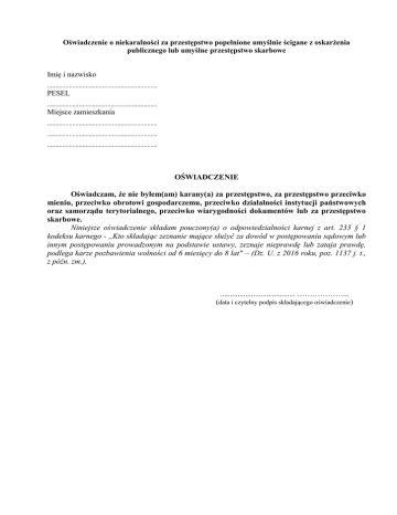 Oświadczenie o niekaralności za przestępstwo popełnione umyślnie ścigane z oskarżenia publicznego lub umyślne przestępstwo skarbowe Imię i nazwisko .................................................................. PESEL .................................................................. Miejsce zamieszkania .................................................................. .................................................................. .................................................................. OŚWIADCZENIE Oświadczam, że nie byłem(am) karany(a) za przestępstwo, za przestępstwo przeciwko mieniu, przeciwko obrotowi gospodarczemu, przeciwko działalności instytucji państwowych oraz samorządu terytorialnego, przeciwko wiarygodności dokumentów lub za przestępstwo skarbowe. Niniejsze oświadczenie składam pouczony(a) o odpowiedzialności karnej z art. 233 § 1 kodeksu karnego - ,,Kto składając zeznanie mające służyć za dowód w postępowaniu sądowym lub innym postępowaniu prowadzonym na podstawie ustawy, zeznaje nieprawdę lub zataja prawdę, podlega karze pozbawienia wolności od 6 miesięcy do 8 lat" – (Dz. U. z 2016 roku, poz. 1137 j. t., z późn. zm.). ....................................... ………………... (data i czytelny podpis składającego oświadczenie)
