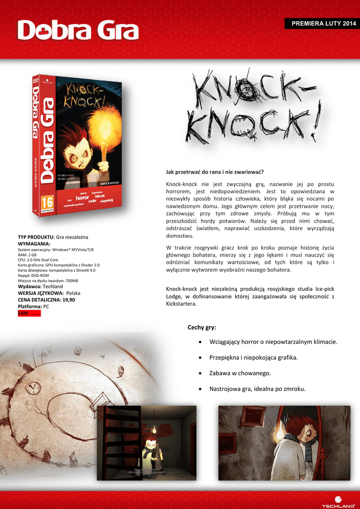 PREMIERA LUTY 2014 Jak przetrwać do rana i nie zwariować? TYP PRODUKTU: Gra niezależna WYMAGANIA: System operacyjny: Windows® XP/Vista/7/8 RAM: 2 GB CPU: 2.0 GHz Dual Core Karta graficzna: GPU kompatybilna z Shader 2.0 Karta dźwiękowa: kompatybilna z DirextX 9.0 Napęd: DVD-ROM Miejsce na dysku twardym: 700MB Wydawca: Techland WERSJA JĘZYKOWA: Polska CENA DETALICZNA: 19,90 Platforma: PC EAN: …….. Knock-knock nie jest zwyczajną grą, nazwanie jej po prostu horrorem, jest niedopowiedzeniem. Jest to opowiedziana w niezwykły sposób historia człowieka, który błąka się nocami po nawiedzonym domu. Jego głównym celem jest przetrwanie nocy, zachowując przy tym zdrowe zmysły. Próbują mu w tym przeszkodzić hordy potworów. Należy się przed nimi chować, odstraszać światłem, naprawiać uszkodzenia, które wyrządzają domostwu. W trakcie rozgrywki gracz krok po kroku poznaje historię życia głównego bohatera, mierzy się z jego lękami i musi nauczyć się odróżniać komunikaty wartościowe, od tych które są tylko i wyłącznie wytworem wyobraźni naszego bohatera. Knock-knock jest niezależną produkcją rosyjskiego studia Ice-pick Lodge, w dofinansowanie której zaangażowała się społeczność z Kickstartera. Cechy gry: Wciągający horror o niepowtarzalnym klimacie. Przepiękna i niepokojąca grafika. Zabawa w chowanego. Nastrojowa gra, idealna po zmroku.