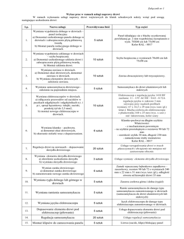 Załącznik nr 1 Wykaz prac w ramach usługi naprawy drzwi W ramach wykonania usługi naprawy drzwi wejściowych do klatek schodowych należy wziąć pod uwagę następujące uszkodzenia drzwi: Lp. Nazwa usługi. Przewidywana ilość Typ części 1. Wymiana wypełnienia dolnego w drzwiach – panel izolacyjny. a) Demontaż uszkodzonego panelu dolnego w drzwiach i zabezpieczenie płytą pilśniową twardą b) Montaż panelu izolacyjnego dolnego w drzwiach. 5 sztuk Panel składający sie z blachy ocynkowanej powlekanej gr. 2 mm wypełnionej styropianem o wym. 70X80 cm lub 75x90 cm Kolor RAL - 8017 2. Wymiana wypełnienia szklanego w drzwiach – szyba bezpieczna. a) Demontaż uszkodzonego szklenia drzwi i zabezpieczenie płytą pilśniową twardą. b) Montaż szklenia drzwi. 10 sztuk Szyba bezpieczna o wymiarach 70x80 cm lub 75x90 cm 3. Wymiana zawiasu w drzwiach. a) Demontaż okuć drzwiowych, demontaż zawiasu w drzwiach. b) Wymiana elementów drzwiowych – założenie zawiasu. 10 sztuk Zawias dwuczęściowy lub trzyczęściowy. 4. Wymiana samozamykacza drzwiowego założenie na poprzednim miejscu. 5 sztuk Samozamykacz do drzwi aluminiowych lub stalowych 5. Wymiana elektrozaczepów w drzwiach. a) odłączenie przewodów od zacisków w puszkach odgałęźnych i odgałęźnikach n.t. i p.t., sprzęt łączeniowy: tulejki, zaciski, przekrój żył do 2,5 mm2, b) montaż nowego elektrozaczepu w drzwiach. 10 sztuk Elektrozaczep z regulacją języka 1410 RF zasilanie: 11 - 13V AC/DC / 0.63 - 0.72A regulacja języka w zakresie 3 mm używany przy wąskich profilach wymiary: 67 x 16,5 x 29 mm (wys./szer./gł.) wraz z blachą czołową do elektrozaczepu z płaskownika 160 x 25 mm (wys. x szer.) stal lakierowana, kolor szary 6. Wymiana klamko – pochwytu. a) demontaż okuć drzwiowych, b) okuwanie stolarki wraz z dopasowaniem. 6 sztuk Klamko-pochwyt na długim szyldzie Właściwości: - z mechanizmem powrotnym - na szyldzie prostokątnym o rozstawie 90 lub 72 mm - szerokość szyldu 30 mm, długość 230 mm - zamaskowane śruby montażowe Kolor RAL - 8017 7. Regulacja drzwi na zawiasach – dopasowanie skrzydła drzwiowego 20 sztuk Usługa wyregulowania drzwi w trzech płaszczyznach i obciążenie nie mniejsze niż zastosowane obecnie. 8. Wymiana elementu skrzydła drzwiowego: a) określenie uszkodzenia skrzydła b) wymiana skrzydła drzwiowego 3 sztuki Usługa wymiany elementu skrzydła drzwiowego. 9. Wymian zamka drzwiowego: a) demontaż zamka drzwiowego b) zamontowanie nowego zamka drzwiowego 6 sztuk Zamek wpuszczany bębenkowo zapadkowo – zasuwkowy, rozstaw 90 lub 72 o wymiarach 240 mm x 22 mm x 51 mm (wys./szer./gł.), odległość otworu od krawędzi drzwi 35 mm 10. Wymiana rygla dolnego lub górnego w drzwiach 5 sztuk Zasuwa czołowa górna i dolna (rygiel) 11. Wymiana ramienia samozamykacza 5 sztuk Ramie samozamykacza do danego typu samozamykacza zamontowanego w drzwiach (samozamykacza do drzwi aluminiowych lub stalowych) 12. Wymiana języka elektrozaczepu 5 sztuk Język elektrozaczepu do danego typu elektrozaczepu zamontowanego w drzwiach. 13. Dopasowanie elementu drzwi pod elektrozaczep (piłowanie) 5 sztuk Usługa dopasowania elementu drzwi pod elektrozaczep (piłowanie) 14. Regulacja samozamykacza 20 sztuk Usługa regulacji samozamykacza 15. Montaż klipsów do zamocowania panelu 5 sztuk Listwa (zacisk, klips) blokujący panel