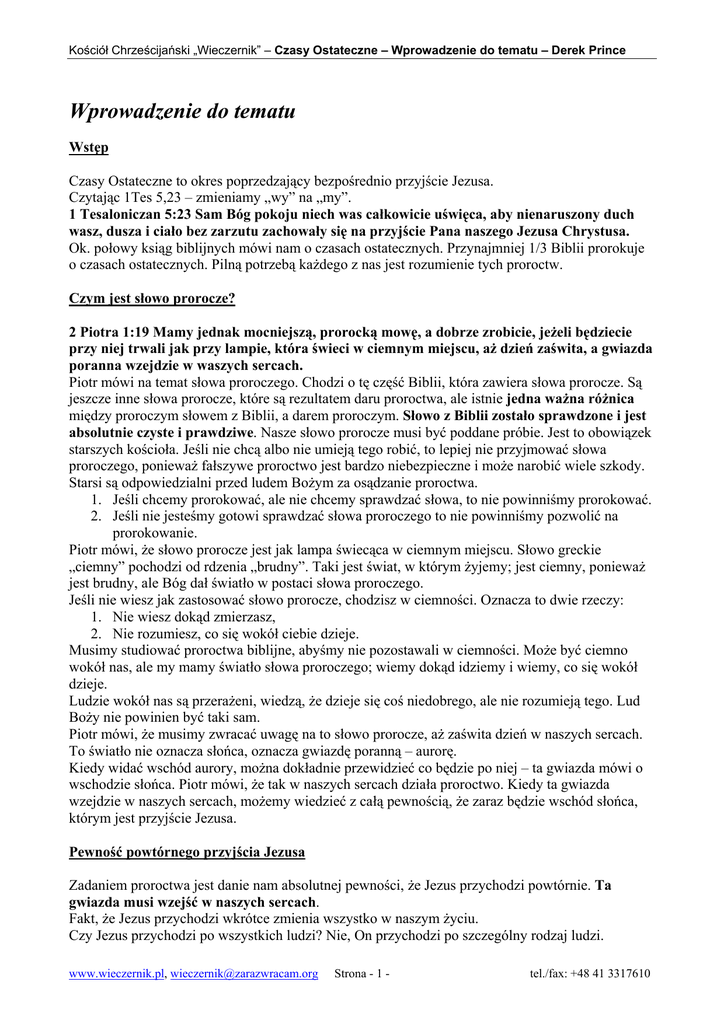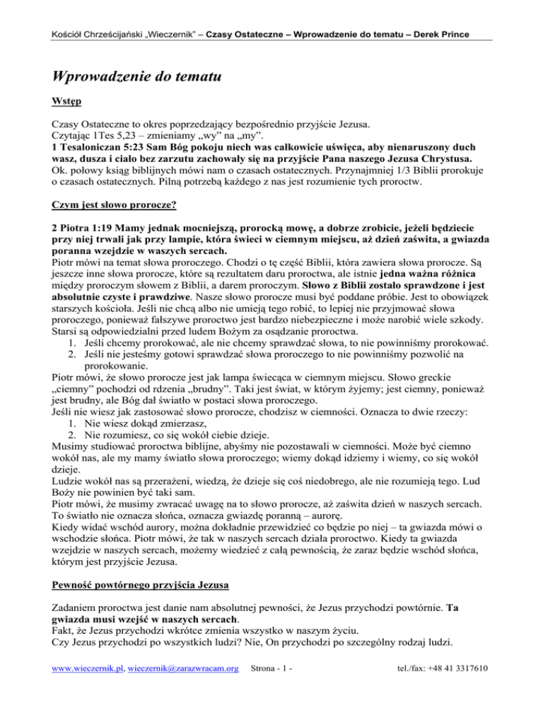 Kościół Chrześcijański „Wieczernik” – Czasy Ostateczne – Wprowadzenie do tematu – Derek Prince Wprowadzenie do tematu Wstęp Czasy Ostateczne to okres poprzedzający bezpośrednio przyjście Jezusa. Czytając 1Tes 5,23 – zmieniamy „wy” na „my”. 1 Tesaloniczan 5:23 Sam Bóg pokoju niech was całkowicie uświęca, aby nienaruszony duch wasz, dusza i ciało bez zarzutu zachowały się na przyjście Pana naszego Jezusa Chrystusa. Ok. połowy ksiąg biblijnych mówi nam o czasach ostatecznych. Przynajmniej 1/3 Biblii prorokuje o czasach ostatecznych. Pilną potrzebą każdego z nas jest rozumienie tych proroctw. Czym jest słowo prorocze? 2 Piotra 1:19 Mamy jednak mocniejszą, prorocką mowę, a dobrze zrobicie, jeżeli będziecie przy niej trwali jak przy lampie, która świeci w ciemnym miejscu, aż dzień zaświta, a gwiazda poranna wzejdzie w waszych sercach. Piotr mówi na temat słowa proroczego. Chodzi o tę część Biblii, która zawiera słowa prorocze. Są jeszcze inne słowa prorocze, które są rezultatem daru proroctwa, ale istnie jedna ważna różnica między proroczym słowem z Biblii, a darem proroczym. Słowo z Biblii zostało sprawdzone i jest absolutnie czyste i prawdziwe. Nasze słowo prorocze musi być poddane próbie. Jest to obowiązek starszych kościoła. Jeśli nie chcą albo nie umieją tego robić, to lepiej nie przyjmować słowa proroczego, ponieważ fałszywe proroctwo jest bardzo niebezpieczne i może narobić wiele szkody. Starsi są odpowiedzialni przed ludem Bożym za osądzanie proroctwa. 1. Jeśli chcemy prorokować, ale nie chcemy sprawdzać słowa, to nie powinniśmy prorokować. 2. Jeśli nie jesteśmy gotowi sprawdzać słowa proroczego to nie powinniśmy pozwolić na prorokowanie. Piotr mówi, że słowo prorocze jest jak lampa świecąca w ciemnym miejscu. Słowo greckie „ciemny” pochodzi od rdzenia „brudny”. Taki jest świat, w którym żyjemy; jest ciemny, ponieważ jest brudny, ale Bóg dał światło w postaci słowa proroczego. Jeśli nie wiesz jak zastosować słowo prorocze, chodzisz w ciemności. Oznacza to dwie rzeczy: 1. Nie wiesz dokąd zmierzasz, 2. Nie rozumiesz, co się wokół ciebie dzieje. Musimy studiować proroctwa biblijne, abyśmy nie pozostawali w ciemności. Może być ciemno wokół nas, ale my mamy światło słowa proroczego; wiemy dokąd idziemy i wiemy, co się wokół dzieje. Ludzie wokół nas są przerażeni, wiedzą, że dzieje się coś niedobrego, ale nie rozumieją tego. Lud Boży nie powinien być taki sam. Piotr mówi, że musimy zwracać uwagę na to słowo prorocze, aż zaświta dzień w naszych sercach. To światło nie oznacza słońca, oznacza gwiazdę poranną – aurorę. Kiedy widać wschód aurory, można dokładnie przewidzieć co będzie po niej – ta gwiazda mówi o wschodzie słońca. Piotr mówi, że tak w naszych sercach działa proroctwo. Kiedy ta gwiazda wzejdzie w naszych sercach, możemy wiedzieć z całą pewnością, że zaraz będzie wschód słońca, którym jest przyjście Jezusa. Pewność powtórnego przyjścia Jezusa Zadaniem proroctwa jest danie nam absolutnej pewności, że Jezus przychodzi powtórnie. Ta gwiazda musi wzejść w naszych sercach. Fakt, że Jezus przychodzi wkrótce zmienia wszystko w naszym życiu. Czy Jezus przychodzi po wszystkich ludzi? Nie, On przychodzi po szczególny rodzaj ludzi. www.wieczernik.pl, [email protected] Strona - 1 - tel./fax: +48 41 3317610 Kościół Chrześcijański „Wieczernik” – Czasy Ostateczne – Wprowadzenie do tematu – Derek Prince Hebrajczyków 9:28 tak Chrystus raz jeden był ofiarowany dla zgładzenia grzechów wielu, drugi raz ukaże się nie w związku z grzechem, lecz dla zbawienia tych, którzy Go oczekują. Po raz pierwszy Jezus przyszedł w pokorze, aby cierpieć i umrzeć za nasze grzechy, ale po raz drugi Jezus przyjdzie w chwale i w mocy, by sądzić żywych i umarłych. Jednak Jezus przychodzi by przyjąć do siebie tylko określony rodzaj ludzi. Powyższy werset mówi, o jakich ludzi chodzi. Jeśli Go nie oczekujesz, to On nie przyjdzie po ciebie. Zrozumienie proroctwa biblijnego sprawi, że będziemy Go gorliwie oczekiwać. Jest to ważne dla naszego zbawienia, abyśmy byli gotowi, kiedy Jezus powróci. Istnieje wiele fałszywych teorii na temat biblijnych proroctw. Każdy, kto twierdzi dokładnie, kiedy Jezus przyjdzie jest fałszywym prorokiem, bo sam Jezus powiedział, że ten dzień zna tylko Ojciec. W dzisiejszym Kościele jest wielu zwodzicieli, dlatego każdy musi mieć światło dla siebie. Fałszywe proroctwa zniechęcają do zgłębiania proroczego słowa, ale musimy je zrozumieć. Rzeczy ukryte i rzeczy objawione Powtórzonego Prawa 29:28 Rzeczy ukryte należą do Pana, Boga naszego, a rzeczy objawione do nas i do naszych synów na wieki, byśmy wykonali wszystkie słowa tego Prawa. Mojżesz mówi, że istnieją dwie kategorie rzeczy: 1. Te ukryte, których Bóg nie objawił, 2. Te, które Bóg objawił ludziom. Nie jest rozsądne zgłębianie rzeczy, które Bóg ukrył. Dokładna data przyjścia Jezusa jest rzeczą ukrytą i marnujesz czas szukając tego. Ale są rzeczy, które Bóg objawił i te możemy odkryć. Gdy Bóg objawia nam coś, to pokazuje nam to po to, abyśmy byli w tym posłuszni. Jeśli jesteśmy posłuszni w tym, co Bóg nam objawia, to On daje nam następne objawienia. Ale jeśli nie jesteśmy posłuszni, to On nie objawi nam niczego nowego, bo warunkiem otrzymania objawienia jest posłuszeństwo wobec tego, co jest już objawione. Bóg nie objawia rzeczy, aby nas ucieszyć, ale abyśmy mogli iść za tym i być posłuszni. Mateusza 24:14 A ta Ewangelia o królestwie będzie głoszona po całej ziemi, na świadectwo wszystkim narodom. I wtedy nadejdzie koniec. Jest to najwyższy priorytet dla Bożego ludu. Zasady dotyczące zrozumienia proroctw biblijnych: Wszystkie proroctwa dotyczące pierwszego przyjścia Jezusa (przynajmniej 30) spełniły się dokł
