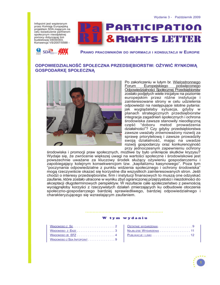 wydanie 3 - Październik 2009 infopoint jest wspieranym przez komisję europejską projektem sda mającym na celu świadczenie partnerom społecznym nieodpłatnej pomocy dotyczącej linii budżetowej 04030303. konwencja Vs/2007/0588 - Prawo Pracowników do informacji i konsultacji w EuroPiE odPowiEdzialność sPołEczna PrzEdsiębiorstw: ożywić rynkową gosPodarkę sPołEczną Po zakończeniu w lutym br. wielostronnego Forum europejskiego poświęconego Odpowiedzialności społecznej Przedsiębiorstw zostało podjętych wiele inicjatyw na poziomie europejskim przez różne instytucje i zainteresowane strony w celu udzielenia odpowiedzi na następujące istotne pytania: jak wyglądałaby sytuacja, gdyby w planach strategicznych przedsiębiorstw integracja zagadnień społecznych i ochrona środowiska zawsze stanowiły nieodłączną część “doboru metod prowadzenia działalności”? czy gdyby przedsiębiorstwa zawsze uważały zrównoważony rozwój za sprawę priorytetową i zawsze prowadziły swoją działalność, mając na uwadze rozwój gospodarczy oraz konkurencyjność przy jednoczesnym zapewnieniu ochrony środowiska i promocji praw społecznych, możliwe by było uniknięcie skutków kryzysu? wydaje się, że zwrócenie większej uwagi na wartości społeczne i środowiskowe jest powszechnie uważane za kluczowy środek służący ożywieniu gospodarczemu i zapobiegający kolejnym konsekwencjom tzw. „kapitalizmu kasynowego”. Poza tym “poczynania odpowiedzialne z punktu widzenia społecznego i ochrony środowiska” mogą rzeczywiście okazać się korzystne dla wszystkich zainteresowanych stron. jeśli chodzi o interesy przedsiębiorstw, firm i instytucji finansowych to muszą one odzyskać zaufanie, które zostało utracone w wyniku zbyt ograniczonej przejrzystości i niezdolności do akceptacji długoterminowych perspektyw. w rezultacie całe społeczeństwo z pewnością wyciągnęłoby korzyści z rzeczywistych działań zmierzających ku odbudowie otoczenia społeczno-gospodarczego bardziej sprawiedliwego, bardziej odpowiedzialnego i charakteryzującego się wzrastającym zaufaniem. W tym wydaniu wiadOmOsci z se . . . . . . . . . . . . . . . . . . . . . . . 2 wiadOmOsci z ekzz . . . . . . . . . . . . . . . . . . . . . 3 wiadOmOsci ze eFz . . . . . . . . . . . . . . . . . . . . . 4 wiadOmOsci z sda inFOPOint . . . . . . . . . . . . . . . 9 Ostatnie wydarzeniai . . . . . . . . . . . . . . . . . . . 9 najblizse wydarzenia . . . . . . . . . . . . . . . . . 11 Publikacje i linki . . . . . . . . . . . . . . . . . . . . . 12 1 Pełna integracja odpowiedzialności społecznej i środowiskowej we wszystkich działaniach przedsiębiorstw stanowi dzisiaj obowiązek niezbędny w kontekście ekonomicznym i w zakresie zatrudnienia aktualnego, ale - co ważniejsze – zatrudnienia w przyszłości. sytuacja ekonomiczna zapowiada bowiem na przyszłe lata wyzwania jeszcze trudniejsze niż obecne, wynikające nie tylko z kryzysu, ale również ze zmian strukturalnych, demograficznych i technologicznych. stwarza to absolutną konieczność wyprzedzenia i pokierowania tymi zmianami tak, aby w miarę możliwości zredukować do minimum koszty społeczne. ewolucja ta stanowi założenie służące radykalizacji i aktualizacji zasad odpowiedzialności społecznej. Oczywiście postępowanie według wzorców odpowiedzialności społecznej wymaga konfrontacji zasadniczej i opartej na zaangażowaniu oraz współpracy między przedsiębiorstwami i zainteresowanymi stronami w ramach procesu gwarantującego podjęcie działań przejrzystych, możliwych do sprawdzenia i odpowiedzialnych. Odnośnie tego, zdaniem ekzz, główny nacisk w zakresie odpowiedzialności społecznej należy położyć na jakość stosunków przemysłowych w poszczególnych przedsiębiorstwach. Propagowanie prężnych struktur, zajmujących się informowaniem, konsultowaniem i partycypacją, przede wszystkim w obrębie europejskich rad zakładowych, ma zasadnicze znaczenie i to nie tylko w odniesieniu do przestrzegania podstawowych praw pracowników. realizowany poprzez procedury konsultacyjne dialog społeczny jest w stanie zrodzić w okresie zmian odpowiedzialne rozwiązania na wysokim poziomie, zrównoważone i innowacyjne. ekzz i europejskie Federacje związkowe uczestniczą w debacie europejskiej i są gotowe do udzielenia wsparcia działaniom mającym na celu popularyzowanie partycypacji pracowników w przedsięwzięciach noszących znamiona autentycznej i konkretnej odpowiedzialności społecznej. jako wydawcy tego „newsletter” (biuletynu elektronicznego) zobowiązujemy się do śledzenia bieżącej debaty i obserwowania najbardziej innowacyjnych poczynań rozwojowych, które zostaną podjęte przez przedsiębiorstwa, pracowników, partnerów społecznych, społeczeństwo obywatelskie i instytucje publiczne, sprawiając, że zrównoważony rozwój stanie się głównym tematem, którego europa nie może dłużej ignorować. claudio stanzani Dyrektor Agencji Rozwoju Społecznego informacjE o sPółkach EuroPEjskich (sE) danE uaktualnionE zgodnie z tekstem opublikowanym w ostatnim newsletter Parl w ostatnich latach spółka europejska (se) przeszła fazę rozwojową, stając się atrakcyjną alternatywą dla przedsiębiorstw zamierzających zorganizować swój biznes w europie. tendencję tę wydają się potwierdzać ostatnie informacje opublikowane w banku danych spółek europejskich - se Factsheet database, prowadzonym przez europejski instytut związków zawodowych (etui). do 20 lipca 2009 r. założono ok. 40 se w 19 krajach, głównie w republice czeskiej, niemczech, Holandii. Francji i na słowacji. mimo że większość tych se nie posiada pracowników i/lub nie prowadzi działalności (por. ostatni biuletyn Parl), istnienie przynajmniej 94 se „normalnych” świadczy o tym, że se nie jest już tylko zagadnieniem wirtualnym, lecz stanowi rzeczywistość oferującą nowe możliwości partycypacji pra