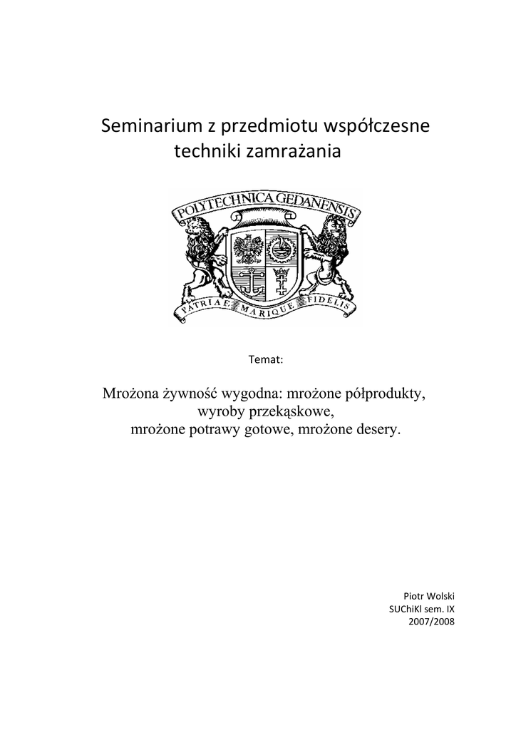 Seminarium z przedmiotu współczesne techniki zamrażania Temat: Mrożona żywność wygodna: mrożone półprodukty, wyroby przekąskowe, mrożone potrawy gotowe, mrożone desery. Piotr Wolski SUChiKl sem. IX 2007/2008 Plan seminarium 1.Definicja wygodnej żywności..................................................................................................3 2.Historia...................................................................................................................................3 3.Klasyfikacja.............................................................................................................................3 4.Mrożone półprodukty.............................................................................................................5 5.Mrożone wyroby przekąskowe...............................................................................................5 6.Mrożone potrawy gotowe......................................................................................................6 7.Desery.....................................................................................................................................6 8.Zalety......................................................................................................................................7 9.Wady......................................................................................................................................7 10. Literatura.............................................................................................................................8 1. Definicja wygodnej żywności Definiowanie wyrażenia „żywności wygodnej” należy zacząć od wyjaśnienia samego pojęcia żywności przetworzonej. A mianowicie żywnością przetworzoną nazywamy wszystkie wytworzone przemysłowo produkty o wyższym stopniu przygotowania do spożycia niż surowiec dostarczony przez rolnictwo. Pod pojęciem „żywności wygodnej” rozumiemy we właściwy sposób przetworzone i utrwalone posiłki lub ich składniki, nadające im odpowiednią dyspozycyjność. Składają się na nią dwa elementy, to jest trwałość , oraz przystosowanie do szybkiego przyrządzenia z nich lub w połączeniu z innymi składnikami bezpiecznych pod względem zdrowotnym posiłków. 2. Historia Żywność przetworzona już od zamierzchłych czasów odgrywała istotne znaczenie w życiu człowieka. Na początku było to wyroby co prawda mało wyrafinowane ale nadawały się do szybkiego spożycia, były to miedzy innymi wędzone mięsa, ryby albo suszone owoce. Bardziej nowoczesne metody utrwalania żywności miały swój początek wraz z wdrożeniem procesu pasteryzacji w 1795 r. przez Apperta, oraz w 30 latach XX wieku wdrożeniu przemysłowego zamrażania żywności. Ze względu na technologię wytwarzania i utrwalania można wyróżnić kilka generacji żywności wygodnej. 1. Najstarszą z nich są produkty wytwarzane metodami tradycyjnymi i utrwalane początkowo zwykle działaniem wysokich temperatur 2. W późniejszym okresie większą rolę zaczęło odgrywać zamrażanie wcześniej przygotowanych wyrobów 3. W ostatnich dekadach XX w. dzięki szybkiemu rozwojowi technologii produkcji, pakowania i utrwalania doszło do powstania żywności wygodnej 2 generacji (mrożone gotowe potrawy, udoskonalone koncentraty zup i sosów i liczne desery) 3. Klasyfikacja Żywność wygodna obejmuje bardzo szeroką gamę produktów różniących się od siebie pod względem składu, podstawowych właściwości i stopnia przetworzenia, różniących się również sposobem pakowania, techniką utrwalania i przeznaczeniem użytkowym. Podziału utrwalania żywności można dokonać pod względem temperatury w jakiej poddaje się obróbce żywność, i tak mamy do czynienia z utrwaleniem pod wpływem wysokiej i niskiej temperatury. Pierwsza metoda ( której poddawane są między innymi takie produkty jak konserwy i susze) jest metodą skuteczną lecz powoduje znaczne zmiany cech fizycznych i chemicznych w porównaniu z żywnością świeżą, produkty te tracą również na walorach sensorycznych i żywieniowych. Drugą metodą jest schładzanie lub zamrażanie do temperatury około zerowej produktów. Do tego rodzaju produktów zaliczamy głównie produkty podane w poniższej tabelce Choć także zalicza się do nich produkty o mniejszym zakresie przygotowania kulinarnego. Można przyjąć , że praktycznie wszystkie wyroby oferowane w opakowaniach detalicznych stanowią różne odmiany żywności wygodnej. W uproszczeniu, mrożoną żywność wygodną podzielić można na cztery podstawowe rodzaje wyrobów, tj. 1. Półprodukty 2. Potrawy gotowe 3. Desery 4. Wyroby garmażeryjne Oprócz tych podstawowych można wymienić jeszcze kilka mniejszych grup obejmujących między innymi produkty przekąskowe i o specjalnym charakterze i przeznaczeniu. W pierwszej grupie(półproduktów) możemy wyodrębnić półprodukty zwierzęce i roślinne. Z tych pierwszych możemy wyróżnić wyroby przetworzone w mniejszym stopniu, czyli proste wyroby mięsne przy których przerób został ograniczony jedynie do usunięcia części niejadalnych bądź nisko wartościowych np. drób dzielony , oraz o bardziej skomplikowanym procesie przygotowania np. hamburgery formowane z farszu mięsnego. Do pół produktów roślinnych możemy zaliczyć przeciery, soki, koncentraty, mieszanki owocowe. Wśród potraw gotowych możemy wskazać takie produkty jak zupy bądź dania jedno lub dwuskładnikowe. Podstawowym przedstawicielem grupy deserów są lody, ta grupa charakteryzuje się tym, że przed spożyciem nie trzeba ma konieczności podgrzania. Czwarta grupa, czyli wyroby garmażeryjne, w skład których wchodzą proste półprodukty z surowców zwierzęcych oraz inne wyroby w różnym stopniu przetworzenia np. sałatki. są wyrobami które poddawane są jedynie schładzaniu, jako jedynej metodzie utrwalającej żywność.