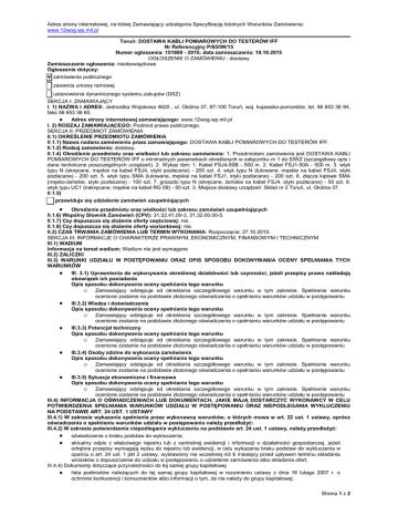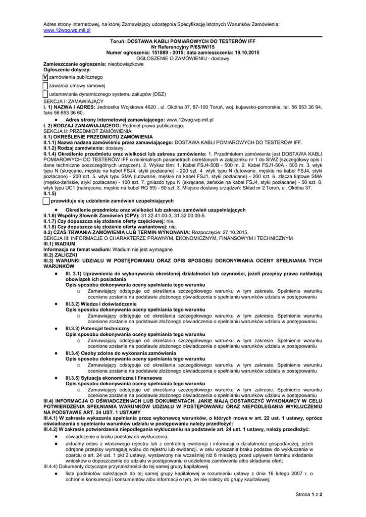 Adres strony internetowej, na której Zamawiający udostępnia Specyfikację Istotnych Warunków Zamówienia: www.12wog.wp.mil.pl Toruń: DOSTAWA KABLI POMIAROWYCH DO TESTERÓW IFF Nr Referencyjny P/65/IW/15 Numer ogłoszenia: 151889 - 2015; data zamieszczenia: 19.10.2015 OGŁOSZENIE O ZAMÓWIENIU - dostawy Zamieszczanie ogłoszenia: nieobowiązkowe Ogłoszenie dotyczy: V zamówienia publicznego zawarcia umowy ramowej ustanowienia dynamicznego systemu zakupów (DSZ) SEKCJA I: ZAMAWIAJĄCY I. 1) NAZWA I ADRES: Jednostka Wojskowa 4620 , ul. Okólna 37, 87-100 Toruń, woj. kujawsko-pomorskie, tel. 56 653 36 94, faks 56 653 36 60. Adres strony internetowej zamawiającego: www.12wog.wp.mil.pl I. 2) RODZAJ ZAMAWIAJĄCEGO: Podmiot prawa publicznego. SEKCJA II: PRZEDMIOT ZAMÓWIENIA II.1) OKREŚLENIE PRZEDMIOTU ZAMÓWIENIA II.1.1) Nazwa nadana zamówieniu przez zamawiającego: DOSTAWA KABLI POMIAROWYCH DO TESTERÓW IFF. II.1.2) Rodzaj zamówienia: dostawy. II.1.4) Określenie przedmiotu oraz wielkości lub zakresu zamówienia: 1. Przedmiotem zamówienia jest DOSTAWA KABLI POMIAROWYCH DO TESTERÓW IFF o minimalnych parametrach określonych w załączniku nr 1 do SIWZ (szczegółowy opis i dane techniczne poszczególnych urządzeń). 2. Wykaz tśm: 1. Kabel FSJ4-50B - 500 m. 2. Kabel FSJ1-50A - 500 m. 3. wtyk typu N (skręcane, męskie na kabel FSJ4, styki pozłacane) - 200 szt. 4. wtyk typu N (lutowane, męskie na kabel FSJ4, styki pozłacane) - 200 szt. 5. wtyk typu SMA (lutowane, męskie na kabel FSJ1, styki pozłacane) - 200 szt. 6. złącza kątowe SMA (męsko-żeńskie, styki pozłacane) - 100 szt. 7. gniazdo typu N (skręcane, żeńskie na kabel FSJ4, styki pozłacane) - 50 szt. 8. wtyk typu UC1 (nakręcane, męskie na kabel RG 59) - 50 szt. 3. Miejsce dostawy urządzeń: Skład nr 2 Toruń, ul. Okólna 37. II.1.5) przewiduje się udzielenie zamówień uzupełniających Określenie przedmiotu oraz wielkości lub zakresu zamówień uzupełniających II.1.6) Wspólny Słownik Zamówień (CPV): 31.22.41.00-3, 31.32.00.00-5. II.1.7) Czy dopuszcza się złożenie oferty częściowej: nie. II.1.8) Czy dopuszcza się złożenie oferty wariantowej: nie. II.2) CZAS TRWANIA ZAMÓWIENIA LUB TERMIN WYKONANIA: Rozpoczęcie: 27.10.2015. SEKCJA III: INFORMACJE O CHARAKTERZE PRAWNYM, EKONOMICZNYM, FINANSOWYM I TECHNICZNYM III.1) WADIUM Informacja na temat wadium: Wadium nie jest wymagane III.2) ZALICZKI III.3) WARUNKI UDZIAŁU W POSTĘPOWANIU ORAZ OPIS SPOSOBU DOKONYWANIA OCENY SPEŁNIANIA TYCH WARUNKÓW III. 3.1) Uprawnienia do wykonywania określonej działalności lub czynności, jeżeli przepisy prawa nakładają obowiązek ich posiadania Opis sposobu dokonywania oceny spełniania tego warunku o Zamawiający odstępuje od określania szczegółowego warunku w tym zakresie. Spełnienie warunku ocenione zostanie na podstawie złożonego oświadczenia o spełnianiu warunków udziału w postępowaniu III.3.2) Wiedza i doświadczenie Opis sposobu dokonywania oceny spełniania tego warunku o Zamawiający odstępuje od określania szczegółowego warunku w tym zakresie. Spełnienie warunku ocenione zostanie na podstawie złożonego oświadczenia o spełnianiu warunków udziału w postępowaniu III.3.3) Potencjał techniczny Opis sposobu dokonywania oceny spełniania tego warunku o Zamawiający odstępuje od określania szczegółowego warunku w tym zakresie. Spełnienie warunku ocenione zostanie na podstawie złożonego oświadczenia o spełnianiu warunków udziału w postępowaniu III.3.4) Osoby zdolne do wykonania zamówienia Opis sposobu dokonywania oceny spełniania tego warunku o Zamawiający odstępuje od określania szczegółowego warunku w tym zakresie. Spełnienie warunku ocenione zostanie na podstawie złożonego oświadczenia o spełnianiu warunków udziału w postępowaniu III.3.5) Sytuacja ekonomiczna i finansowa Opis sposobu dokonywania oceny spełniania tego warunku o Zamawiający odstępuje od określania szczegółowego warunku w tym zakresie. Spełnienie warunku ocenione zostanie na podstawie złożonego oświadczenia o spełnianiu warunków udziału w postępowaniu III.4) INFORMACJA O OŚWIADCZENIACH LUB DOKUMENTACH, JAKIE MAJĄ DOSTARCZYĆ WYKONAWCY W CELU POTWIERDZENIA SPEŁNIANIA WARUNKÓW UDZIAŁU W POSTĘPOWANIU ORAZ NIEPODLEGANIA WYKLUCZENIU NA PODSTAWIE ART. 24 UST. 1 USTAWY III.4.1) W zakresie wykazania spełniania przez wykonawcę warunków, o których mowa w art. 22 ust. 1 ustawy, oprócz oświadczenia o spełnianiu warunków udziału w postępowaniu należy przedłożyć: III.4.2) W zakresie potwierdzenia niepodlegania wykluczeniu na podstawie art. 24 ust. 1 ustawy, należy przedłożyć: oświadczenie o braku podstaw do wykluczenia; aktualny odpis z właściwego rejestru lub z centralnej ewidencji i informacji o działalności gospodarczej, jeżeli odrębne przepisy wymagają wpisu do rejestru lub ewidencji, w celu wykazania braku podstaw do wykluczenia w oparciu o art. 24 ust. 1 pkt 2 ustawy, wystawiony nie wcześniej niż 6 miesięcy przed upływem terminu składania wniosków o dopuszczenie do udziału w postępowaniu o udzielenie zamówienia albo składania ofert; III.4.4) Dokumenty dotyczące przynależności do tej samej grupy kapitałowej lista podmiotów należących do tej samej grupy kapitałowej w rozumieniu ustawy z dnia 16 lutego 2007 r. o ochronie konkurencji i konsumentów albo informacji o tym, że nie należy do grupy kapitałowej; Strona 1 z 2 SEKCJA IV: PROCEDURA IV.1) TRYB UDZIELENIA ZAMÓWIENIA IV.1.1) Tryb udzielenia zamówienia: przetarg nieograniczony. IV.2) KRYTERIA OCENY OFERT IV.2.1) Kryteria oceny ofert: cena oraz inne kryteria związane z przedmiotem zamówienia: 1 - Cena - 90 2 - termin realizacji zamówienia - 10 IV.2.2) przeprowadzona będzie aukcja elektroniczna, adres strony, na której będzie prowadzona: IV.4) INFORMACJE ADMINISTRACYJNE IV.4.1) Adres strony internetowej, na której jest dostępna specyfikacja istotnych warunków zamówienia: 