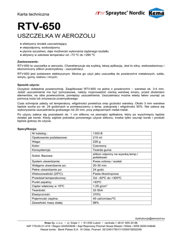 Karta techniczna RTV-650 USZCZELKA W AEROZOLU ● efektywny środek uszczelniający ● olejoodporny, wodoodporny ● płynne szczeliwo, daje możliwość wykonania żądanego kształtu ● aktywny w zakresie temperatur od –73 ºC do +290 ºC Zastosowanie: RTV-650 to uszczelka w aerozolu. Charakteryzuje się szybką, łatwą aplikacją. Jest to silny, wielozadaniowy i ekonomiczny silikon przemysłowy - uszczelniacz. RTV-650 jest izolatorem elektrycznym. Można go użyć jako uszczelkę do powierzchni metalowych, szkła, winylu, gumy, betonu i innych. Sposób użycia: Oczyścić dokładnie powierzchnię. Zaaplikować RTV-650 na jedna z powierzchni – warstwa ok. 3-4 mm. Jeżeli uszczelnienie ma być tymczasowe, należy rozprowadzić cienką warstwę smaru, przed złożeniem elementów, na obie powierzchnie, pomiędzy uszczelnienia. Uszczelniacz można wtedy łatwo usunąć za pomocą noża lub zmywacza przemysłowego. Czas schnięcia zależy od temperatury, wilgotności powietrza oraz grubości warstwy. Około 3 mm warstwa będzie sucha po ok. 24 godzinach w pomieszczeniu o temp. pokojowej i wilgotności 50%. Nie zaleca się wykonywania uszczelnienia grubszego niż 25 mm, przy połączeniach metal-metal. Po użyciu zaleca się pozostawić ok. 1 cm silikonu na zewnątrz aplikatora, który po wyschnięciu będzie działać jak korek. Kiedy zajdzie potrzeba ponownego użycia silikonu, trzeba tylko usunąć korek i produkt będzie gotowy do użycia. Specyfikacja: Nr katalog.: Opakowanie podstawowe: Waga: Kolor: Konsystencja: Subst. Bazowa: System utwardzania: Wstępne utwardzenie po: Pełne utwardzenie po: Wiskozowatość (25ºC): Przedział temperaturowy: Punkt zapalny: Ciężar właściwy w 15ºC Twardość: Elastyczność: Pojemność cieplna: Zawartość masy stałej: 1303 B 215 ml 226 g Czerwony Twarda guma silikon odporny na wysoką temp./ polisiloxan Kwas octowy / acetat 20-30 min. 24 godz. Pasta tiksotropowa Od –50ºC do +300ºC >93ºC 1,05 g/cm3 33 ShA 370% 45 cal/cm/sec/ºC 98% [email protected] Krea Sp. z o.o. • ul. Kręta 1 • 61-030 Luboń • centrala + 48 61 855 20 88 NIP 779-00-21-418 • Regon 632503648 • Sąd Rejonowy Poznań Nowe Miasto i Wilda • KRS 0000144646 Nasze konto: Bank Pekao S.A. III Oddz. Poznań 02124017501111000019052249