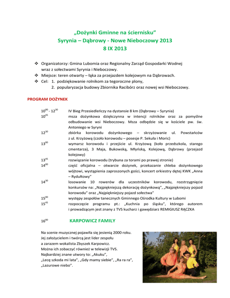 „Dożynki Gminne na ściernisku” Syrynia – Dąbrowy - Nowe Nieboczowy 2013 8 IX 2013 Organizatorzy: Gmina Lubomia oraz Regionalny Zarząd Gospodarki Wodnej wraz z sołectwami Syrynia i Nieboczowy. Miejsce: teren otwarty – łąka za przejazdem kolejowym na Dąbrowach. Cel: 1. podziękowanie rolnikom za tegoroczne plony, 2. popularyzacja budowy Zbiornika Racibórz oraz nowej wsi Nieboczowy. PROGRAM DOŻYNEK 1000 - 1230 1045 1230 1300 1345 1400 1430 1500 1545 1600 IV Bieg Przesiedleńczy na dystansie 8 km (Dąbrowy – Syrynia) msza dożynkowa dziękczynna w intencji rolników oraz za pomyślne odbudowanie wsi Nieboczowy. Msza odbędzie się w kościele pw. św. Antoniego w Syryni zbiórka korowodu dożynkowego – skrzyżowanie ul. Powstańców z ul. Krzyżową (czoło korowodu – posesje P. Sekuła i Moric) wymarsz korowodu i przejście ul. Krzyżową (koło przedszkola, starego cmentarza), 3 Maja, Bukowską, Młyńską, Kolejową, Dąbrowy (przejazd kolejowy) rozwiązanie korowodu (trybuna za torami po prawej stronie) część oficjalna – otwarcie dożynek, przekazanie chleba dożynkowego wójtowi, wystąpienia zaproszonych gości, koncert orkiestry dętej KWK „Anna – Rydułtowy” losowanie 10 rowerów dla uczestników korowodu, rozstrzygnięcie konkursów na: „Najpiękniejszą dekorację dożynkową”, „Najpiękniejszy pojazd korowodu” oraz „Najpiękniejszy pojazd sołectwa” występy zespołów tanecznych Gminnego Ośrodka Kultury w Lubomi rozpoczęcie programu pt.: „Kuchnia po śląsku”, którego autorem i prowadzącym jest znany z TVS kucharz i gawędziarz REMIGIUSZ RĄCZKA KARPOWICZ FAMILY Na scenie muzycznej pojawiła się jesienią 2000 roku. Jej założycielem i twórcą jest lider zespołu a zarazem wokalista Zbyszek Karpowicz. Można ich zobaczyć również w telewizji TVS. Najbardziej znane utwory to: „Akuku”, „Lecę szkoda mi lata”, „Gdy mamy siebie”, „Ra ra ra”, „Lazurowe niebo”. 1720 1730 kontynuacja programu Remigiusza Rączki występy zespołów artystycznych GOK Lubomia, m.in. Chór Echo, Johanki, Syryniczki 1830 Kabaret RAK Krzysztof Hanke, Grzegorz Poloczek i Krzysztof Respondek to trójka artystów Kabaretu „Rak" z Rudy Śląskiej. Krzysztof Hanke zagrał rolę Ślązaka w serialu „Święta wojna”. Krzysztof Respondek został zdobywcą „Perłowego Mikrofonu" w programie Polsatu „Jak oni śpiewają". Ponadto zdobył „Złoty samowar" na Festiwalu Piosenki Rosyjskiej w Zielonej Górze. Gra również w serialu „Barwy szczęścia”. 2000 GWIAZDA WIECZORU – zespół Golec uOrkiestra Zespół Golec uOrkiestra powstał w 1998 roku. Od początku grał muzykę łączącą stylistykę jazzową i bluesową z motywami góralskimi Beskidu Żywieckiego. Pomysł stworzenia grupy zrodził się spontanicznie jako naturalna konsekwencja wspólnego muzykowania sąsiadów i przyjaciół. Liderami zespołu są bracia Paweł i Łukasz Golcowie. Ich największe przeboje, to m.in. „Ściernisko”, „Lornetka”, „Do Milówki wróć”, „Kto się ceni”, „Słodycze”, „ Góralskie Tango”, „Pieniądze to nie wszystko”, „Szarpany”, „Kto się ceni”, „Bo lato rozpala”, „Nie ma nic”, „Już nie zgaśnie ogień w nas”. Zespół został zwycięzcą konkursu SuperPremiery w Opolu, dzięki utworowi „Młody Maj”. 2200 zakończenie imprezy Imprezę poprowadzi Arkadiusz Żabka – znany prezenter z Radia 90 FM UWAGA W godzinach 1500 – 1800 czynny będzie na terenie imprezy punkt konsultacyjny RZGW i Gminy Lubomia, w którym można będzie uzyskać informacje nt. budowy Zbiornika Racibórz i Nowych Nieboczów. Serdecznie zapraszamy Sponsorzy: Patroni medialni:
