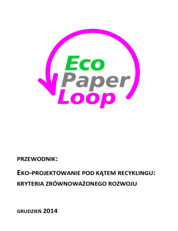 PRZEWODNIK: EKO-PROJEKTOWANIE POD KĄTEM RECYKLINGU: KRYTERIA ZRÓWNOWAŻONEGO ROZWOJU GRUDZIEŃ 2014 Ocena zrównoważonego rozwoju Treść 1. Wstęp ............................................................................................................................................ 2 2. Definicje ........................................................................................................................................ 3 3. Ocena zrównoważonego rozwoju : aspekt ogólny ....................................................................... 4 4. Ocena wpływu recyklingu produktów z papieru .......................................................................... 7 4.1 Graficzne produkty z papieru: ................................................................................................... 8 4.2 Produkty opakowaniowe z papieru: .......................................................................................... 9 Kalkulator zrównoważonego rozwoju................................................................................................ 11 -1- 1. Wstęp Celem tego przewodnika jest przedstawienie w jaki sposób pojęcie zrównoważonego rozwoju rozumiane jest w kontekście cyklu życia produktów z papieru takich jak produkty graficzne i opakowania. Najważniejszym zagadnieniem omawianym w przewodniku jest zrównoważony rozwój w kontekście końca cyklu życia produktów z papieru, szczególnie dotyczący przygotowywania masy do procesu recyklingu. Przewodnik podzielony jest na następujące części: Definicje – w której wyjaśnione są pojęcia recyklingu, zrównoważonego rozwoju oraz cyklu życia i pojęć z nim związanych, Ocena zrównoważonego rozwoju – wprowadzenie do zrównoważonego rozwoju, cyklu życia, oceny wpływów i interpretacji tych pojęć w kontekście produktów z papieru. Ocena wpływu recyklingu produktów z papieru – opis istotnych parametrów zależnych od testów laboratoryjnych produktów graficznych i opakowaniowych z papieru oraz wpływów środowiskowych do obliczania końcowej fazy cyklu życia w procesie LCA. Kalkulator zrównoważonego rozwoju – opis sieciowego narzędzia przekładającego parametry poziomów recyklingu na konkretne emisje środowiskowe i wynik carbon footprint. -2- 2. Definicje Wpływ środowiskowyFehler! Textmarke nicht definiert. – każda zmiana w środowisku, pozytywna lub negatywna, wynikająca pośrednio lub bezpośrednio z działalności firmy, produktów lub usług. Odbarwialność - Usuwanie farby i/lub tonera z wyrobów zadrukowanych w dużym stopniu zależy od wyniku procesu odbarwiania. Powinno to przywrócić wysoki poziom właściwości optycznych wyrobów niezadrukowanych. Możliwość recyklingu – Projektowanie, produkcja i przetwarzanie wyrobów z papieru i tektury z myślą o jakościowym recyklingu włókien i minerałów. Parametry recyklingu – Parametry testowe mierzone metodą laboratoryjną do oceny odbarwialności/możliwości recyklingu wyrobów z papieru. Jednostka procesowaFehler! Textmarke nicht definiert. – najmniejsza portion of product system do której zbierane są dane podczas wykonywania oceny cyklu życia System produktuFehler! Textmarke nicht definiert. – collection of materially and energetically unit processes which perform one or more defined functions Cykl życiaFehler! Textmarke nicht definiert. – consecutive and interlinked stages of a product system, from raw material acquisition or generation of natural resources to the final disposal Ocena Cyklu ŻyciaFehler! Textmarke nicht definiert. – zbiór i ocena udziału, wyników pracy oraz potencjalnych wpływów środowiskowych systemu produktu w całym cyklu życia Ocena wpływu cyklu życia LCIAFehler! Textmarke nicht definiert. – etap cyklu życia dedykowany zrozumieniu i ocenie wielkości oraz wagi potencjalnych wpływów środowiskowych systemu produktu Kategoria wpływu – dotyczy kwestii problematycznych z punktu widzenia środowiska do których można przypisać wyniki badań LCA Carbon Footprint – ilość gazów cieplarnianych, w szczególności dwutlenku węgla, emitowanych przez coś (ludzkie działanie, wyrób produktu, transport) podczas konkretnego okresu. Zrównoważony rozwój – Rozważne wykorzystywanie surowców naturalnych z myślą o przyszłych pokoleniach – innymi słowy, dbanie o to, żeby obecny rozwój nie zagrażał możliwości rozwoju przyszłych generacji. Zrównoważony rozwój zawiera w sobie trzy elementy – ekonomiczny, społeczny oraz środowiskowy, które należy rozpatrywać na tym samym poziomie. Strategia zrównoważonego rozwoju, wdrożona w 2001 i poprawiona w 2005, uzupełniona jest między innymi o zasadę integracji ochrony środowiska z europejską polityką wpływania na środowisko. -3- 3. Ocena zrównoważonego rozwoju : aspekt ogólny Działania organizacji ekologicznych, większa świadomość społeczna, zaostrzanie przepisów prawnych oraz rozwój wiedzy o wpływie produktów na środowisko doprowadziły do utworzenia szeregów metod oceny wpływu usług i produktów na środowisko. Przykładem takiej pomyślnie wdrożonej metody jest Ocena Cyklu Życia (LCA). LCA umożliwia śledzenie przebieg cyklu życia produktu od wytworzenia aż do momentu odzysku lub składowania jako odpadu i jest naturalnym przedłużeniem zarówno strategii zarządzania odpadami jak i systemów zarządzania środowiskiem. Metodologia LCA może służyć do oceny produktów, wybranych procesów produkcji, usług, systemów zarządzania w firmach a także do oceny ekonomii jako takiej. LCA umożliwia ocenę aspektów i wpływów środowiskowych wynikających ze wszystkich etapów cyklu życia, w tym: Pozyskiwanie i przetwarzanie surowców naturalnych Produkcja Dystrybucja Transport Użytkowanie Ponowne użytkowanie Recykling lub inne sposoby odzysku Gospodarowanie odpadami Międzynarodowa Organizacja Normalizacyjna (ISO) definiuje LCA jako technikę 