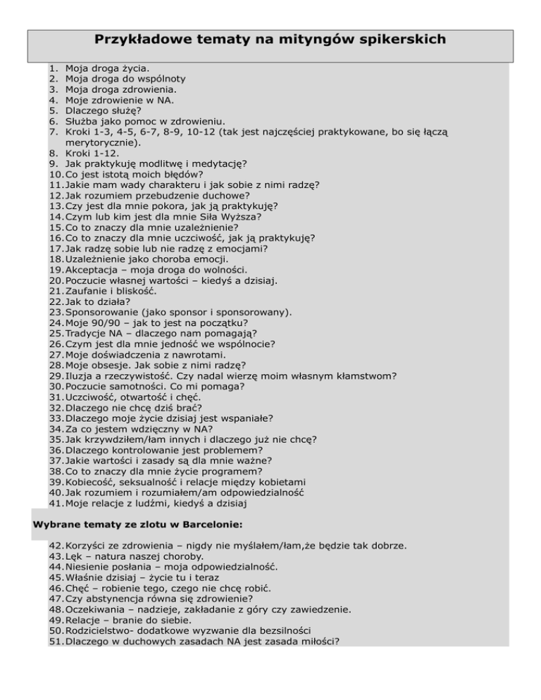 Przykładowe tematy na mityngów spikerskich 1. 2. 3. 4. 5. 6. 7. Moja droga życia. Moja droga do wspólnoty Moja droga zdrowienia. Moje zdrowienie w NA. Dlaczego służę? Służba jako pomoc w zdrowieniu. Kroki 1-3, 4-5, 6-7, 8-9, 10-12 (tak jest najczęściej praktykowane, bo się łączą merytorycznie). 8. Kroki 1-12. 9. Jak praktykuję modlitwę i medytację? 10. Co jest istotą moich błędów? 11. Jakie mam wady charakteru i jak sobie z nimi radzę? 12. Jak rozumiem przebudzenie duchowe? 13. Czy jest dla mnie pokora, jak ją praktykuję? 14. Czym lub kim jest dla mnie Siła Wyższa? 15. Co to znaczy dla mnie uzależnienie? 16. Co to znaczy dla mnie uczciwość, jak ją praktykuję? 17. Jak radzę sobie lub nie radzę z emocjami? 18. Uzależnienie jako choroba emocji. 19. Akceptacja – moja droga do wolności. 20. Poczucie własnej wartości – kiedyś a dzisiaj. 21. Zaufanie i bliskość. 22. Jak to działa? 23. Sponsorowanie (jako sponsor i sponsorowany). 24. Moje 90/90 – jak to jest na początku? 25. Tradycje NA – dlaczego nam pomagają? 26. Czym jest dla mnie jedność we wspólnocie? 27. Moje doświadczenia z nawrotami. 28. Moje obsesje. Jak sobie z nimi radzę? 29. Iluzja a rzeczywistość. Czy nadal wierzę moim własnym kłamstwom? 30. Poczucie samotności. Co mi pomaga? 31. Uczciwość, otwartość i chęć. 32. Dlaczego nie chcę dziś brać? 33. Dlaczego moje życie dzisiaj jest wspaniałe? 34. Za co jestem wdzięczny w NA? 35. Jak krzywdziłem/łam innych i dlaczego już nie chcę? 36. Dlaczego kontrolowanie jest problemem? 37. Jakie wartości i zasady są dla mnie ważne? 38. Co to znaczy dla mnie życie programem? 39. Kobiecość, seksualność i relacje między kobietami 40. Jak rozumiem i rozumiałem/am odpowiedzialność 41. Moje relacje z ludźmi, kiedyś a dzisiaj Wybrane tematy ze zlotu w Barcelonie: 42. Korzyści ze zdrowienia – nigdy nie myślałem/łam,że będzie tak dobrze. 43. Lęk – natura naszej choroby. 44. Niesienie posłania – moja odpowiedzialność. 45. Właśnie dzisiaj – życie tu i teraz 46. Chęć – robienie tego, czego nie chcę robić. 47. Czy abstynencja równa się zdrowienie? 48. Oczekiwania – nadzieje, zakładanie z góry czy zawiedzenie. 49. Relacje – branie do siebie. 50. Rodzicielstwo- dodatkowe wyzwanie dla bezsilności 51. Dlaczego w duchowych zasadach NA jest zasada miłości?