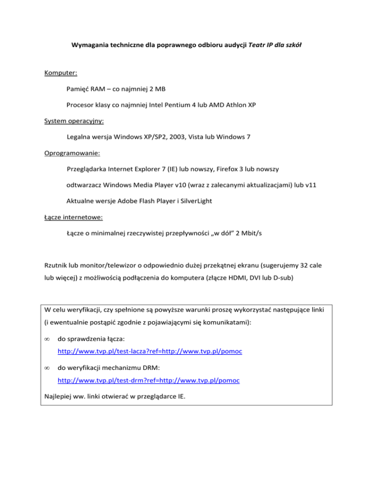 Wymagania techniczne dla poprawnego odbioru audycji Teatr IP dla szkół Komputer: Pamięć RAM – co najmniej 2 MB Procesor klasy co najmniej Intel Pentium 4 lub AMD Athlon XP System operacyjny: Legalna wersja Windows XP/SP2, 2003, Vista lub Windows 7 Oprogramowanie: Przeglądarka Internet Explorer 7 (IE) lub nowszy, Firefox 3 lub nowszy odtwarzacz Windows Media Player v10 (wraz z zalecanymi aktualizacjami) lub v11 Aktualne wersje Adobe Flash Player i SilverLight Łącze internetowe: Łącze o minimalnej rzeczywistej przepływności „w dół” 2 Mbit/s Rzutnik lub monitor/telewizor o odpowiednio dużej przekątnej ekranu (sugerujemy 32 cale lub więcej) z możliwością podłączenia do komputera (złącze HDMI, DVI lub D-sub) W celu weryfikacji, czy spełnione są powyższe warunki proszę wykorzystać następujące linki (i ewentualnie postąpić zgodnie z pojawiającymi się komunikatami): • do sprawdzenia łącza: http://www.tvp.pl/test-lacza?ref=http://www.tvp.pl/pomoc • do weryfikacji mechanizmu DRM: http://www.tvp.pl/test-drm?ref=http://www.tvp.pl/pomoc Najlepiej ww. linki otwierać w przeglądarce IE.