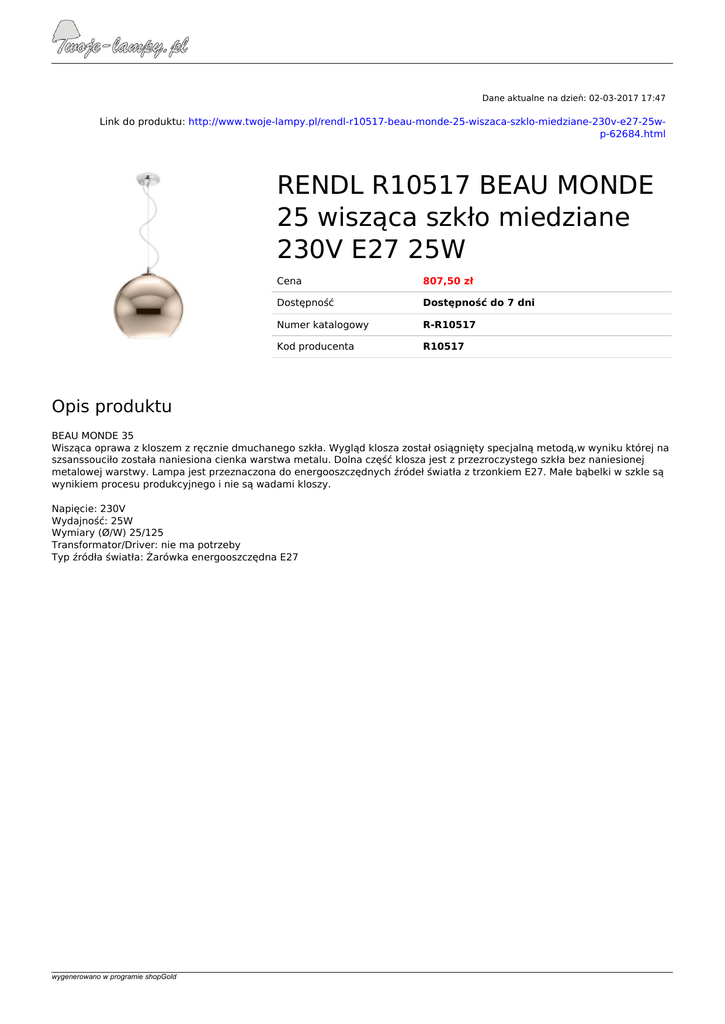 Dane aktualne na dzień: 02-03-2017 17:47 Link do produktu: http://www.twoje-lampy.pl/rendl-r10517-beau-monde-25-wiszaca-szklo-miedziane-230v-e27-25wp-62684.html RENDL R10517 BEAU MONDE 25 wisząca szkło miedziane 230V E27 25W Cena 807,50 zł Dostępność Dostępność do 7 dni Numer katalogowy R-R10517 Kod producenta R10517 Opis produktu BEAU MONDE 35 Wisząca oprawa z kloszem z ręcznie dmuchanego szkła. Wygląd klosza został osiągnięty specjalną metodą,w wyniku której na szsanssouciło została naniesiona cienka warstwa metalu. Dolna część klosza jest z przezroczystego szkła bez naniesionej metalowej warstwy. Lampa jest przeznaczona do energooszczędnych źródeł światła z trzonkiem E27. Małe bąbelki w szkle są wynikiem procesu produkcyjnego i nie są wadami kloszy. Napięcie: 230V Wydajność: 25W Wymiary (Ø/W) 25/125 Transformator/Driver: nie ma potrzeby Typ źródła światła: Żarówka energooszczędna E27 wygenerowano w programie shopGold Powered by TCPDF (www.tcpdf.org)