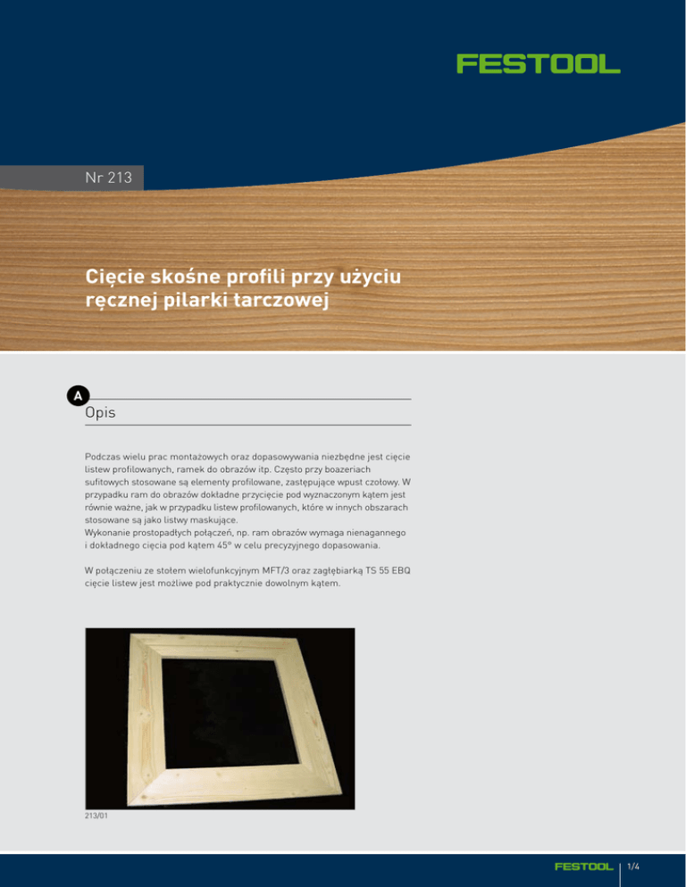 Nr 213 Cięcie skośne profili przy użyciu ręcznej pilarki tarczowej A Opis Podczas wielu prac montażowych oraz dopasowywania niezbędne jest cięcie listew profilowanych, ramek do obrazów itp. Często przy boazeriach sufitowych stosowane są elementy profilowane, zastępujące wpust czołowy. W przypadku ram do obrazów dokładne przycięcie pod wyznaczonym kątem jest równie ważne, jak w przypadku listew profilowanych, które w innych obszarach stosowane są jako listwy maskujące. Wykonanie prostopadłych połączeń, np. ram obrazów wymaga nienagannego i dokładnego cięcia pod kątem 45° w celu precyzyjnego dopasowania. W połączeniu ze stołem wielofunkcyjnym MFT/3 oraz zagłębiarką TS 55 EBQ cięcie listew jest możliwe pod praktycznie dowolnym kątem. 213/01 1/4 B Urządzenia/wyposażenie Do przycięcia listew niezbędne są następujące maszyny oraz środki pomocnicze: Nazwa Stół wielofunkcyjny MFT/3 (rys. 213/02) (szyna prowadząca FS 1080/2 i przykładnica kątowa w zakresie dostawy) 213/02 opcjonalnie: Elementy mocujące MFT-SP (rys. 213/03) lub Ścisk dźwigniowy FS-HZ 160 Nr zamów. 495315 488030 491594 Ręczna pilarka tarczowa TS 55 EBQ-Plus (rys. 213/05) 561162 Piła tarczowa z zębem drobnym W48 (w zakresie dostawy TS 55EBQ) 491952 Zabezpieczenie przeciwodpryskowe FS-SP 1400/T 495207 Odkurzacz mobilny serii CTM (rys. 211/06) 213/03 213/04 213/05 213/06 2/4 C Przygotowanie/ustawienie 1. Przygotowanie ręcznej pilarki tarczowej 213/07 •• Zamontować tarczę pilarską W48 na pilarce TS 55 EBQ. •• Ustawić ręczną pilarkę tarczową na szynie prowadzącej. •• Wyregulować luz stołu pilarskiego na szynie prowadzącej (patrz. rys. 213/07). •• Ustawić głębokość cięcia na pilarce TS 55 EBQ. Tarcza pilarska powinna wcinać się na 5 mm (nie więcej) w płytę stołu wielofunkcyjnego. •• Ustawić 6 stopień prędkości obrotowej i podłączyć wąż ssący. •• Wskazówka: w razie potrzeby należy wymienić zabezpieczenie przeciwodpryskowe na szynie prowadzącej. Jest to uzasadnione wtedy, gdy na szynie prowadzącej stosowane były wcześniej inne tarcze pilarskie lub też inne maszyny. Nowo założone na szynę prowadzącą zabezpieczenie przeciwodpryskowe nacinane jest następnie przy użyciu pilarki TS 55 (patrz rys. 213/8). Dzięki temu można zapewnić dokładne ustawienie linii cięcia w stosunku do krawędzi zabezpieczenia przeciwodpryskowego. 213/08 2. Przygotowanie stołu wielofunkcyjnego (MFT) •• Ustawić odpowiedni kąt za pomocą przykładnicy kątowej na stole wielofunkcyjnym. Zwracać uwagę na to, aby śruba ustalająca była dokręcona, w celu zapobieżenia przesunięciu się ogranicznika. •• Sprawdzić ustawienie kąta za pomocą kątomierza. •• Ustawić szynę prowadzącą na odpowiednią wysokość. Powinna ona odpowiadać wysokości przecinanej listwy. 213/09 Wskazówka: aby szyna prowadząca nie uginała się, na środku szyny należy podłożyć kawałek drewna o takiej samej grubości, jak listwa profilowana. 3/4 E Sposób postępowania 1. Wykonać cięcie skośne z jednej strony: 213/10 •• Listwy ramowe należy zaznaczyć w miejscu cięcia przy użyciu kątomierza lub ekierki. •• Wyrównać linię nacięcia w stosunku do krawędzi zabezpieczenia przeciwodpryskowego i zamocować listwę przy użyciu elementów mocujących lub ścisków dźwigniowych. •• Włączyć ręczną pilarkę tarczową i docisnąć na ustawioną głębokość cięcia. •• Wykonać cięcie skośne wszystkich czterech listew. 2. Wykonać cięcie skośne z drugiej strony: •• Ustawić długość listwy ramowej za pomocą przymiaru taśmowego na zderzaku przesuwnym w stosunku do krawędzi zabezpieczenia przeciwodpryskowego (patrz. rys. 213/11). 213/11 •• Dosunąć listwę ramową do zderzaka przesuwnego i zamocować przy użyciu ścisku dźwigniowego lub elementów mocujących (patrz. rys. 213/12). •• Wykonać drugie cięcie skośne wszystkich czterech listew. 213/12 Prezentowany przykład zastosowania jest sprawdzonym i wypróbowanym w praktyce sposobem postępowania. Jednak różne warunki i parametry występujące w rzeczywistości są całkowicie poza naszym wpływem. Dlatego wykluczamy udzielanie wszelkich gwarancji. Stąd też nie mogą być wysuwane przeciwko nam jakiekolwiek roszczenia prawne. W każdym przypadku należy postępować zgodnie ze wskazówkami dotyczącymi bezpieczeństwa i instrukcją obsługi, dołączanymi do każdego produktu. www.festool.pl 4/4