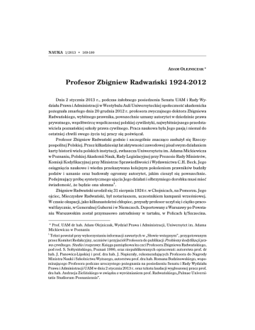 NAUKA 1/2013 • 169-180 ADAM OLEJNICZAK * Profesor Zbigniew Radwański 1924-2012 Dnia 2 stycznia 2013 r., podczas żałobnego posiedzenia Senatu UAM i Rady Wydziału Prawa i Administracji w Westybulu Auli Uniwersyteckiej społeczność akademicka pożegnała zmarłego dnia 20 grudnia 2012 r. profesora zwyczajnego doktora Zbigniewa Radwańskiego, wybitnego prawnika, powszechnie uznany autorytet w dziedzinie prawa prywatnego, współtwórcę współczesnej polskiej cywilistyki, najwybitniejszego przedstawiciela poznańskiej szkoły prawa cywilnego. Praca naukowa była Jego pasją i niemal do ostatniej chwili swego życia tej pracy się poświęcał. Profesor Zbigniew Radwański godnie i szczególnie znacząco zasłużył się Rzeczypospolitej Polskiej. Przez kilkadziesiąt lat aktywności zawodowej pisał swym działaniem karty historii wielu polskich instytucji, zwłaszcza Uniwersytetu im. Adama Mickiewicza w Poznaniu, Polskiej Akademii Nauk, Rady Legislacyjnej przy Prezesie Rady Ministrów, Komisji Kodyfikacyjnej przy Ministrze Sprawiedliwości i Wydawnictwa C.H. Beck. Jego osiągnięcia naukowe i wiedza przekazywana kolejnym pokoleniom prawników budziły podziw i uznanie oraz budowały ogromny autorytet, jakim cieszył się powszechnie. Podejmujący próbę syntetycznego ujęcia Jego działań i olbrzymiego dorobku musi mieć świadomość, że będzie ona ułomna1. Zbigniew Radwański urodził się 31 sierpnia 1924 r. w Chojnicach, na Pomorzu. Jego ojciec, Mieczysław Radwański, był notariuszem, uczestnikiem kampanii wrześniowej. W czasie okupacji, jako kilkunastoletni chłopiec, przyszły profesor uczył się i ciężko pracował fizycznie, w Generalnej Guberni i w Niemczech. Deportowany z Warszawy po Powstaniu Warszawskim został przymusowo zatrudniony w tartaku, w Policach k/Szczecina. * Prof. UAM dr hab. Adam Olejniczak, Wydział Prawa i Administracji, Uniwersytet im. Adama Mickiewicza w Poznaniu 1 Tekst powstał przy wykorzystaniu informacji zawartych w „Słowie wstępnym”, przygotowanym przez Komitet Redakcyjny, uczniów i przyjaciół Profesora do publikacji Problemy kodyfikacji prawa cywilnego. Studia i rozprawy. Księga pamiątkowa ku czci Profesora Zbigniewa Radwańskiego, pod red. S. Sołtysińskiego, Poznań 1990, oraz niepublikowanych opracowań: autorstwa prof. dr hab. J. Panowicz-Lipskiej i prof. dra hab. J. Napierały, rekomendujących Profesora do Nagrody Ministra Nauki i Szkolnictwa Wyższego, autorstwa prof. dra hab. Romana Budzinowskiego, wspominającego Profesora podczas uroczystego pożegnania na posiedzeniu Senatu i Rady Wydziału Prawa i Administracji UAM w dniu 2 stycznia 2013 r. oraz tekstu laudacji wygłoszonej przez prof. dra hab. Andrzeja Zielińskiego w związku z wyróżnianiem prof. Radwańskiego„Palmae Universitatis Studiorum Posnaniensis". 170 A. Olejniczak Jak wspominał, sprzyjało mu szczęście, ponieważ nie stracił życia na skutek kilkukrotnych ciężkich alianckich nalotów bombowych. Miały one za cel, sąsiadującą z barakami, w których byli zakwaterowani robotnicy przymusowi, fabrykę chemiczną w Policach, produkującą benzynę syntetyczną, a także pobliskie Peenemünde, gdzie w ośrodkach doświadczalnych były prowadzone próby prototypów samolotów i nowych broni lotniczych, w tym budowa bezpilotowego samolotu-pocisku, znanego później pod nazwą V-1 oraz budowa rakiety pionowego startu, znanej później jako V-2. Po zakończeniu wojny na rowerze wrócił do Chojnic, gdzie przez władze wojskowe został zmobilizowany i wcielony na kilka miesięcy do straży pożarnej. Cały czas nie zaniedbywał jednak nauki i maturę zdał jeszcze we wrześniu 1945 r. w Stargardzie Gdańskim. Na studia wybrał Poznań. Na Wydziale Prawno-Ekonomicznym Uniwersytetu Poznańskiego studia prawnicze ukończył w 1948 r. Od 1949 r. podjął pracę naukową na poznańskiej uczelni i na Wydziale Prawa i Administracji Uniwersytetu im. Adama Mickiewicza w Poznaniu (w tym czasie uczelnia i wydział zmieniły nazwy) pracował aż do przejścia na emeryturę w 1994 r., obejmując kolejno stanowiska od asystenta do profesora zwyczajnego (tytuł profesora zwyczajnego uzyskał w 1977 r.). Dla zdobycia odpowiedniej wiedzy prawniczej i jak sam twierdził, niejako z ostrożności, gdy w tych trudnych czasach nie mógł kontynuować pracy na uczelni, zdecydował się na aplikację sądową (1948-1950), a następnie także aplikację adwokacką (1951-1954). Odbył wiele staży oraz prowadził badania i wykłady w zagranicznych ośrodkach naukowych, m.in. we Fryburgu Bryzgowijskim, Paryżu, Berlinie, Bonn, Hamburgu, Monachium i Münster. Spośród wielu stanowisk i funkcji publicznych pełnionych przez prof. Zbigniewa Radwańskiego niektóre wyróżniają się szczególnie. Był pierwszym kierownikiem nowo powstałego na Wydziale Prawa i Administracji UAM Zawodowego Studium Administracji, następnie prodziekanem (1965-1966) i przez dwie kadencje dziekanem Wydziału Prawa i Administracji UAM (1966-1972), a następnie w latach 1982-1984 rektorem Uniwersytetu. To ostatnie stanowisko wieńczyło Jego karierę uniwersytecką, ale przysporzyło mu też wielu ogromnych problemów. Podjął się tej funkcji w niezwykle trudnym okresie stanu wojennego, po uzyskaniu zgody wszystkich dziekanów Uniwersytetu. Ta decyzja i dalsze działania wymagały od Profesora ogromnej odwagi i były przejawem cechującej go zawsze odpowiedzialności, która zapewniała mu szacunek i uznanie, którym cieszył się w społeczności akademickiej. Profesor Radwański bardzo umiejętnie wywiązał się z tych trudnych obowiązków. Decydował bardzo pragmatycznie, a wielu studentów i pracowników Uniwersytetu zawdzięczało mu skuteczną ochronę przed zagrożeniami związanymi z działaniami podejmowanymi przez aparat stanu wojennego. Bywało, że musiał stawiać na szali cały swój autorytet, groził dymisją. Po latach podkreślał, że był to Jego obowiązek. Profesor Zbigniew Ra