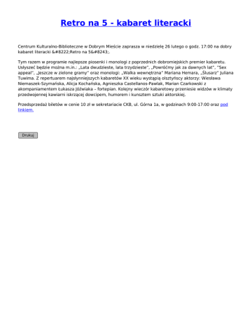 Retro na 5 - kabaret literacki Centrum Kulturalno-Biblioteczne w Dobrym Mieście zaprasza w niedzielę 26 lutego o godz. 17:00 na dobry kabaret literacki „Retro na 5″. Tym razem w programie najlepsze piosenki i monologi z poprzednich dobromiejskich premier kabaretu. Usłyszeć będzie można m.in.: „Lata dwudzieste, lata trzydzieste”, „Powróćmy jak za dawnych lat”, ”Sex appeal”, „Jeszcze w zielone gramy” oraz monologi: „Walka wewnętrzna” Mariana Hemara, „Ślusarz” Juliana Tuwima. Z repertuarem najsłynniejszych kabaretów XX wieku wystąpią olsztyńscy aktorzy: Wiesława Niemaszek-Szymańska, Alicja Kochańska, Agnieszka Castellanos-Pawlak, Marian Czarkowski z akompaniamentem Łukasza Jóźwiaka – fortepian. Kolejny wieczór kabaretowy przeniesie widzów w klimaty przedwojennej kawiarni iskrzącej dowcipem, humorem i kunsztem sztuki aktorskiej. Przedsprzedaż biletów w cenie 10 zł w sekretariacie CKB, ul. Górna 1a, w godzinach 9:00-17:00 oraz pod linkiem. Drukuj