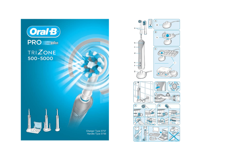 Polski Twoja Szczoteczka Oral-B® została specjalnie zaprojektowana aby w trakcie mycia zębów dać Tobie i Twojej Rodzinie unikalne, zarówno bezpieczne jak i efektywne doświadczenie. . WAŻNE • Okresowo sprawdzaj czy przewód nie jest uszkodzony. Jeśli przewód jest uszkodzony należy zabrać stację ładującą do Centrum Serwisowego Oral-B Braun. Nie należy używać uszkodzonego lub niesprawnego urządzenia. Nie naprawiaj produktu samodzielnie, ponieważ możesz wywołać pożar, narazić się na porażenie prądem lub inne uszkodzenie ciała. • Ten produkt nie jest przeznaczony do użytkowania przez dzieci poniżej 3 roku życia. Dzieci od lat 3 do 14 oraz osoby o ograniczonych zdolnościach fizycznych, sensorycznych lub psychicznych, a także niemające doświadczenia i niezbędnej wiedzy, mogą używać szczoteczki pod nadzorem lub jeśli wyjaśniono im, jak korzystać z urządzenia w bezpieczny sposób i jakie wiążą się z tym zagrożenia. • Czyszczenie i konserwacja nie powinny być wykonywane przez dzieci. • Dzieci nie mogą bawić się tym urządzeniem. • Należy używać tego produktu wyłącznie zgodnie z jego przeznaczeniem, w sposób opisany w instrukcji obsługi. Nie należy używać dodatków, które nie są rekomendowane przez producenta. OSTRZEŻENIE • Jeśli produkt zostanie upuszczony, końcówka szczotki powinna zostać wymieniona przed ponownym użyciem nawet, jeśli nie ma widocznych uszkodzeń. • Nie należy umieszczać stacji ładującej w wodzie lub innej cieczy a także umieszczać lub przechowywać w miejscu, z którego może spaść lub zostać strącona do wanny lub umywalki. Nie sięgaj po stację ładującą, która wpadła do wody. Natychmiast odłącz ją od zasilania. • Nie rozmontowywać produktu w innym celu niż wymiana baterii. Przy wymianie baterii w celu utylizacji należy zachować szczególną ostrożność by nie zewrzeć ze sobą końcówki dodatniej (+) i ujemnej (–). • Podczas odłączania należy zawsze trzymać za wtyczkę, nie za przewód. Nie należy dotykać wtyczki mokrymi rękoma. Może to spowodować porażenie prądem. • Jeśli jesteś w trakcie leczenia stomatologicznego skonsultuj się ze swoim lekarzem stomatologiem przed użyciem. • Szczoteczka elektryczna jest przeznaczona do indywidualnej pielęgnacji jamy ustnej. Nie powinna być używana przez wielu pacjentów lecznic i gabinetów stomatologicznych. • Wymieniaj szczotki (główki), co 3 miesiące lub wcześniej, jeśli główka szczoteczki ulegnie zużyciu. Opis a Końcówka szczoteczki b Lampka czujnika nacisku (w zależności od modelu)c Przycisk włączyć/wyłączyć (wybór trybu) d Rączka e Lampka wskaźnika naładowania f Lampka wskaźnika rozładowania g Stacja ładująca h Uchwyt na końcówki szczoteczki (w zależności od modelu) i Pojemnik z pokrywką na końcówki szczoteczki (w zależności od modelu) Dane techniczne Dane dotyczące napięcia są podane na spodzie ładowarki. Poziom hałasu: ≤65 dB (A) Podłączanie i ładowanie Szczoteczka ma wodoodporną rączkę, nie stwarza zagrożenia elektrycznego i jest przystosowana do użytku w łazience. • Podłącz ładowarkę (g) lub bazę ładującą (rysunek B/C) do gniazdka elektrycznego i wstaw rączkę szczoteczki (d) w urządzenie ładujące. • Zielona lampka wskaźnika ładowania (e) miga, kiedy rączka się ładuje. Kiedy zostanie całkowicie naładowana, lampka się wyłącza. Pełne naładowanie może zająć do 22 godzin i pozwala na maksimum siedem dni regularnego szczotkowania (dwa razy dziennie po 2 minuty) (rysunek 1). Uwaga: po całkowitym rozładowaniu zielona lampka wskaźnika ładowania może nie zacząć migać natychmiast; może to potrwać do 10– 15 minut. • Jeśli akumulator jest słabo naładowany, czerwona lampka wskaźnika naładowania (f) miga przez kilka sekund, gdy wyłączasz lub włączasz szczoteczkę. • Przy codziennym użytkowaniu rączka szczoteczki może być przechowywana na podłączonej ładowarce, aby utrzymać pełną moc urządzenia. Przeciążenie podczas ładowania nie jest możliwe. • Aby utrzymać maksymalną wydajność akumulatora, wyłączaj ładowarkę z kontaktu i pozwalaj na całkowite rozładowanie rączki, przy regularnym użytkowaniu, przynajmniej raz na 6 miesięcy. 2 Używanie szczoteczki Technika szczotkowaniae Zmocz główkę szczoteczki i nanieś pastę do zębów. Aby uniknąć zachlapania, włóż szczoteczkę do ust, zanim włączysz urządzenie (rysunek 2). Jeśli szczotkujesz zęby jedną z oscylacyjno-rotacyjnych końcówek OralB, przesuwaj ją powoli od zęba do zęba szczotkując każdą powierzchnię po kilka sekund (rysunek 5). Jeśli używasz końcówki Oral-B TriZone, ustaw włoski szczoteczki na zębach pod niewielkim kątem w kierunku linii dziąseł. Naciśnij lekko i zacznij szczotkować ruchami do tyłu i do przodu, tak, jak szczoteczką manualną (rysunek 6). Niezależnie od rodzaju końcówki, szczotkowanie należy rozpocząć od strony zewnętrznej zębów, w kierunku strony wewnętrznej, a na koniec wyczyścić powierzchnie żujące. Wszystkie cztery ćwiartki jamy ustnej należy szczotkować w ten sam sposób. Nie należy zbyt mocno naciskać w trakcie szczotkowania. Można także skonsultować się z dentystą lub higienistą stomatologicznym, aby dowiedzieć się więcej na temat właściwej techniki. W pierwszych dniach korzystania z elektrycznej szczoteczki do zębów, dziąsła mogą nieznacznie krwawić. Krwawienie powinno ustąpić po kilku dniach. Jeśli jednak utrzymuje się po dwóch tygodniach, należy skonsultować się z dentystą lub higienistą stomatologicznym. W przypadku wrażliwych zębów i dziąseł, Oral-B zaleca stosowanie trybu «Delikatne czyszczenie» (w zależności od modelu) ( opcjonalnie w połączeniu z końcówką Oral-B «Sensitive»). Brushing modes (depending on model) Model Model Model Model Model Tryby szczotkowania (dla rączki 5001000800 2000 3000 