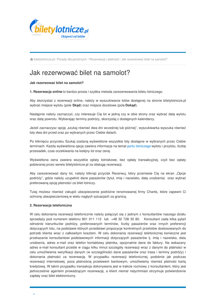 Poradnik podróżnika biletylotnicze.pl / Porady dla poróżnych / Rezerwacja i płatność / Jak rezerwować bilet na samolot? Jak rezerwować bilet na samolot? Jak rezerwować bilet na samolot? 1. Rezerwacja online to bardzo prosta i szybka metoda zarezerwowania biletu lotniczego. Aby skorzystać z rezerwacji online, należy w wyszukiwarce lotów dostępnej na stronie biletylotnicze.pl wybrać miejsce wylotu (pole Skąd) oraz miejsce docelowe (pole Dokąd). Następnie należy zaznaczyć, czy interesuje Cię lot w jedną czy w obie strony oraz wybrać datę wylotu oraz datę powrotu. Wybierając terminy podróży, skorzystaj z dostępnych kalendarzy. Jeżeli zaznaczysz opcję „szukaj również dwa dni wcześniej lub później”, wyszukiwarka wyszuka również loty dwa dni przed oraz po wybranych przez Ciebie datach. Po kliknięciu przycisku Szukaj zostaną wyświetlone wszystkie loty dostępne w wybranych przez Ciebie terminach. Każda wyświetlona opcja zawiera informacje na temat portu lotniczego wylotu i przylotu, liczbę przesiadek, czas oczekiwania na kolejny lot oraz cenę. Wyświetlona cena zawiera wszystkie opłaty lotniskowe, bez opłaty transakcyjnej, czyli bez opłaty pobieranej przez serwis biletylotnicze.pl za obsługę rezerwacji. Aby zarezerwować dany lot, należy kliknąć przycisk Rezerwuj, który przeniesie Cię na ekran „Opcje podróży”, gdzie należy uzupełnić dane pasażerów (tytuł, imię i nazwisko, datę urodzenia) oraz wybrać preferowaną opcję płatności za bilet lotniczy. Tutaj możesz również zakupić ubezpieczenie podróżne renomowanej firmy Chartis, które zapewni Ci ochronę ubezpieczeniową w wielu nagłych sytuacjach za granicą. 2. Rezerwacja telefoniczna W celu dokonania rezerwacji telefonicznie należy połączyć się z jednym z konsultantów naszego działu sprzedaży pod numerem telefonu 801 011 112 lub +48 32 728 30 80. Konsultant zada kilka pytań odnośnie kierunku/ów podróży, preferowanych terminów, liczby pasażerów oraz innych preferencji dotyczących lotu, na podstawie których przedstawi propozycje konkretnych przelotów dostosowanych do potrzeb klienta wraz z całkowitym kosztem. W celu dokonania rezerwacji telefonicznej konieczne jest przekazanie konsultantowi podstawowych informacji dotyczących pasażerów tj. imię i nazwisko, data urodzenia, adres e-mail oraz telefon kontaktowy płatnika, opcjonalnie dane do faktury. Na wskazany adres e-mail konsultant prześle w ciągu kilku minut szczegóły rezerwacji wraz z danymi do płatności w celu umożliwienia weryfikacji danych (w szczególności dane pasażerów oraz trasa i terminy podróży) i dokonania płatności za rezerwację. W przypadku rezerwacji telefonicznej, podobnie jak podczas rezerwacji internetowej, poza płatnością przelewem bankowym, umożliwiamy również płatność kartą kredytową. W takim przypadku transakcja dokonywana jest w trakcie rozmowy z konsultantem, który jest jednocześnie agentem prowadzącym rezerwację, a klient niemal natychmiast otrzymuje potwierdzenie zapłaty oraz bilet elektroniczny.