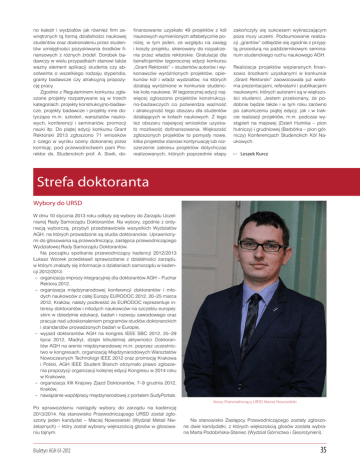 no katedr i wydziałów jak również firm zewnętrznych tą formą działalności naukowej studentów oraz doskonaleniu przez studentów umiejętności pozyskiwania środków finansowych z różnych źródeł. Dorobek badawczy w wielu przypadkach stanowi także ważny element aplikacji studenta czy absolwenta o wszelkiego rodzaju stypendia, granty badawcze czy atrakcyjną propozycję pracy. Zgodnie z Regulaminem konkursu zgłaszane projekty rozpatrywane są w trzech kategoriach: projekty konstrukcyjno-badawcze, projekty badawcze i projekty inne dotyczące m.in. szkoleń, warsztatów naukowych, konferencji i seminariów, promocji nauki itp. Do piątej edycji konkursu Grant Rektorski 2013 zgłoszono 71 wniosków z czego w wyniku oceny dokonanej przez komisję, pod przewodnictwem pani Prorektor ds. Studenckich prof. A. Siwik, do- finansowanie uzyskało 49 projektów z kół naukowych wymienionych alfabetycznie poniżej, w tym jeden, ze względu na zasięg i koszty projektu, skierowany do rozpatrzenia przez władze rektorskie. Gratulacje dla beneficjentów tegorocznej edycji konkursu „Grant Rektorski” – studentów autorów i wykonawców wyróżnionych projektów, opiekunów kół i władz wydziałów, na których działają wyróżnione w konkursie studenckie koła naukowe. W tegorocznej edycji najwięcej zgłoszono projektów konstrukcyjno-badawczych co potwierdza ważność i atrakcyjność tego obszaru dla studentów działających w kołach naukowych. Z tego też obszaru najwięcej wniosków uzyskało możliwość dofinansowania. Większość zgłoszonych projektów to pomysły nowe, kilka projektów stanowi kontynuację lub rozszerzenie zakresu projektów dotychczas realizowanych, których poprzednie etapy zakończyły się sukcesem wykraczającym poza mury uczelni. Podsumowanie realizacji „grantów” odbędzie się zgodnie z przyjętą procedurą na październikowym seminarium studenckiego ruchu naukowego AGH. Realizacja projektów wspieranych finansowo środkami uzyskanymi w konkursie „Grant Rektorski” zaowocowała już wieloma prezentacjami, referatami i publikacjami naukowymi, których autorami są w większości studenci. Jestem przekonany, że podobnie będzie także i w tym roku zarówno po zakończeniu piątej edycji, jak i w trakcie realizacji projektów, m.in. podczas wystąpień na majowej (Dzień Hutnika – pion hutniczy) i grudniowej (Barbórka – pion górniczy) Konferencjach Studenckich Kół Naukowych. • Leszek Kurcz Strefa doktoranta Wybory do URSD W dniu 10 stycznia 2013 roku odbyły się wybory do Zarządu Uczelnianej Rady Samorządu Doktorantów. Na wybory, zgodnie z ordynacją wyborczą, przybyli przedstawiciele wszystkich Wydziałów AGH, na których prowadzone są studia doktoranckie. Uprawnionymi do głosowania są przewodniczący, zastępca przewodniczącego Wydziałowej Rady Samorządu Doktorantów. Na początku spotkania przewodniczący kadencji 2012/2013 Łukasz Wzorek przedstawił sprawozdanie z działalności zarządu, w którym znalazły się informacje o działaniach samorządu w kadencji 2012/2013: – organizacja imprezy integracyjnej dla doktorantów AGH – Puchar Rektora 2012, – organizacja międzynarodowej konferencji doktorantów i młodych naukowców z całej Europy EURODOC 2012, 20–25 marca 2012, Kraków, należy podkreślić że EURODOC reprezentuje interesy doktorantów i młodych naukowców na szczeblu europejskim w dziedzinie edukacji, badań i rozwoju zawodowego oraz pracuje nad udoskonaleniem programów studiów doktoranckich i standardów prowadzonych badań w Europie, – wyjazd doktorantów AGH na kongres IEEE SBC 2012, 25–29 lipca 2012, Madryt, dzięki kilkuletniej aktywności Doktorantów AGH na arenie międzynarodowej m.in. poprzez uczestnictwo w kongresach, organizację Międzynarodowych Warsztatów Nowoczesnych Technologii IEEE 2012 oraz promocję Krakowa i Polski, AGH IEEE Student Branch otrzymało prawo zgłoszenia propozycji organizacji kolejnej edycji Kongresu w 2014 roku w Krakowie, – organizacja XIII Krajowy Zjazd Doktorantów, 7–9 grudnia 2012, Kraków, – nawiązanie współpracy międzynarodowej z portalem SudyPortals. Nowy Przewodniczący URSD Maciej Nowosielski Po sprawozdaniu nastąpiły wybory do zarządu na kadencję 2013/2014. Na stanowisko Przewodniczącego URSD został zgłoszony jeden kandydat – Maciej Nowosielski (Wydział Metali Nieżelaznych) – który został wybrany większością głosów w głosowaniu tajnym. Biuletyn AGH 61-2012 Na stanowisko Zastępcy Przewodniczącego zostały zgłoszone dwie kandydatki, z których większością głosów została wybrana Marta Podobińska-Staniec (Wydział Górnictwa i Geoinżynierii). 35 Członkowie Zarządu na Kadencję 2013/2014: – Joanna Karbowniczek (Wydział Inżynierii Metali i Informatyki Przemysłowej), – Piotr Kocanda (Wydział Informatyki, Elektroniki i Telekomunikacji), – Joanna Loch (Wydział Odlewnictwa), – Krzysztof Piech (Wydział Elektrotechniki, Automatyki, Informatyki i Inżynierii Biomedycznej). Nowo wybranemu Zarządowi URSD serdecznie gratulujemy i życzymy wielu sukcesów! • Łukasz Wzorek Plan działania w kadencji 2013/2014 przedstawiony przez nowego Przewodniczącego URSD Macieja Nowosielskiego Na początku chciałbym podziękować całemu poprzedniemu zarządowi, który dzięki ogromnemu zaangażowaniu pozostawił po sobie dobrze prosperującą Uczelnianą Radę Samorządu Doktorantów. Teraz to nam – młodszym zostawili możliwość podejmowania ważnych dla nas – doktorantów, decyzji. Teraz to my będziemy działać dla dobra wszystkich. Chciałbym podziękować wszystkim osobom, które oddały na mnie swój głos i mam nadzieję, że nie zwiodę ich zaufania. W dniu 15 stycznia 2013 roku odbyło się pierwsze spotkanie powyborcze URSD. W naszym planie działania na najbliższy okres znalazły się m.in: – przebudowa strony internetowej, – zbudowanie listy mailingowej obejmującej wszystkich 